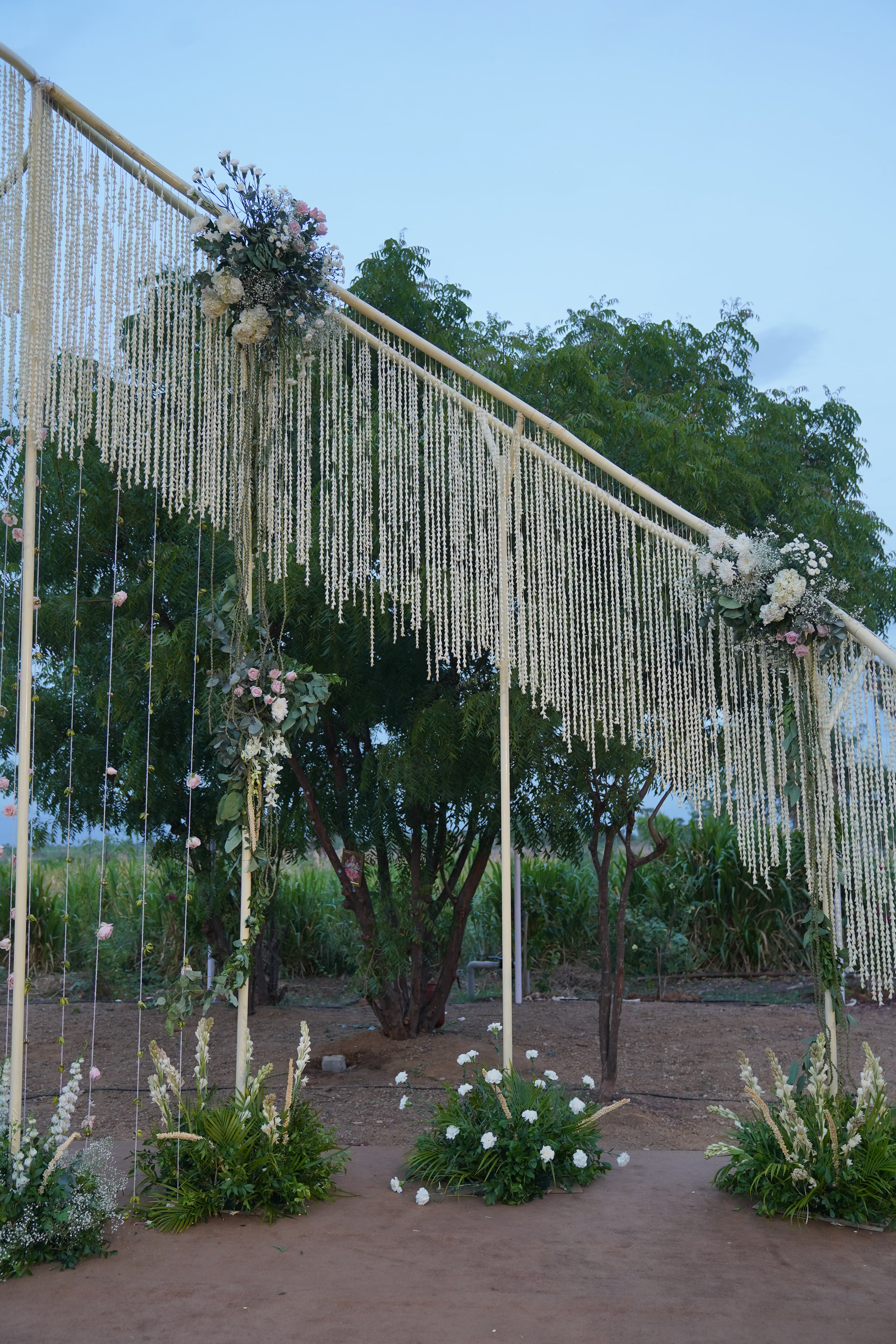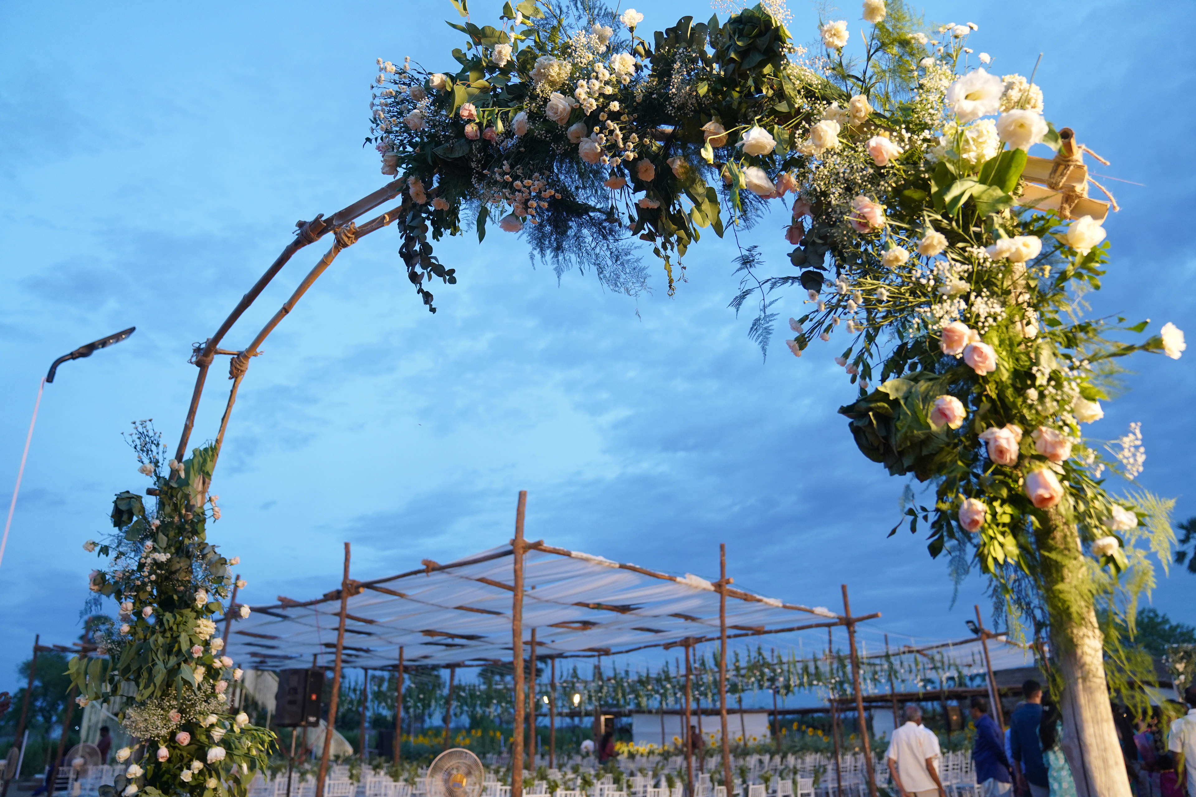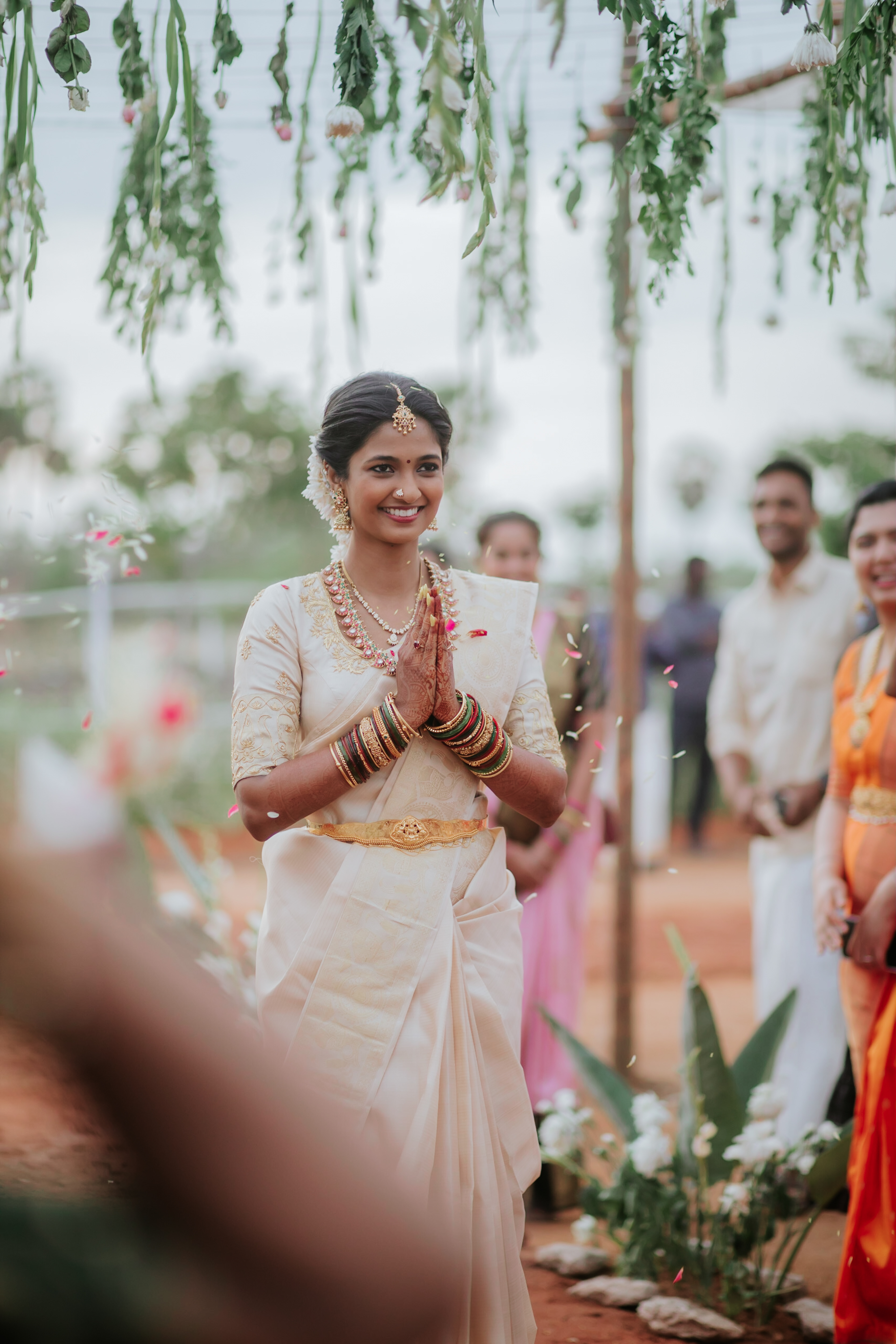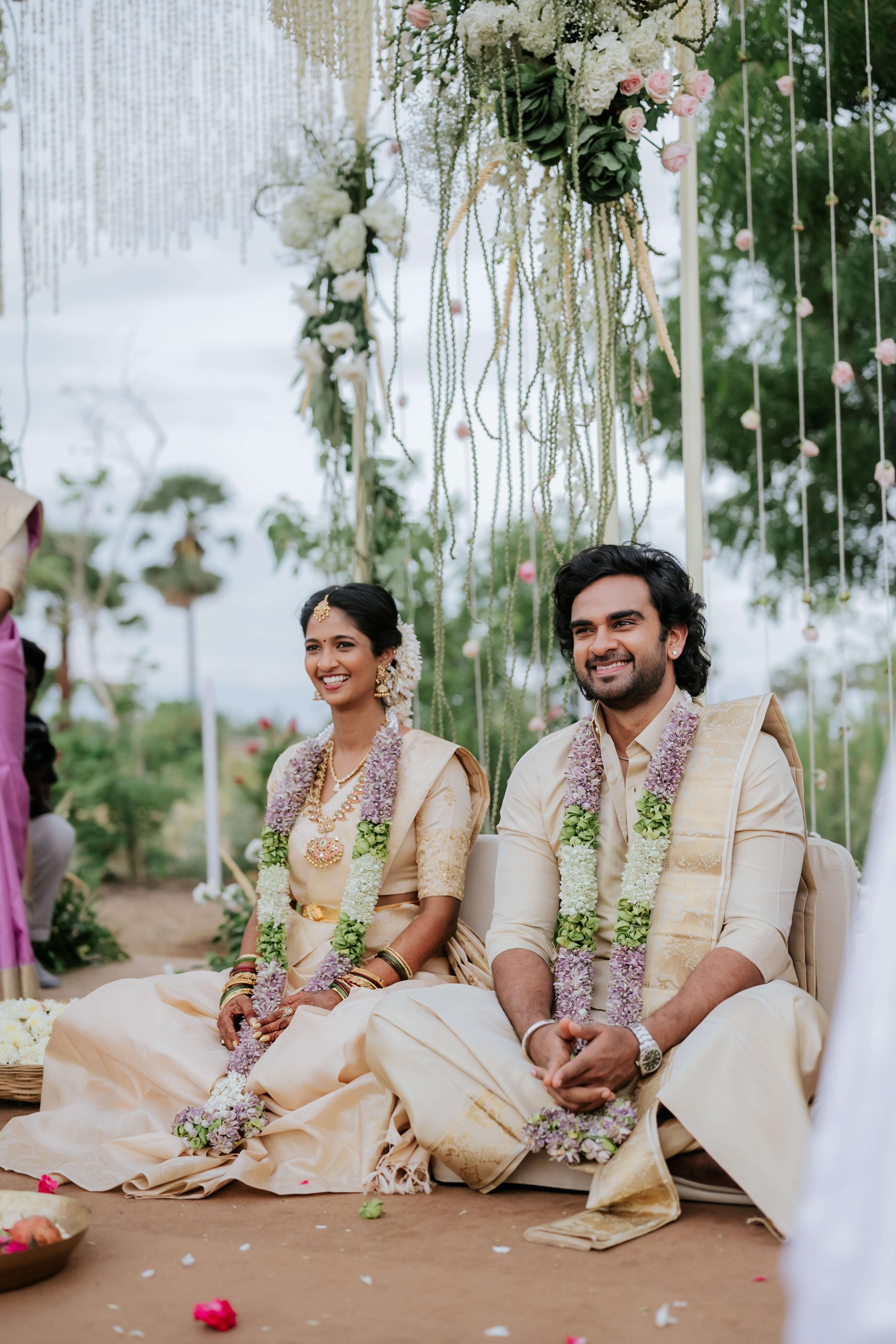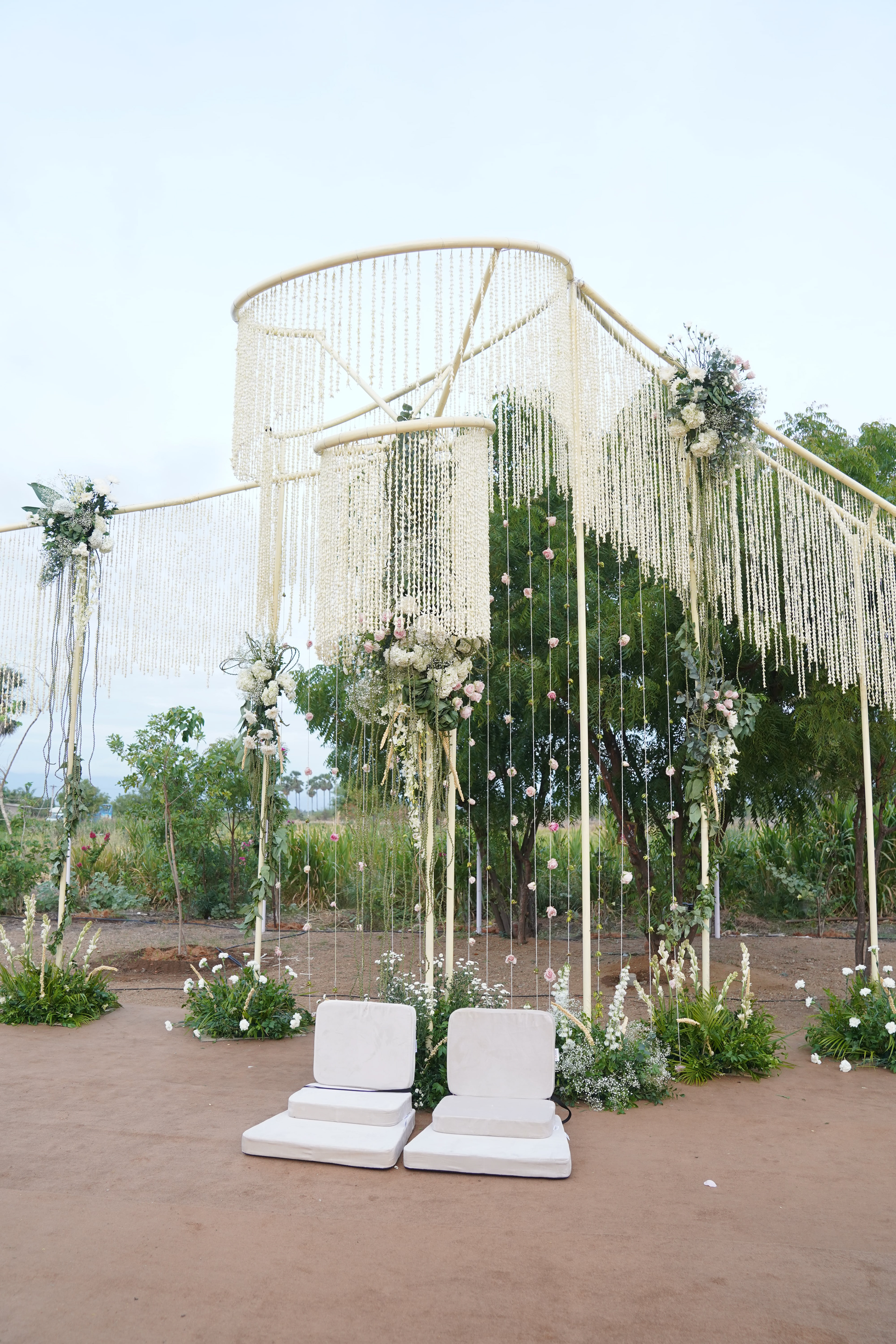 பச்சை வயல்கள் சூழ, பொன்னிற கதிரொளி வாழ்த்த, பூவாசம் மதி மயக்க, கார்கால காற்றோடு காலை விருந்து கட்டி இழுக்க, மெல்லிசையும் புன்னகையும் சேர்ந்து விழாக்கோலமாய் நிகழ்ந்தது Ashok Selvan மற்றும் Keerthipandian திருமணம். We had so much fun curating this beautiful wedding; designing the decor, creating a unique menu and customising the wedding saree.There is something charming about outdoor weddings, and it's even more special when the space is meaningful to you. So when Ashokselvan and Keerthipandian approached us to design their தமிழ் முறை திருமணம் on their farm, set amongst beautiful fields frequented by peacocks, as a celebration that was one with nature, we knew that it was going to be absolutely magical. The decor was designed to connect with the surroundings by using local flowers like manoranjitham and sampangi, semmanu to elevate the aisle, limestone, coconut leaves and hay bales sourced from the farm and small details like salangai bunches to add texture. The stage itself was airy and light, more like a piece of art that enhanced the already stunning backdrop.The decor was designed to connect with the surroundings by using local flowers like manoranjitham and sampangi, semmanu to elevate the aisle, limestone, coconut leaves and hay bales sourced from the farm and small details like salangai bunches to add texture. The stage itself was airy and light, more like a piece of art that enhanced the already stunning backdrop.