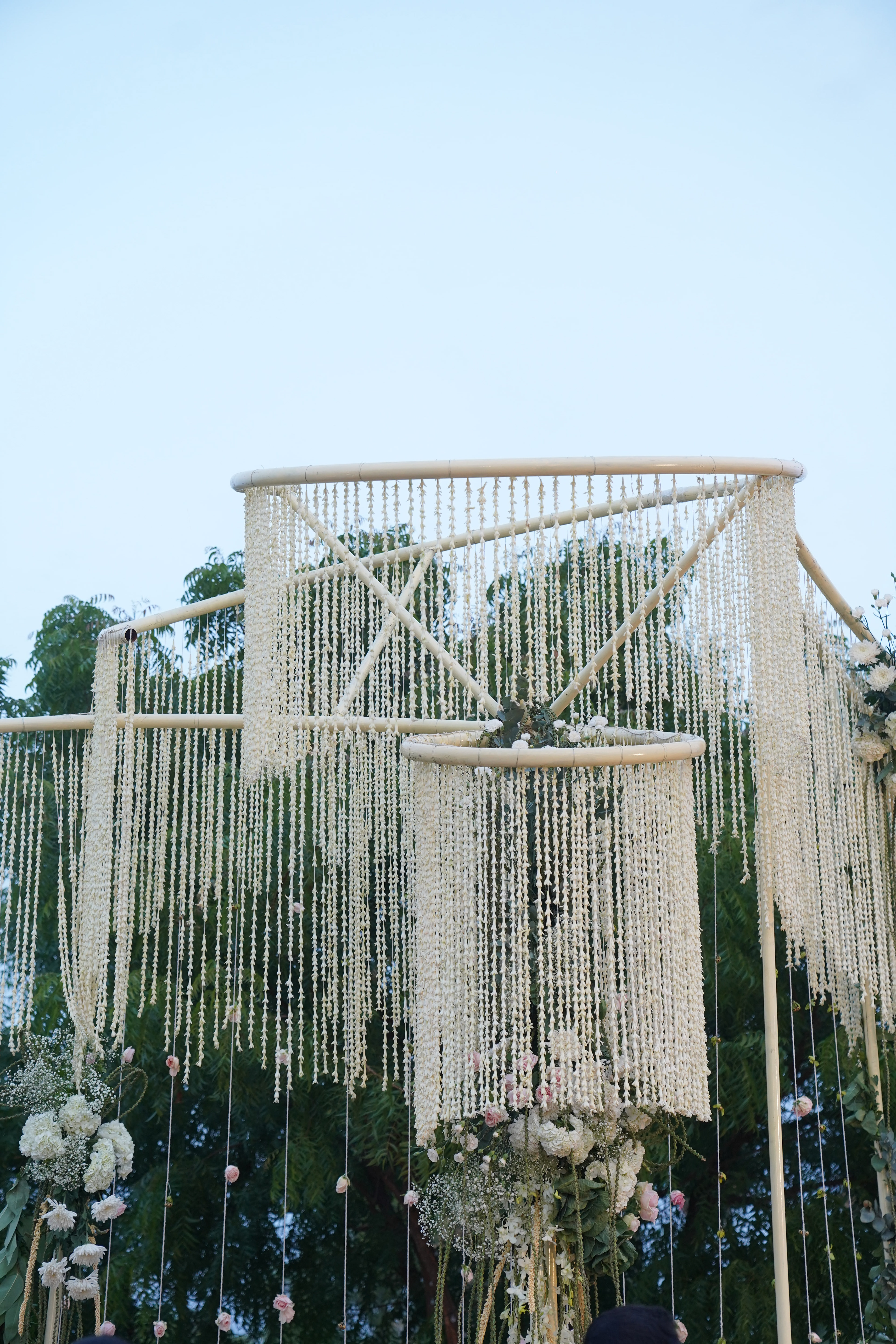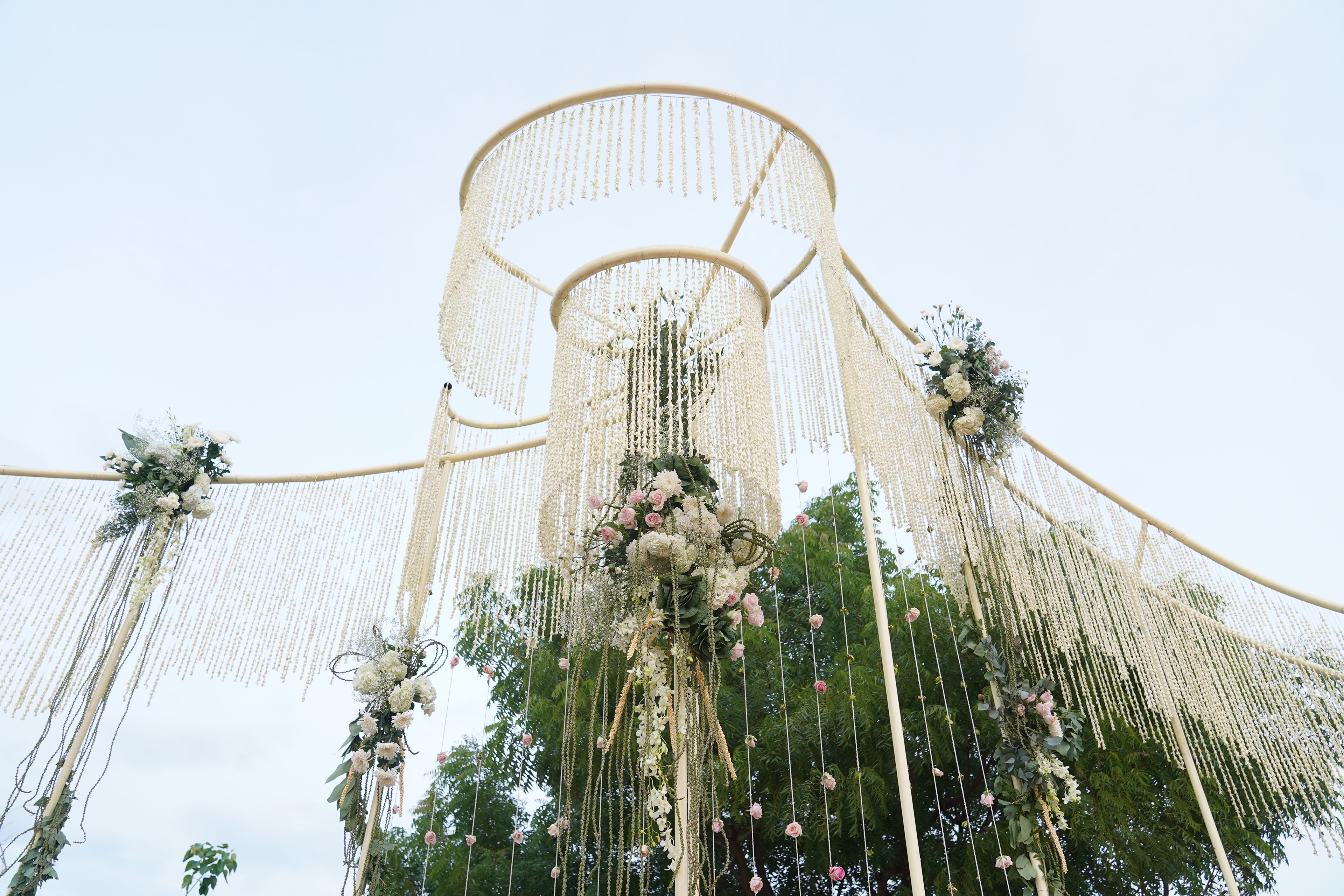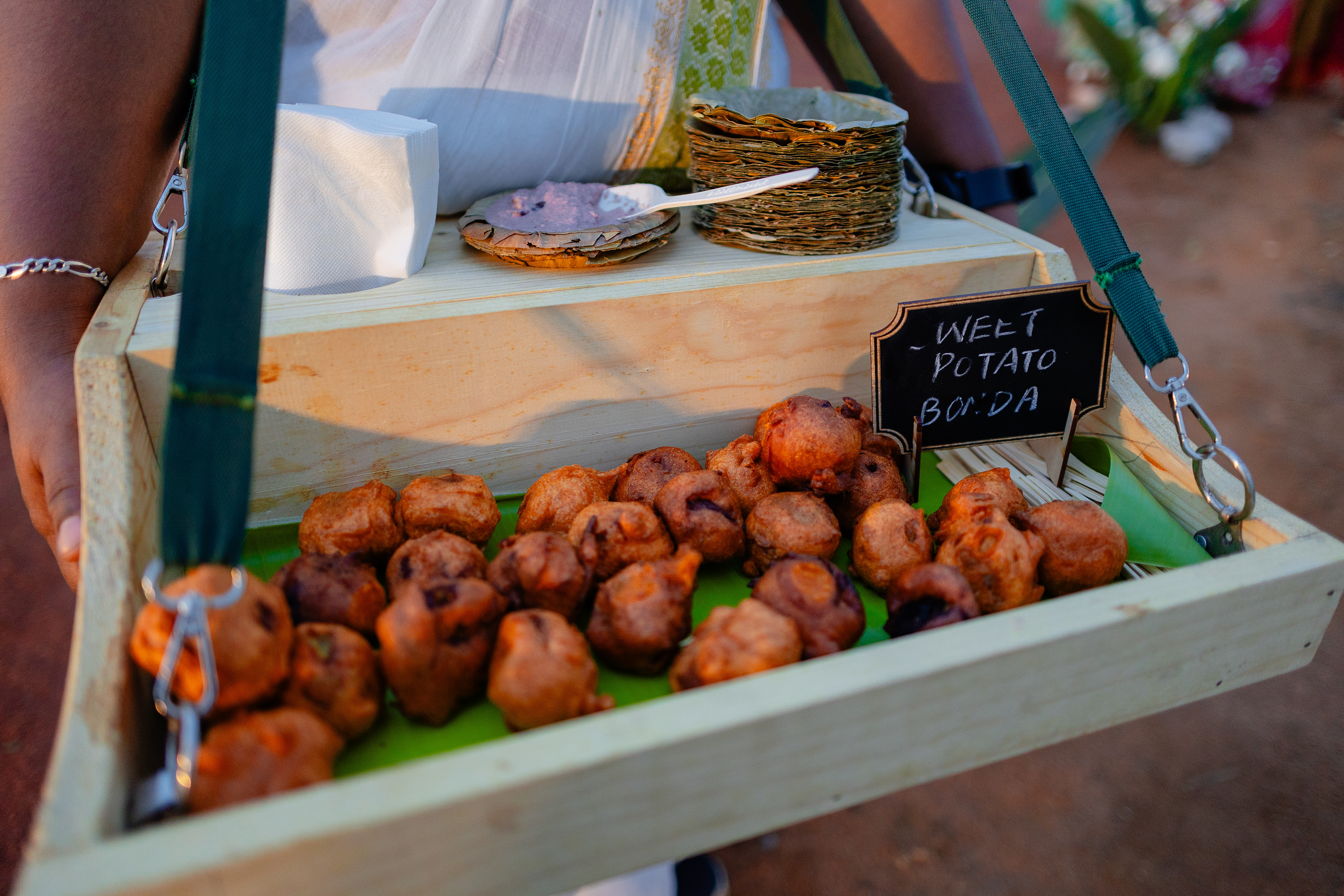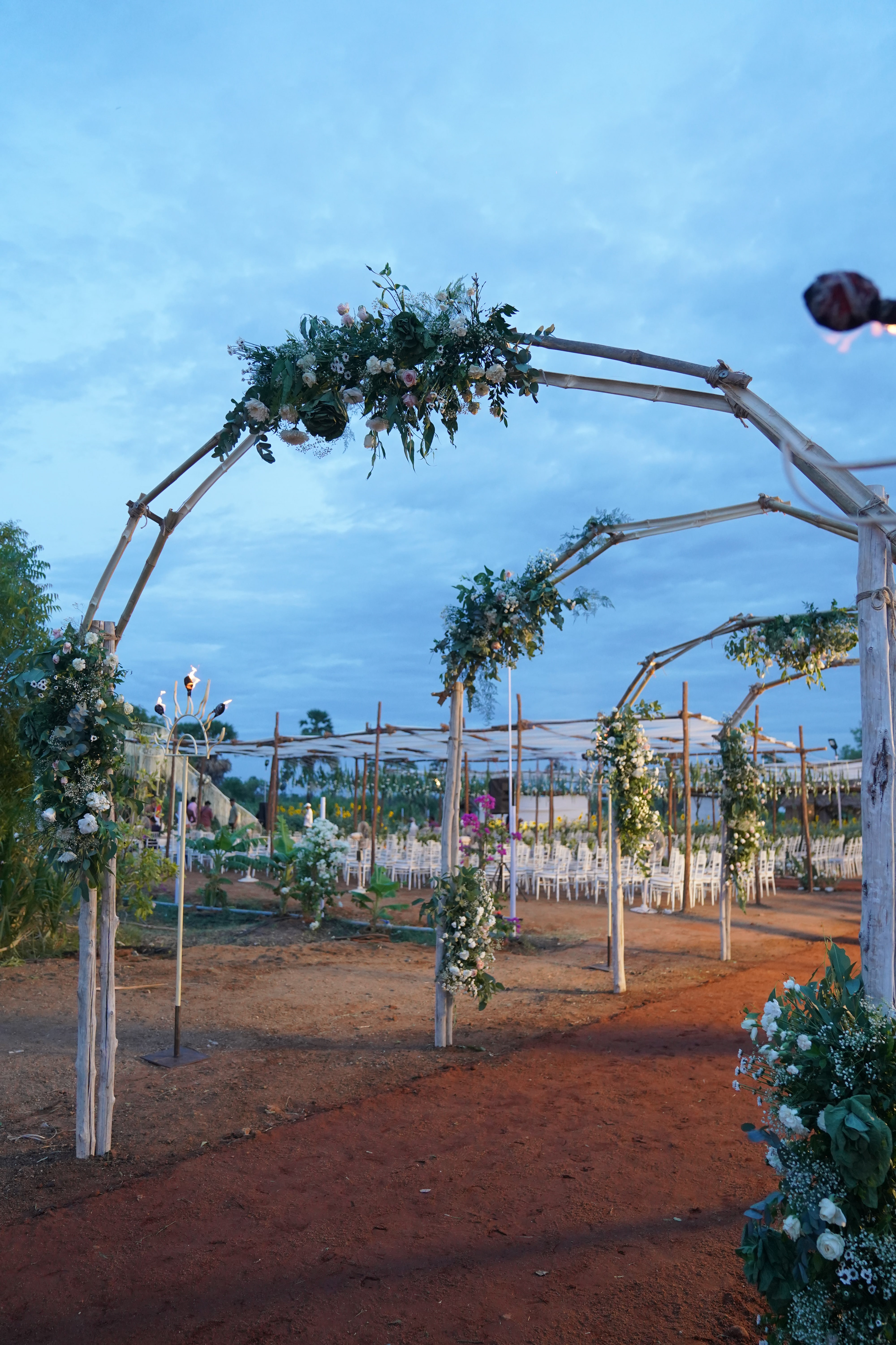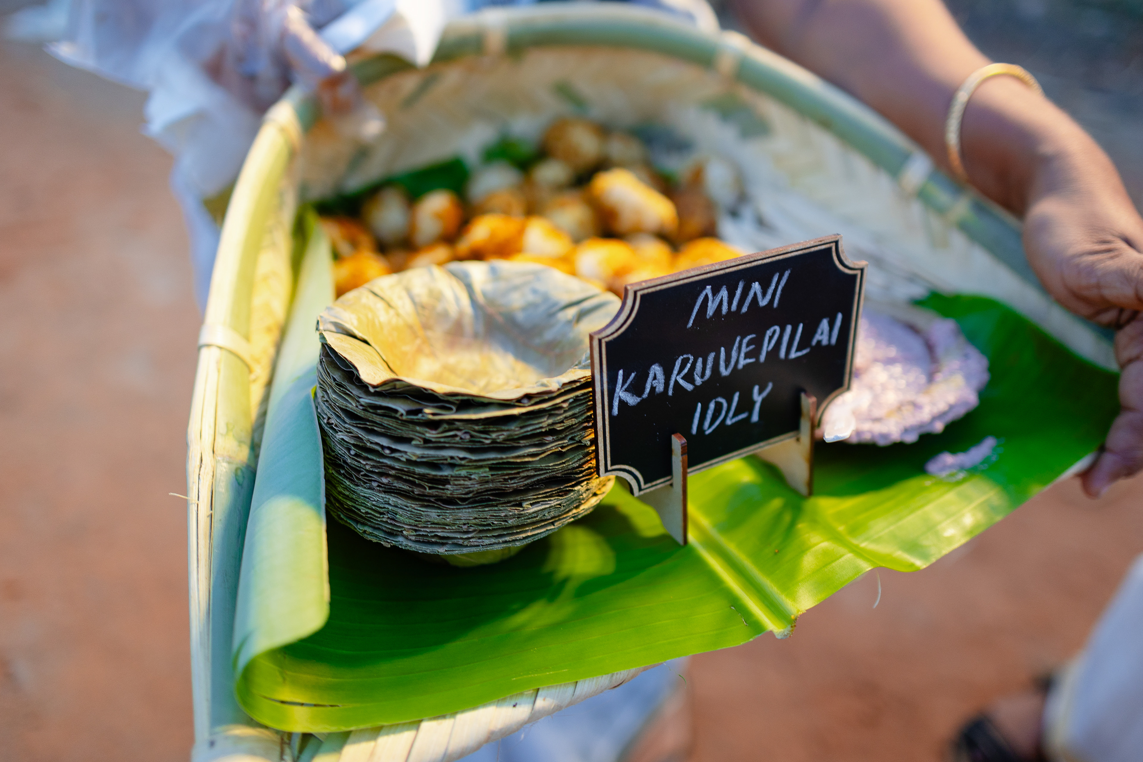 பச்சை வயல்கள் சூழ, பொன்னிற கதிரொளி வாழ்த்த, பூவாசம் மதி மயக்க, கார்கால காற்றோடு காலை விருந்து கட்டி இழுக்க, மெல்லிசையும் புன்னகையும் சேர்ந்து விழாக்கோலமாய் நிகழ்ந்தது Ashok Selvan மற்றும் Keerthipandian திருமணம். We had so much fun curating this beautiful wedding; designing the decor, creating a unique menu and customising the wedding saree.There is something charming about outdoor weddings, and it's even more special when the space is meaningful to you. So when Ashokselvan and Keerthipandian approached us to design their தமிழ் முறை திருமணம் on their farm, set amongst beautiful fields frequented by peacocks, as a celebration that was one with nature, we knew that it was going to be absolutely magical. The decor was designed to connect with the surroundings by using local flowers like manoranjitham and sampangi, semmanu to elevate the aisle, limestone, coconut leaves and hay bales sourced from the farm and small details like salangai bunches to add texture. The stage itself was airy and light, more like a piece of art that enhanced the already stunning backdrop.The decor was designed to connect with the surroundings by using local flowers like manoranjitham and sampangi, semmanu to elevate the aisle, limestone, coconut leaves and hay bales sourced from the farm and small details like salangai bunches to add texture. The stage itself was airy and light, more like a piece of art that enhanced the already stunning backdrop.