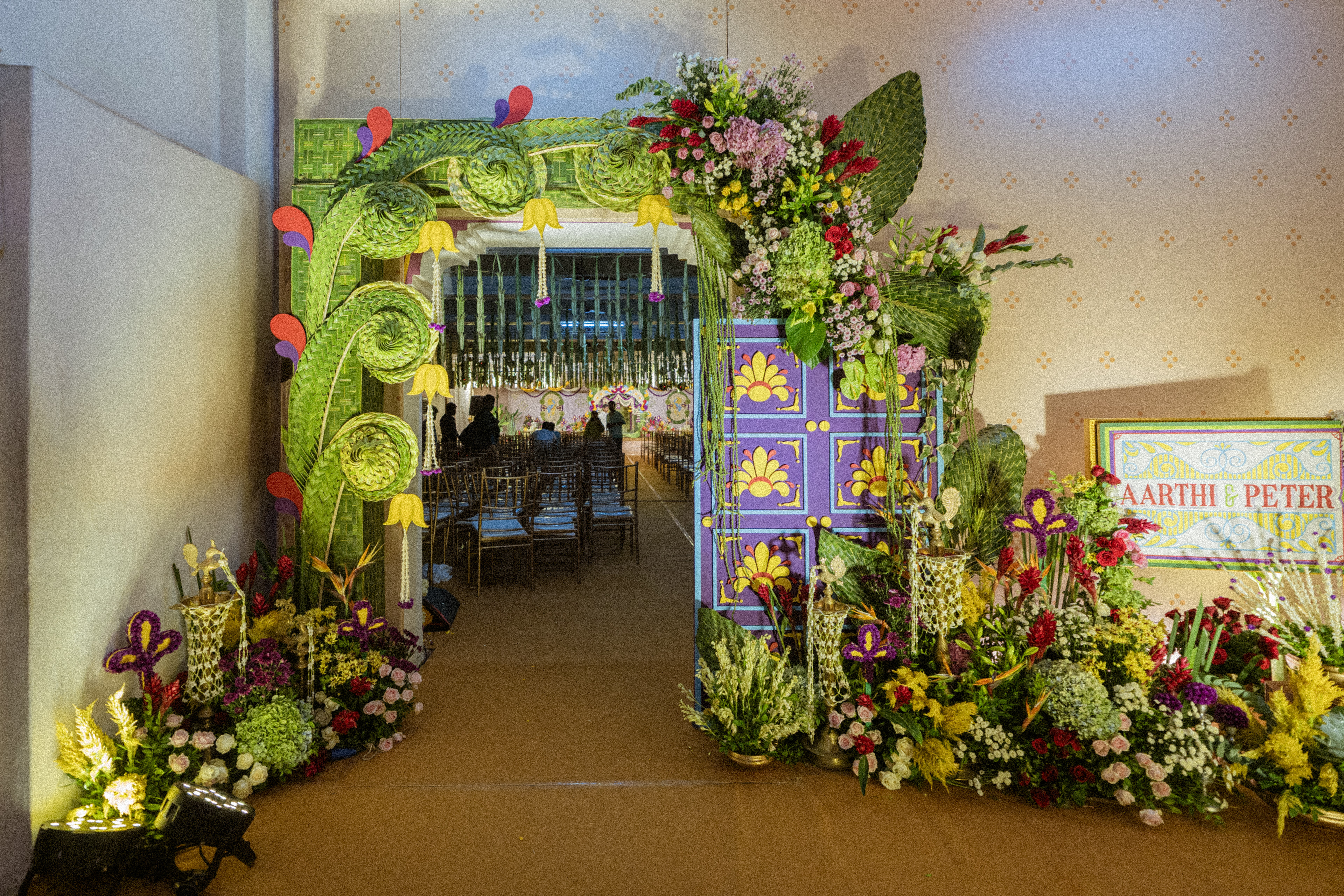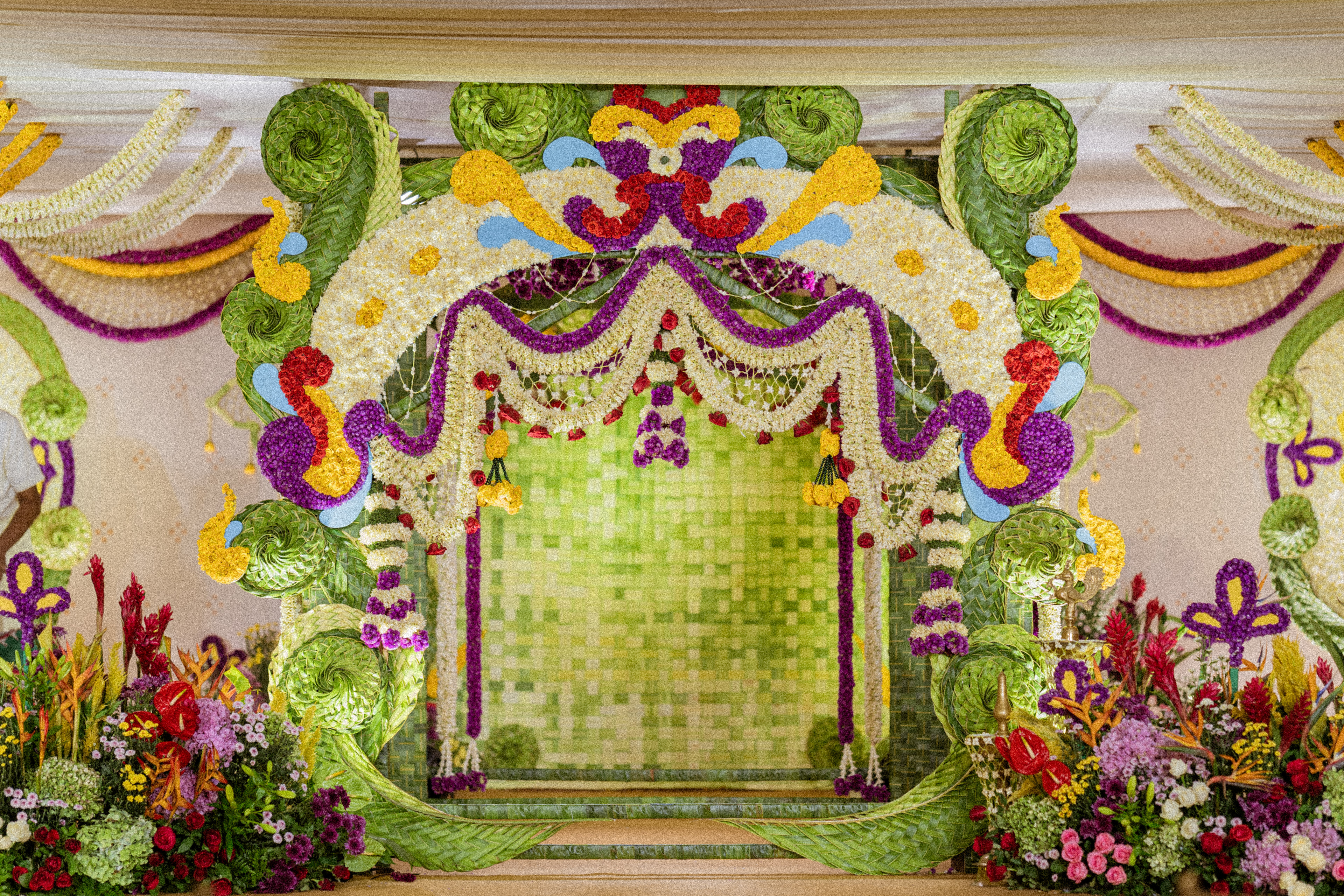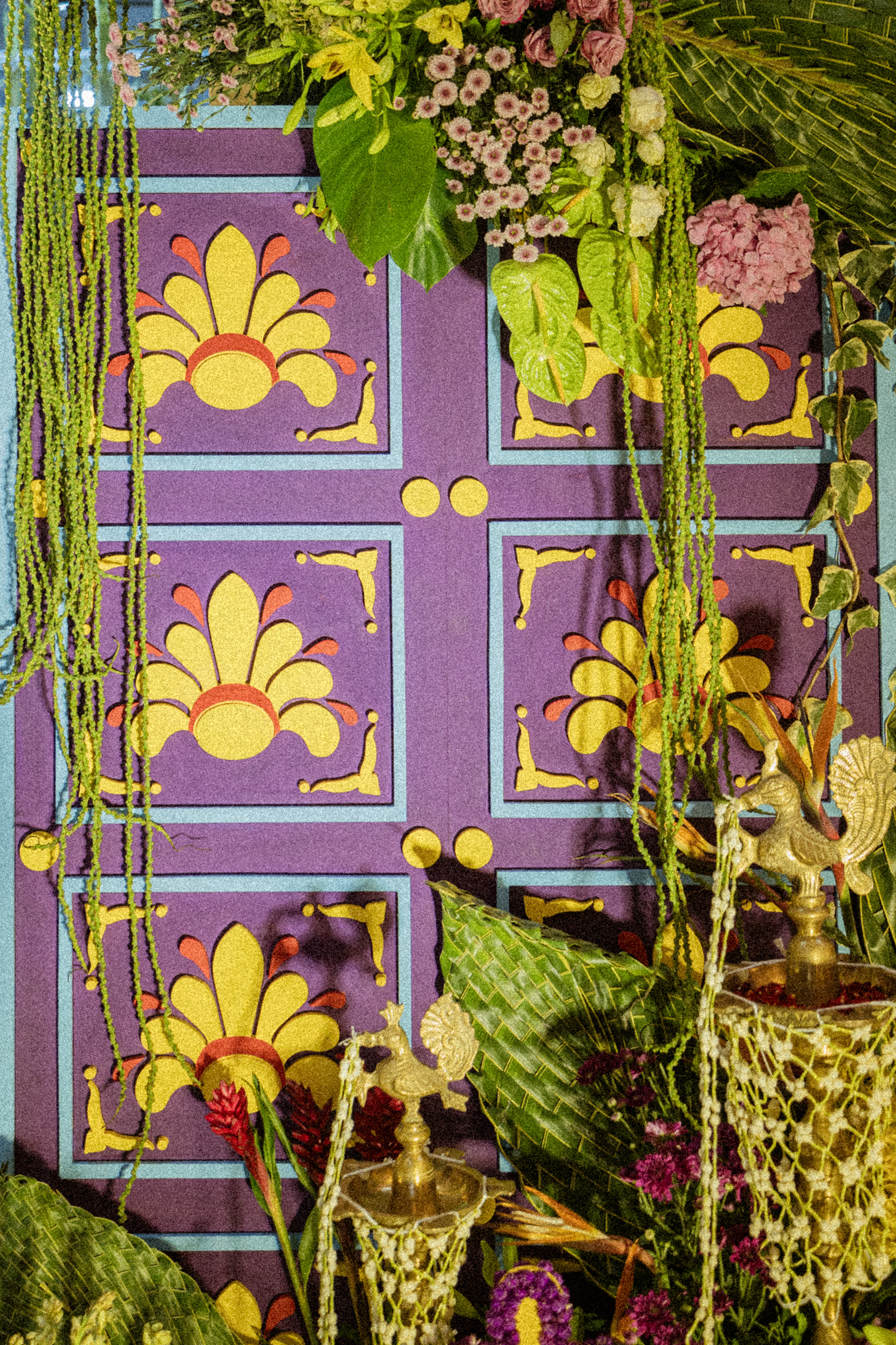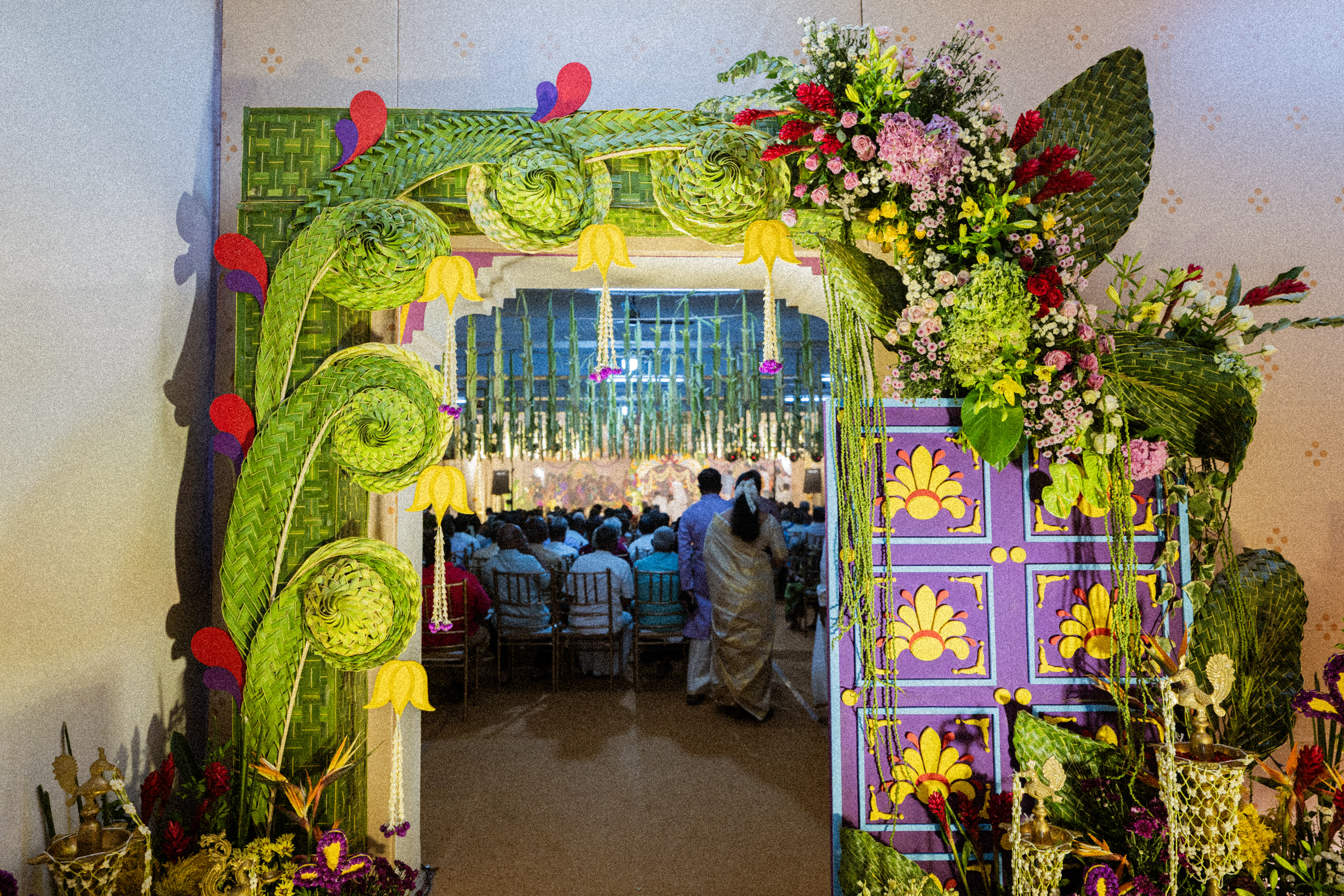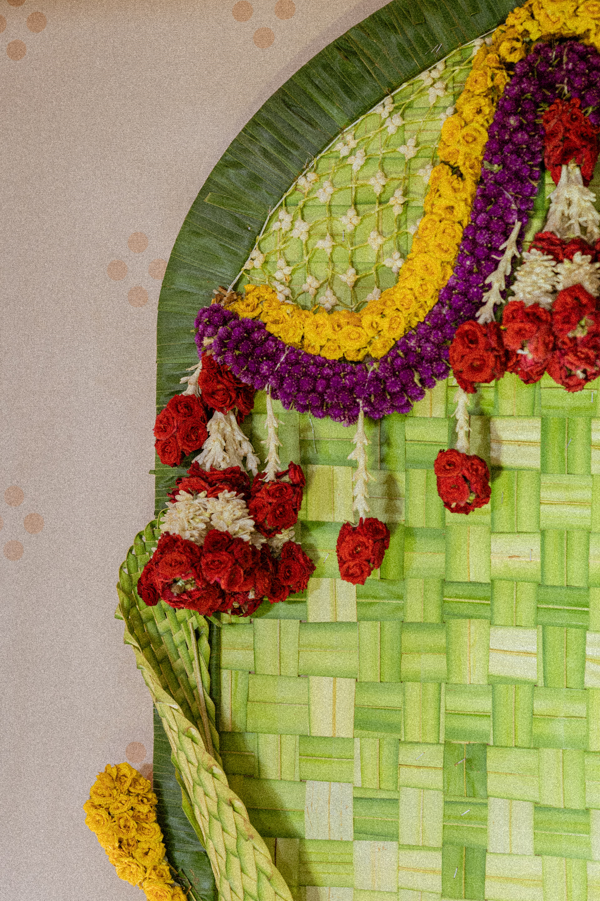 For Aarthi and Peter’s Muhurtham, we journeyed back to the golden era of the 70s and 80s, when South Indian weddings brimmed with quiet beauty, gentle charm, and deeply rooted traditions. At the heart of the celebration stood a mandap inspired by the timeless grace of a prabhavali. It rose gently from a base of lush green olai, adorned with intricate yaazhi motifs and temple-style carvings that curled and flowed like ancient poetry. Each olai swirl was lovingly handmade, an act of devotion that took hours of delicate skill and unwavering patience. These imperfections, these human hands, brought soul into structure, imbuing the space with warmth, memory, and meaning. The rest of the stage remained grounded and intentional, deeply traditional in its presence. A sungudi-inspired fabric backdrop lent colour and texture, while hand-painted temple doors welcomed guests with quiet grandeur. Every detail was imagined to feel familiar and sacred, like a story passed down, whispered gently through generations.