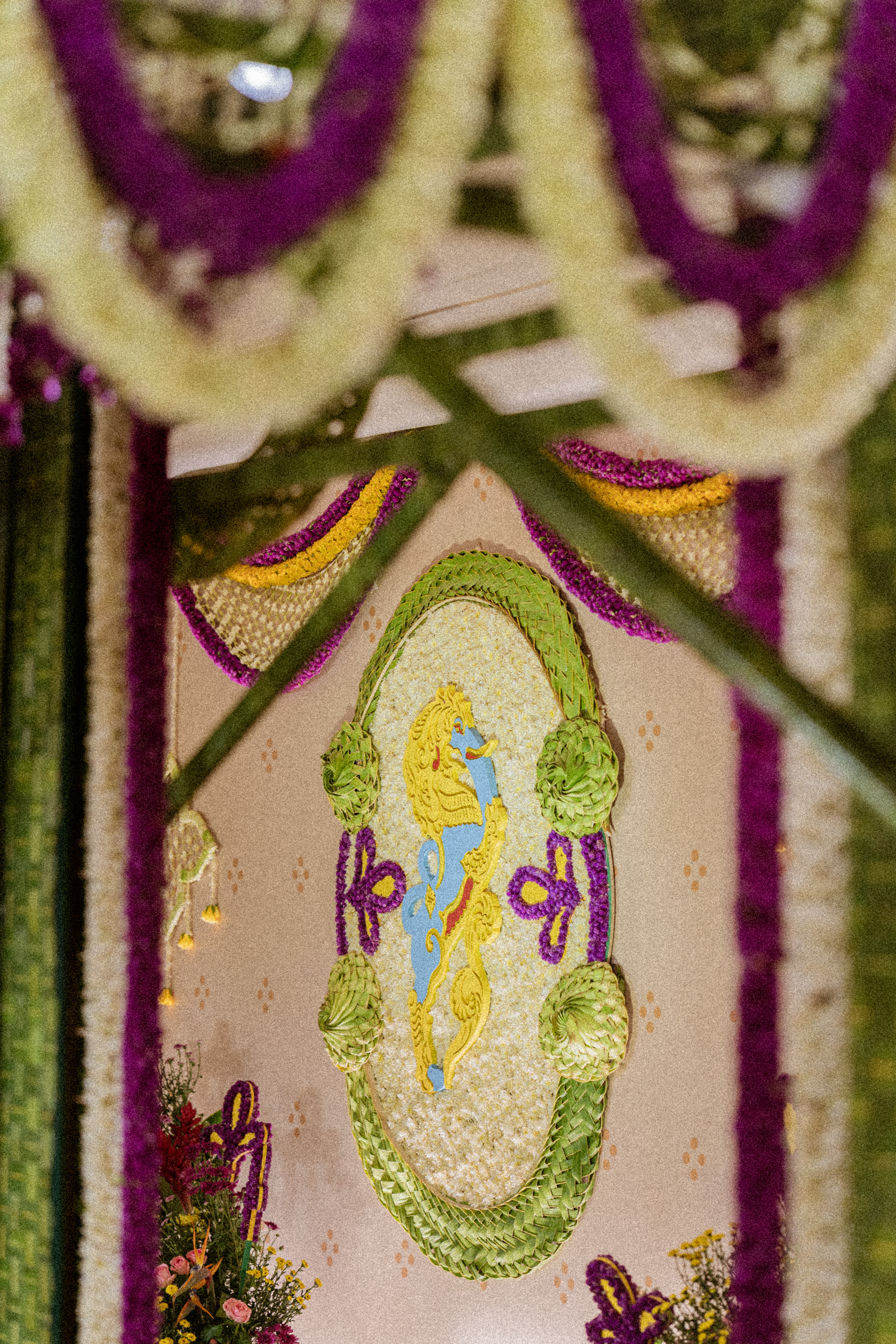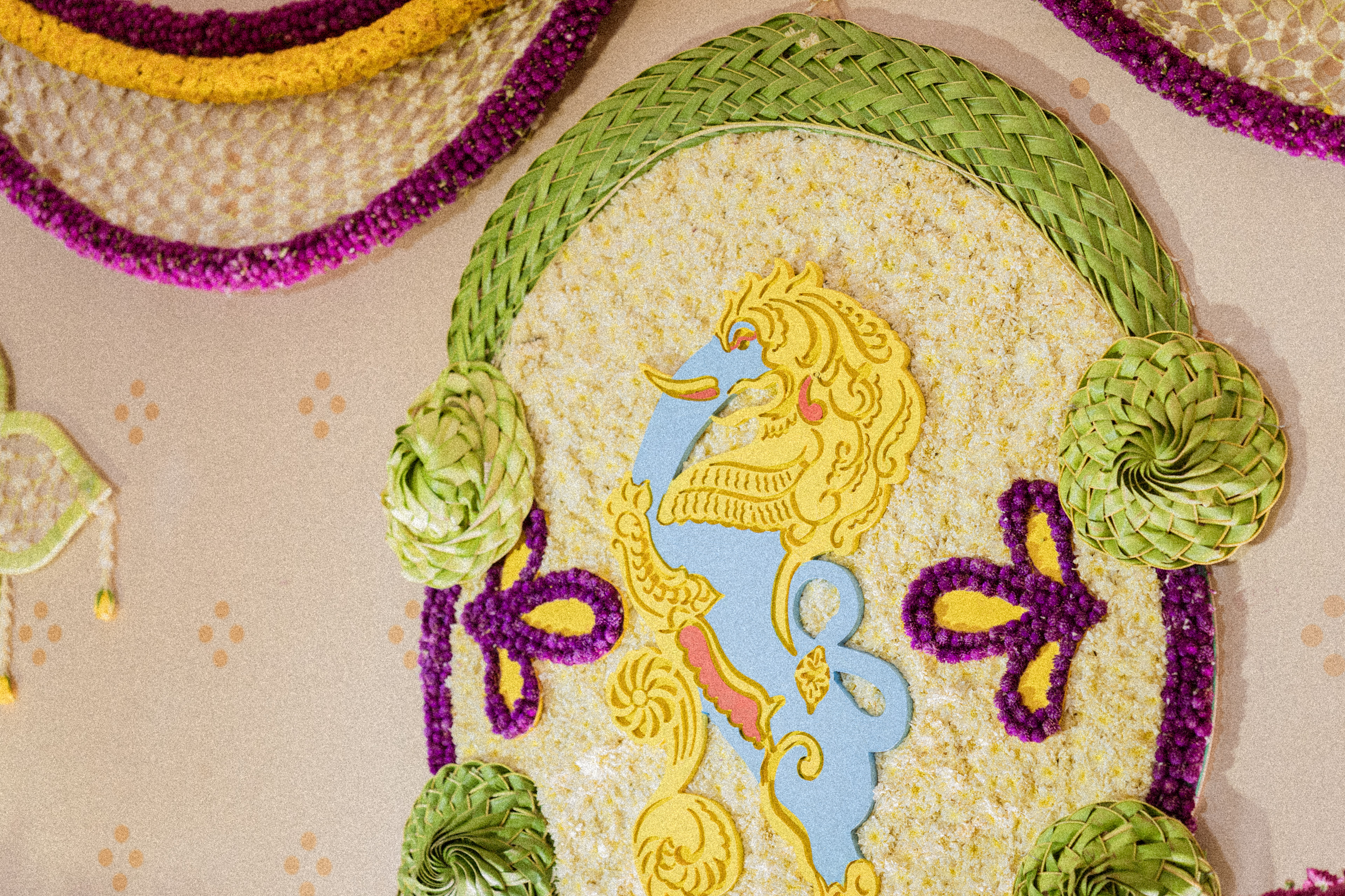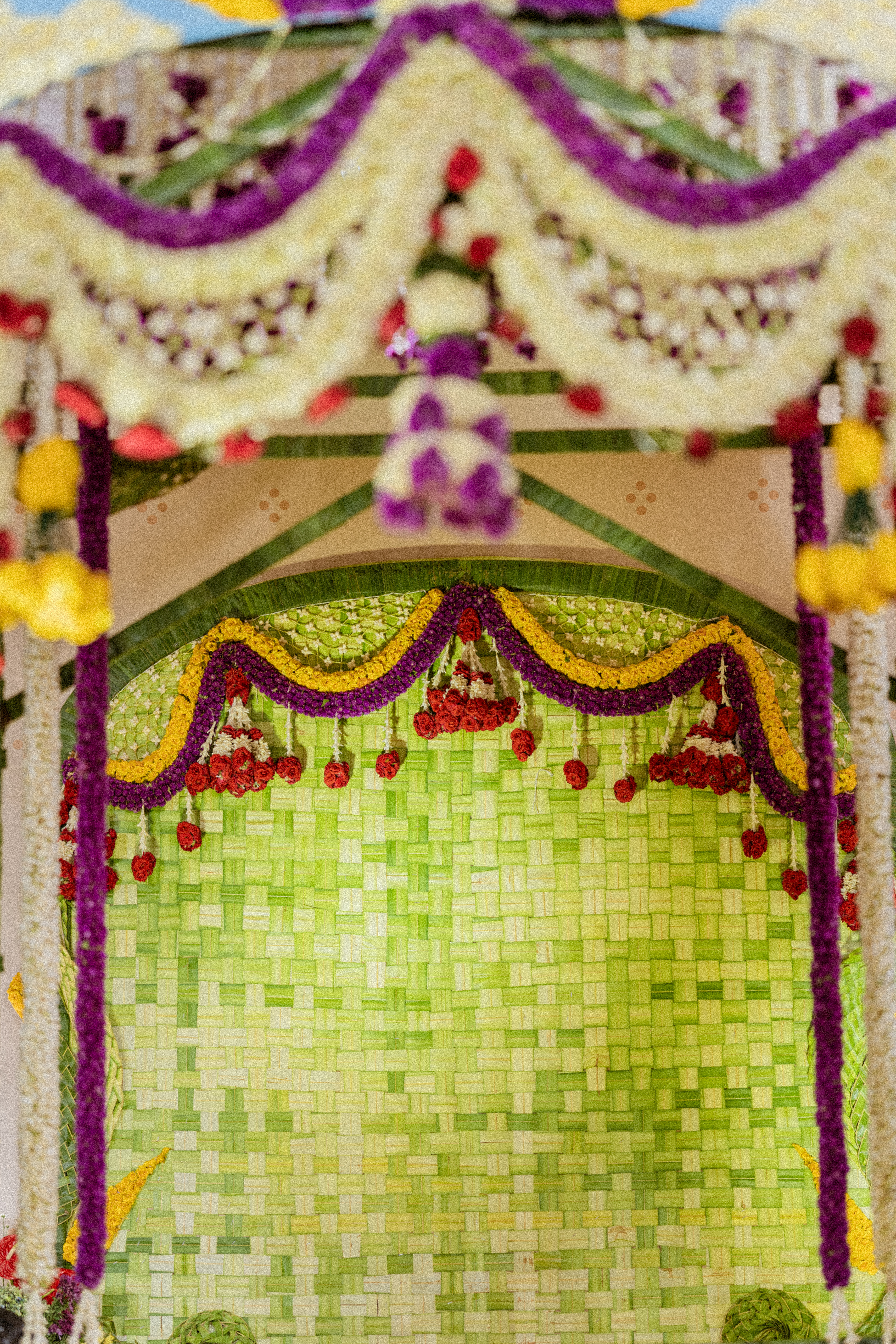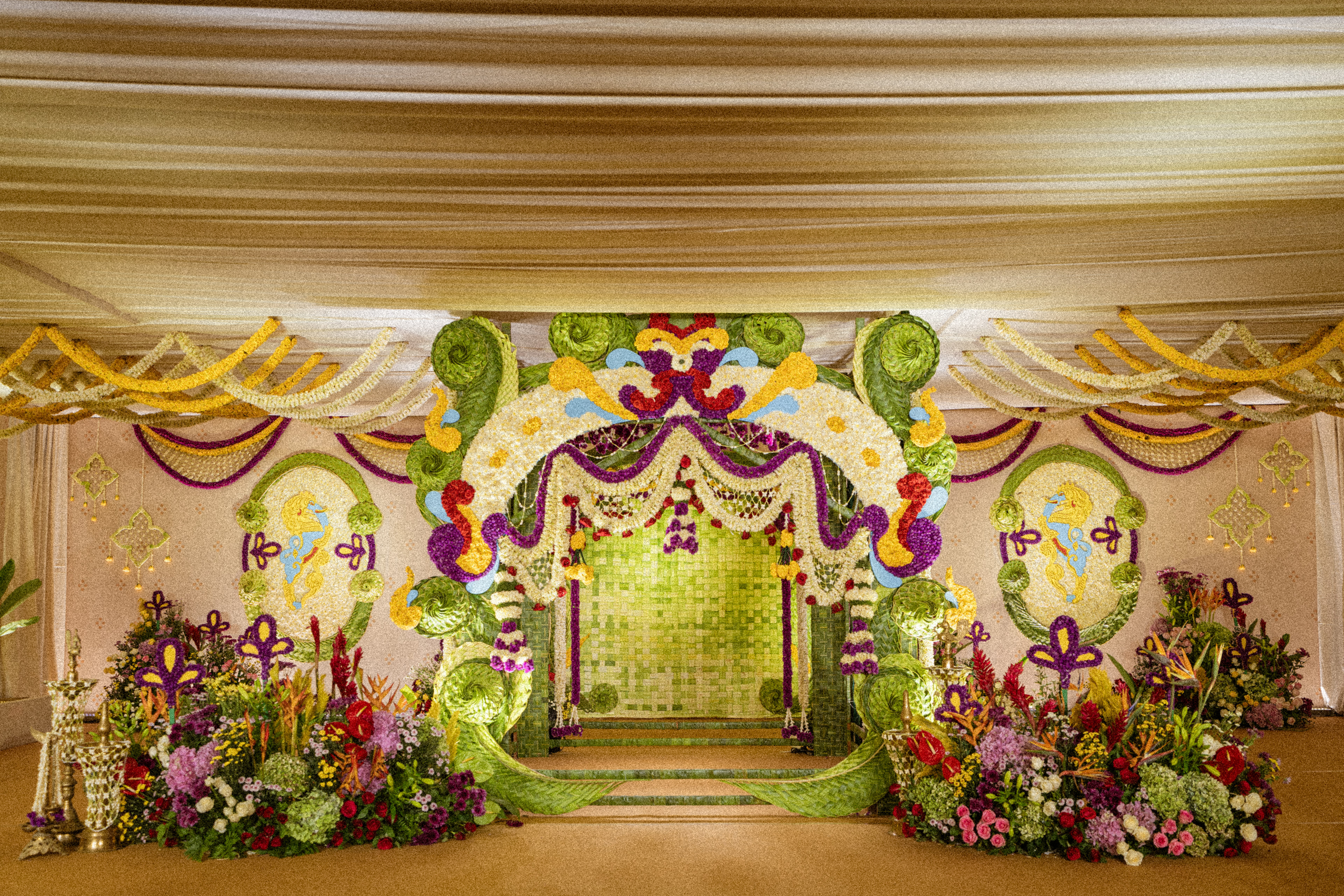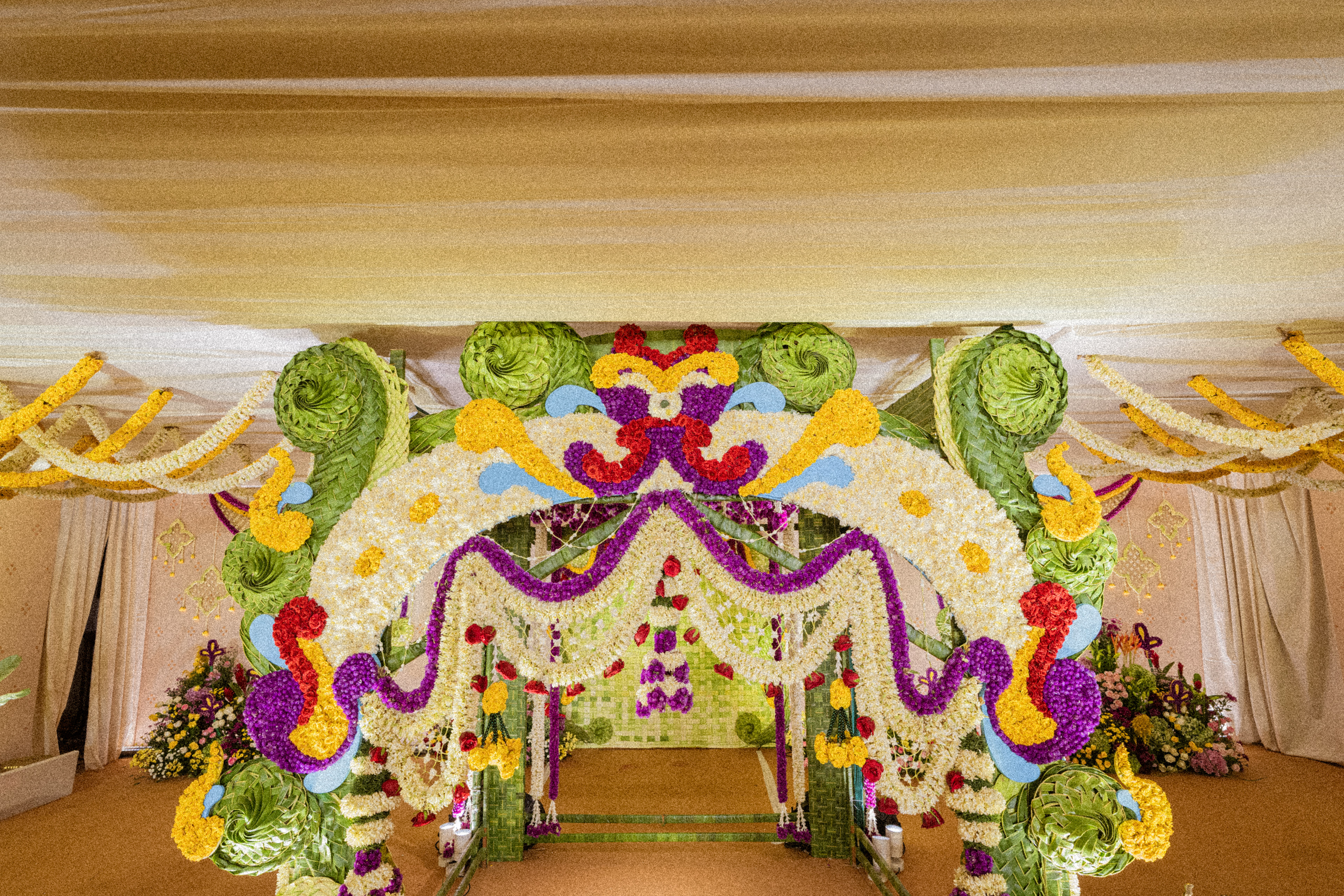 For Aarthi and Peter’s Muhurtham, we journeyed back to the golden era of the 70s and 80s, when South Indian weddings brimmed with quiet beauty, gentle charm, and deeply rooted traditions. At the heart of the celebration stood a mandap inspired by the timeless grace of a prabhavali. It rose gently from a base of lush green olai, adorned with intricate yaazhi motifs and temple-style carvings that curled and flowed like ancient poetry. Each olai swirl was lovingly handmade, an act of devotion that took hours of delicate skill and unwavering patience. These imperfections, these human hands, brought soul into structure, imbuing the space with warmth, memory, and meaning. The rest of the stage remained grounded and intentional, deeply traditional in its presence. A sungudi-inspired fabric backdrop lent colour and texture, while hand-painted temple doors welcomed guests with quiet grandeur. Every detail was imagined to feel familiar and sacred, like a story passed down, whispered gently through generations.