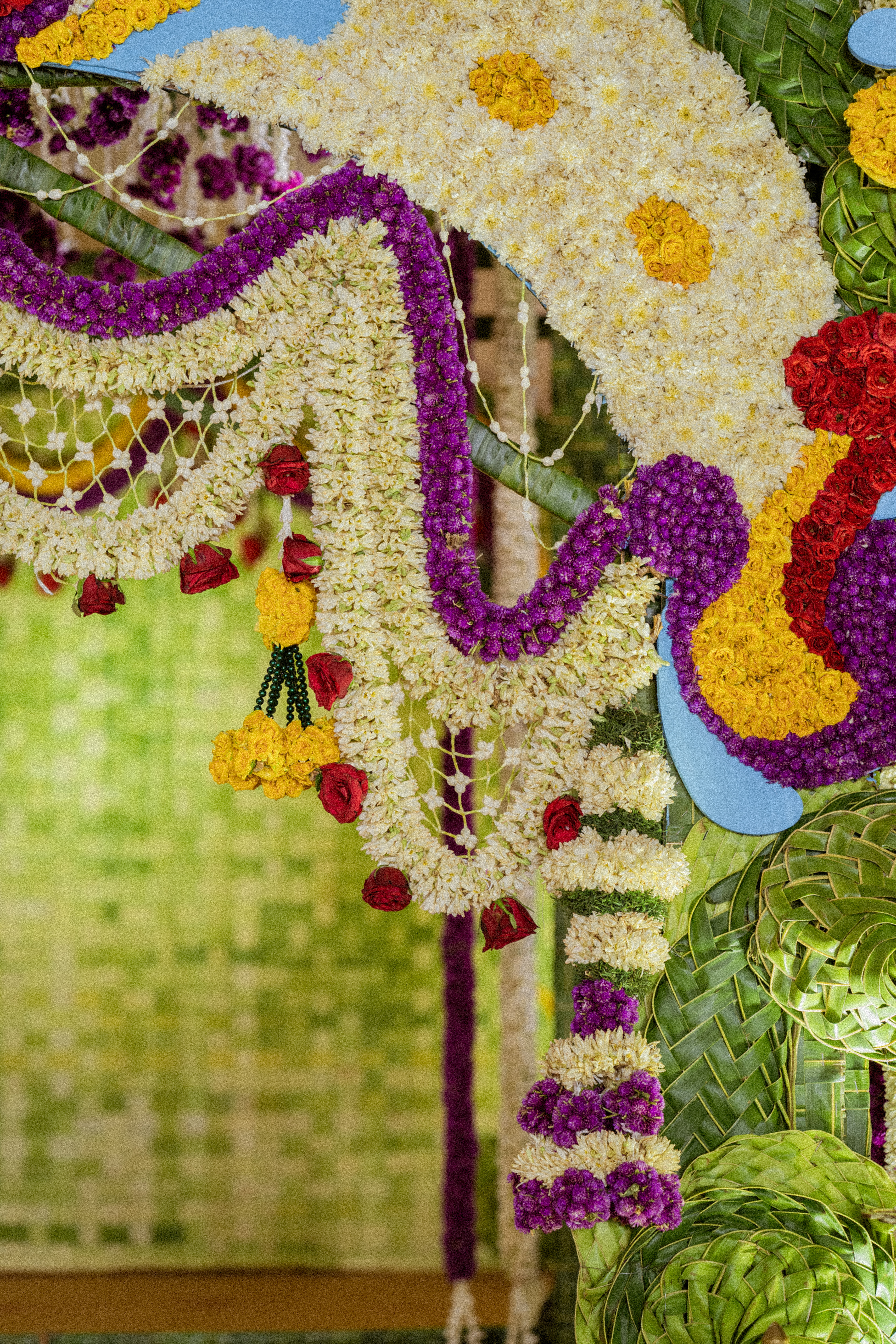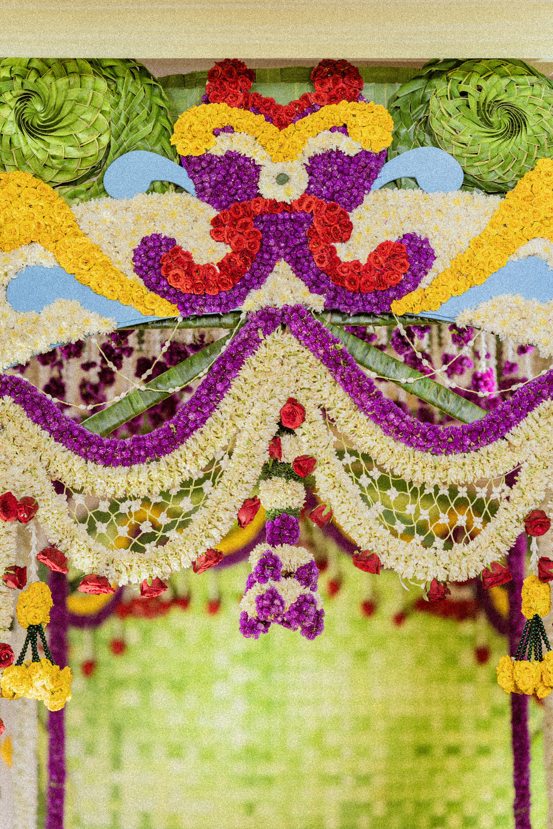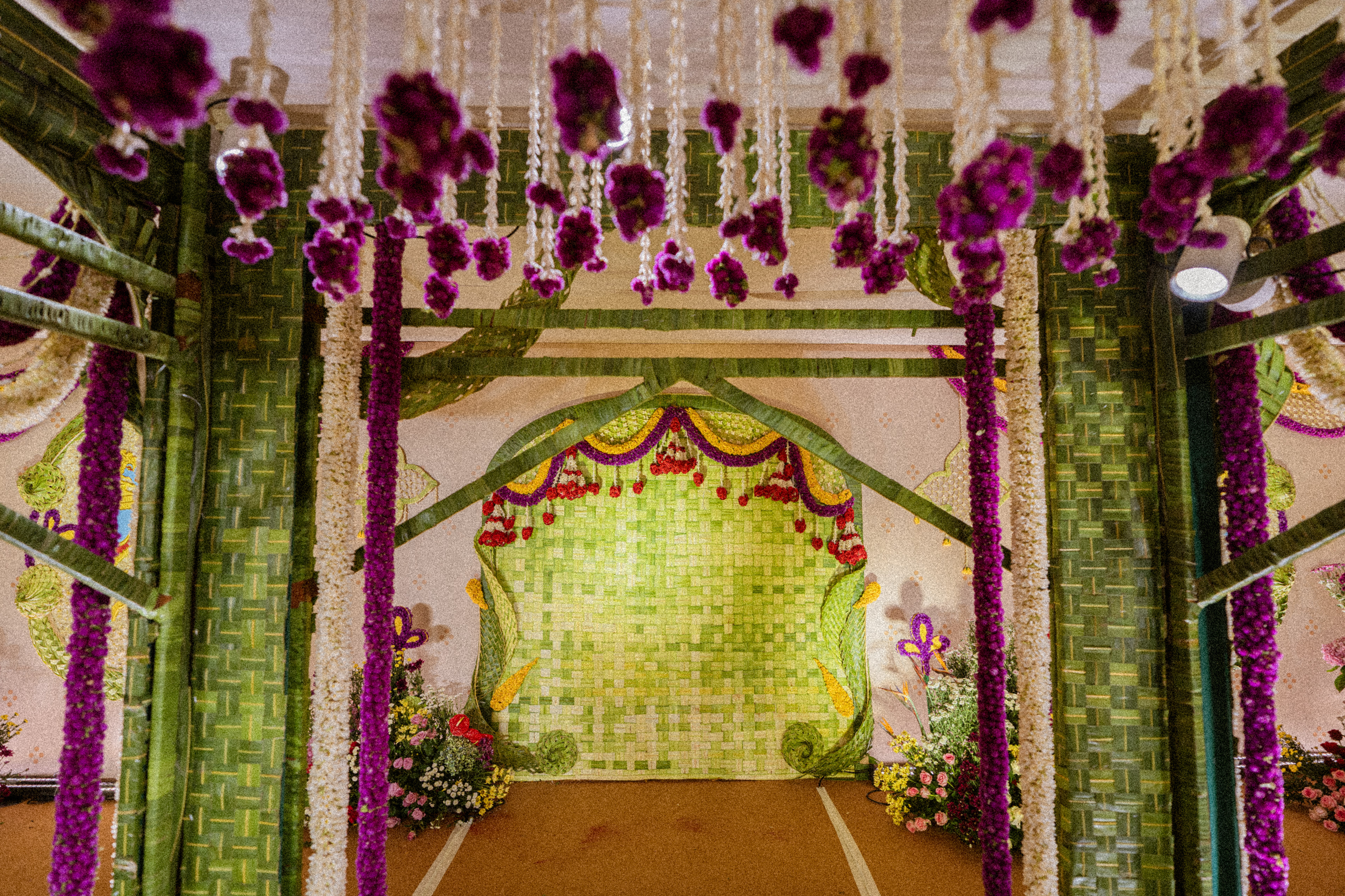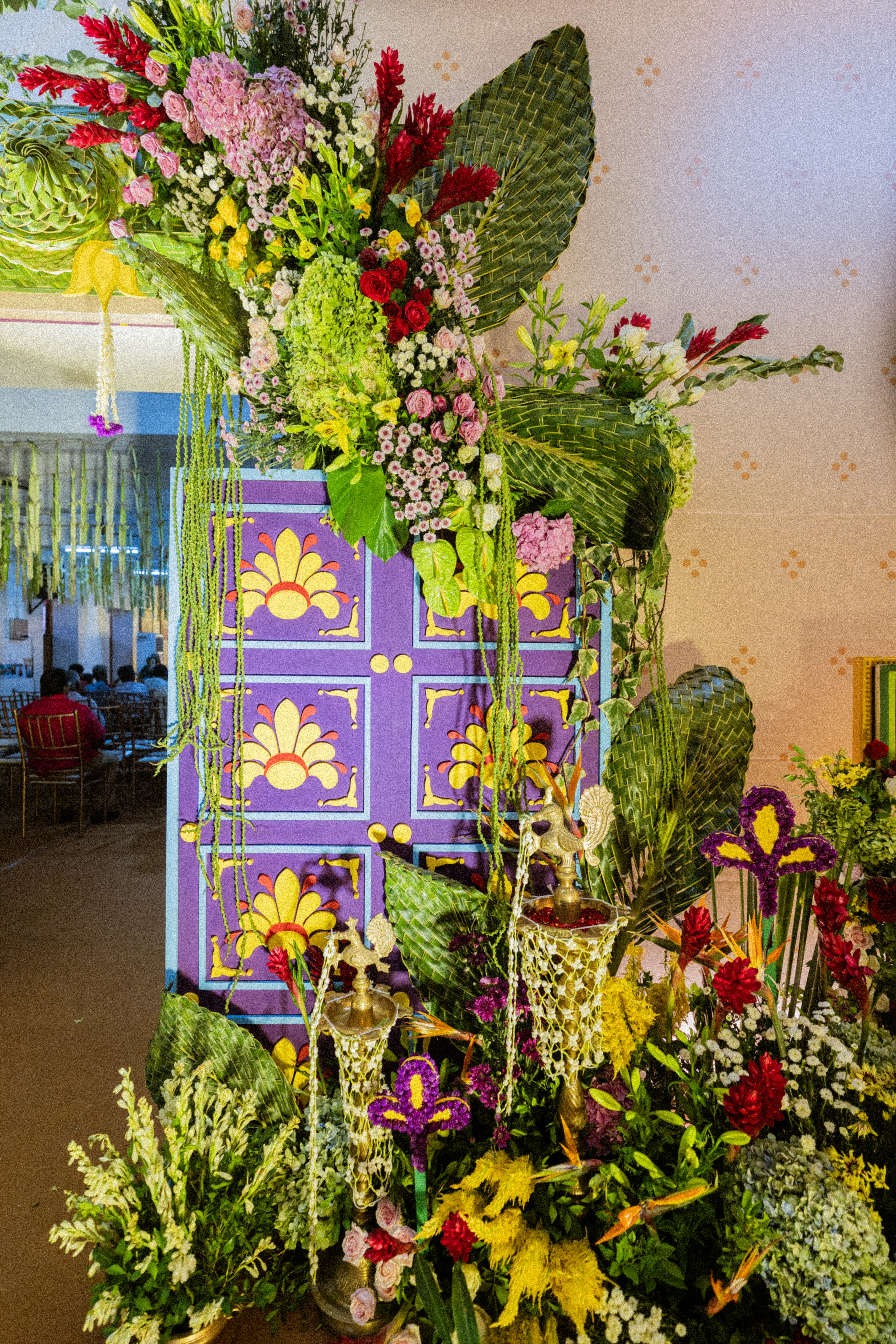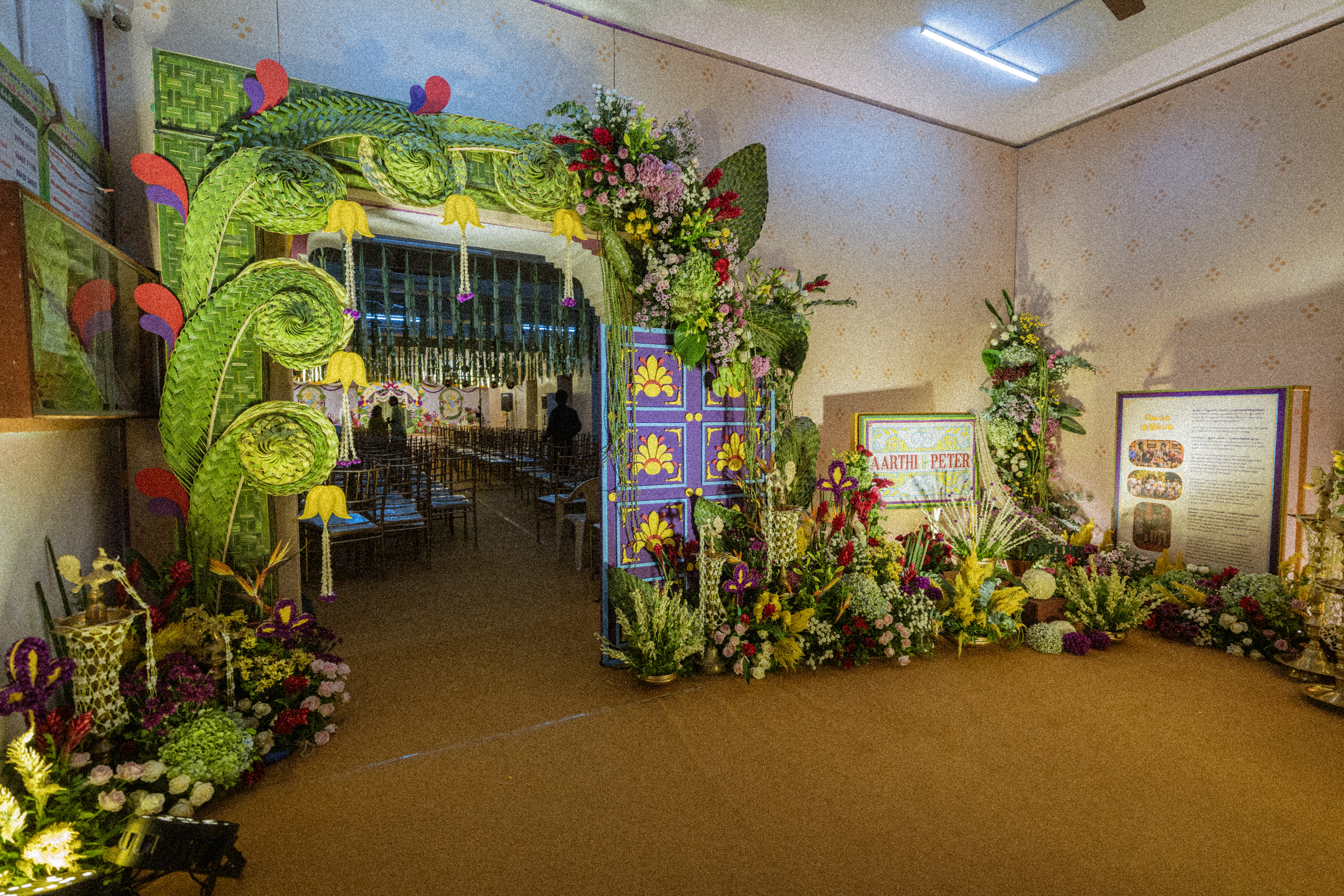 For Aarthi and Peter’s Muhurtham, we journeyed back to the golden era of the 70s and 80s, when South Indian weddings brimmed with quiet beauty, gentle charm, and deeply rooted traditions. At the heart of the celebration stood a mandap inspired by the timeless grace of a prabhavali. It rose gently from a base of lush green olai, adorned with intricate yaazhi motifs and temple-style carvings that curled and flowed like ancient poetry. Each olai swirl was lovingly handmade, an act of devotion that took hours of delicate skill and unwavering patience. These imperfections, these human hands, brought soul into structure, imbuing the space with warmth, memory, and meaning. The rest of the stage remained grounded and intentional, deeply traditional in its presence. A sungudi-inspired fabric backdrop lent colour and texture, while hand-painted temple doors welcomed guests with quiet grandeur. Every detail was imagined to feel familiar and sacred, like a story passed down, whispered gently through generations.