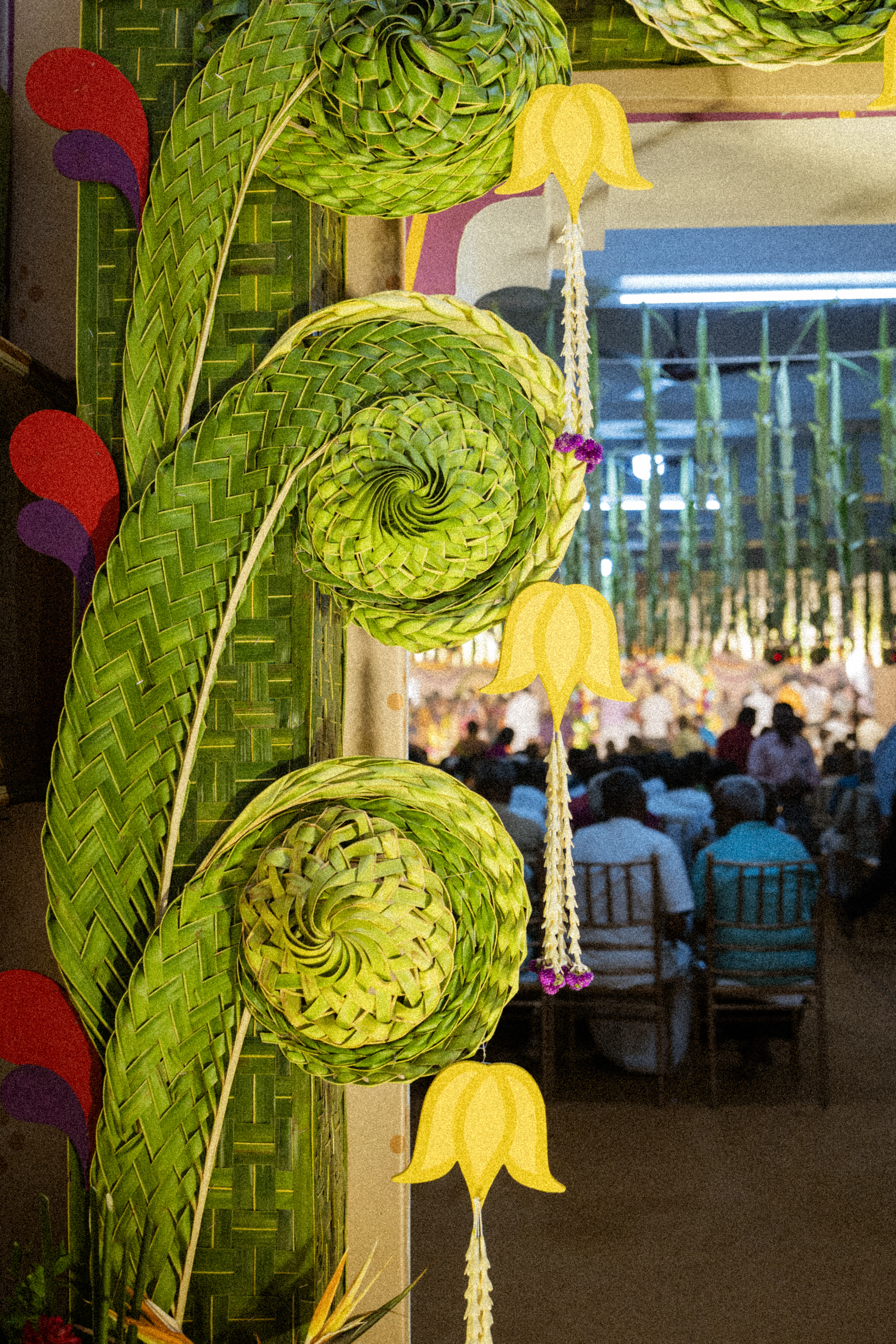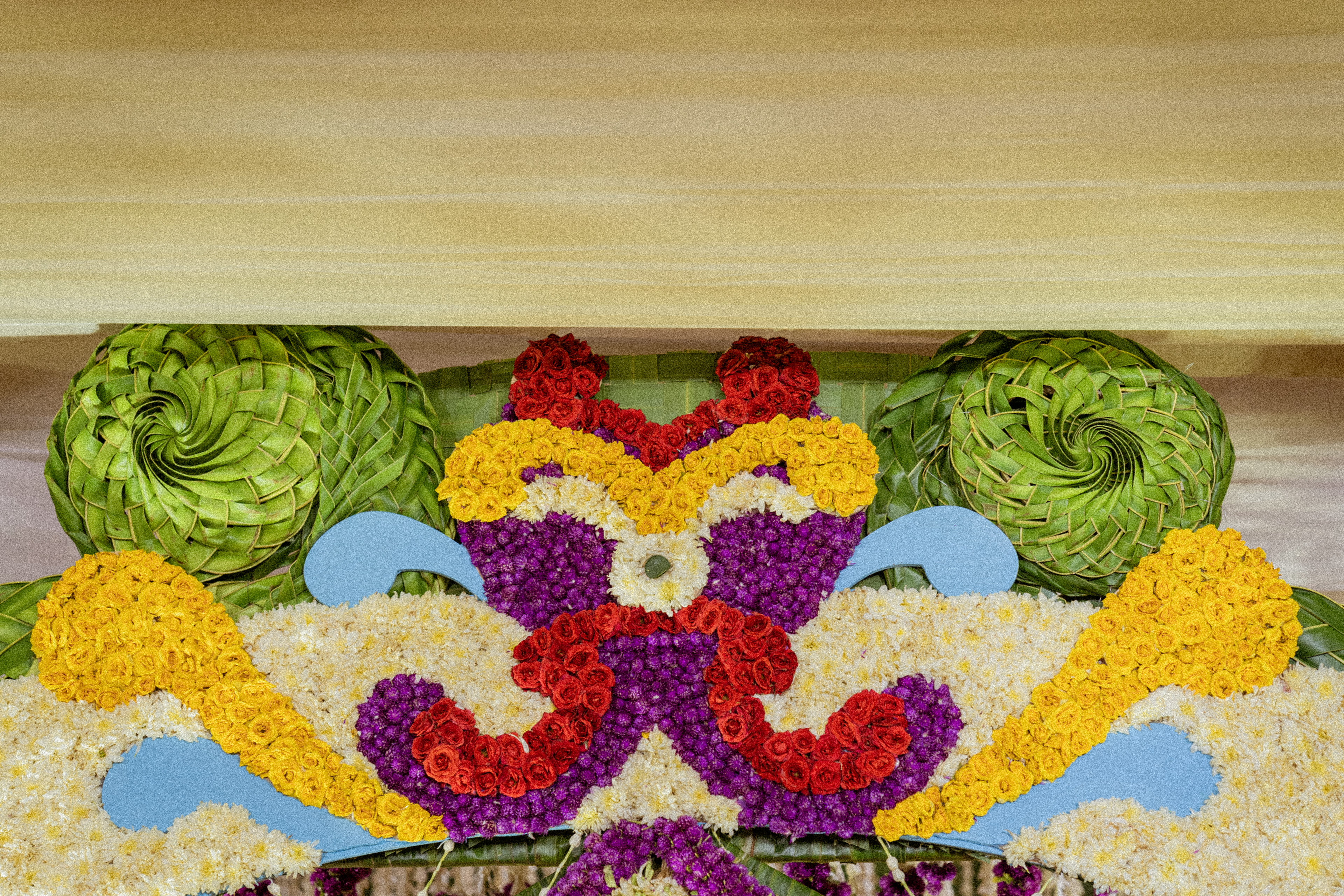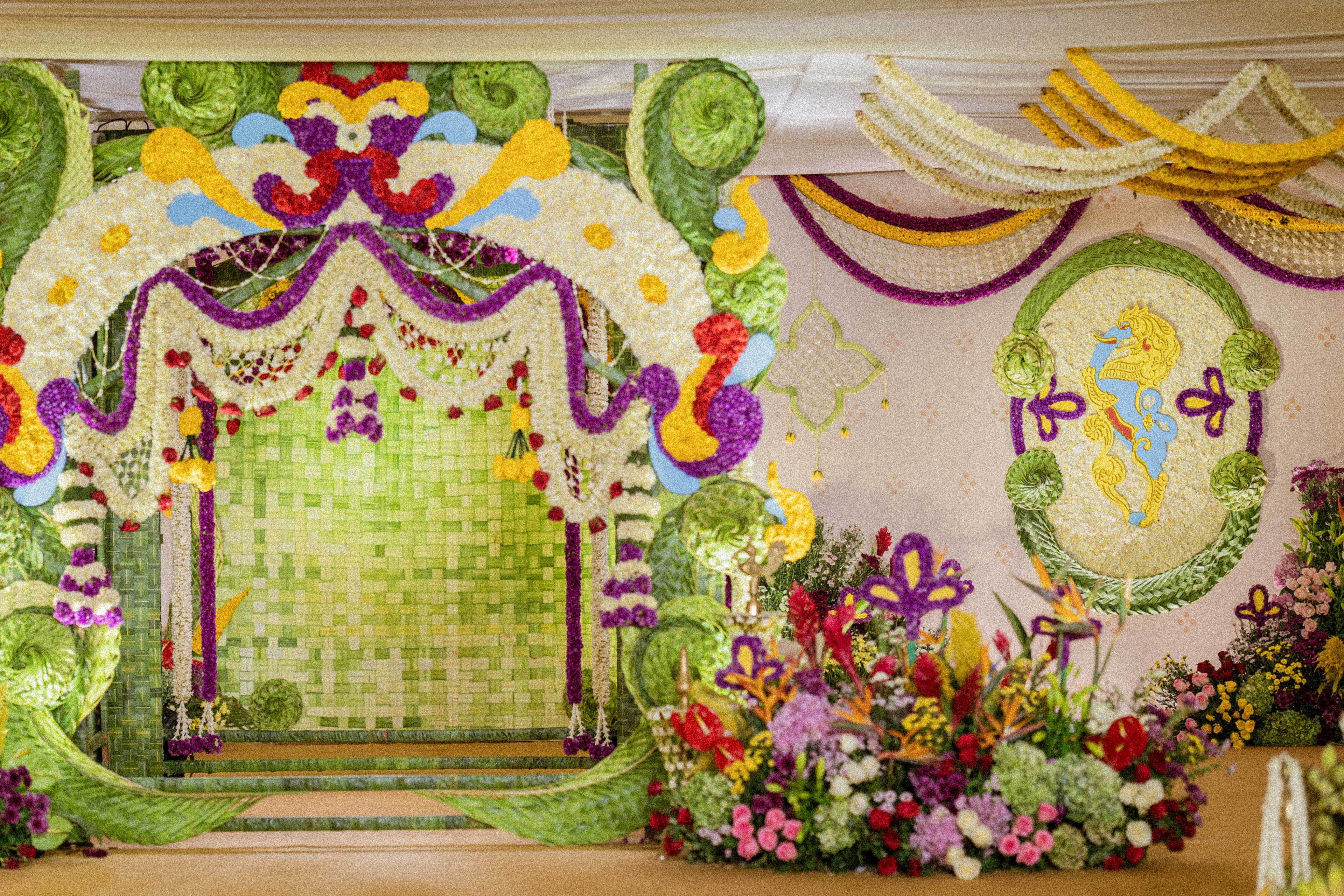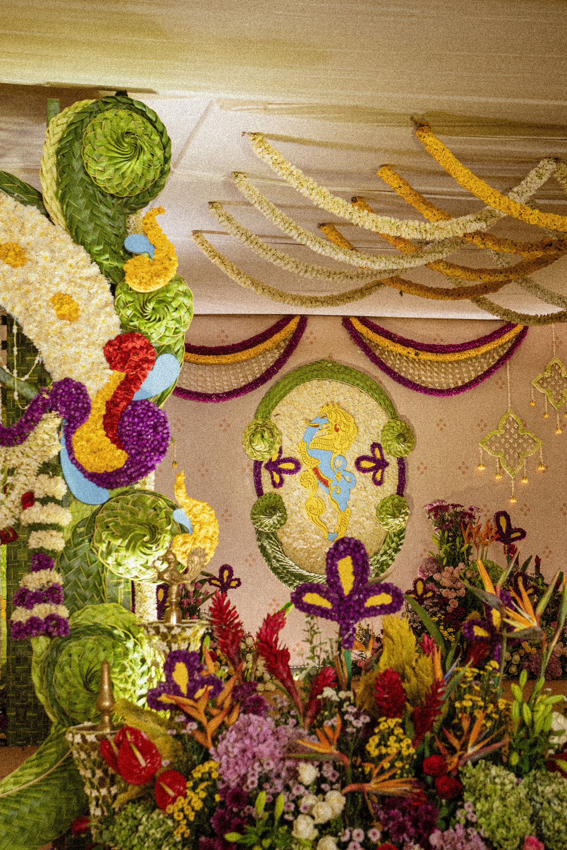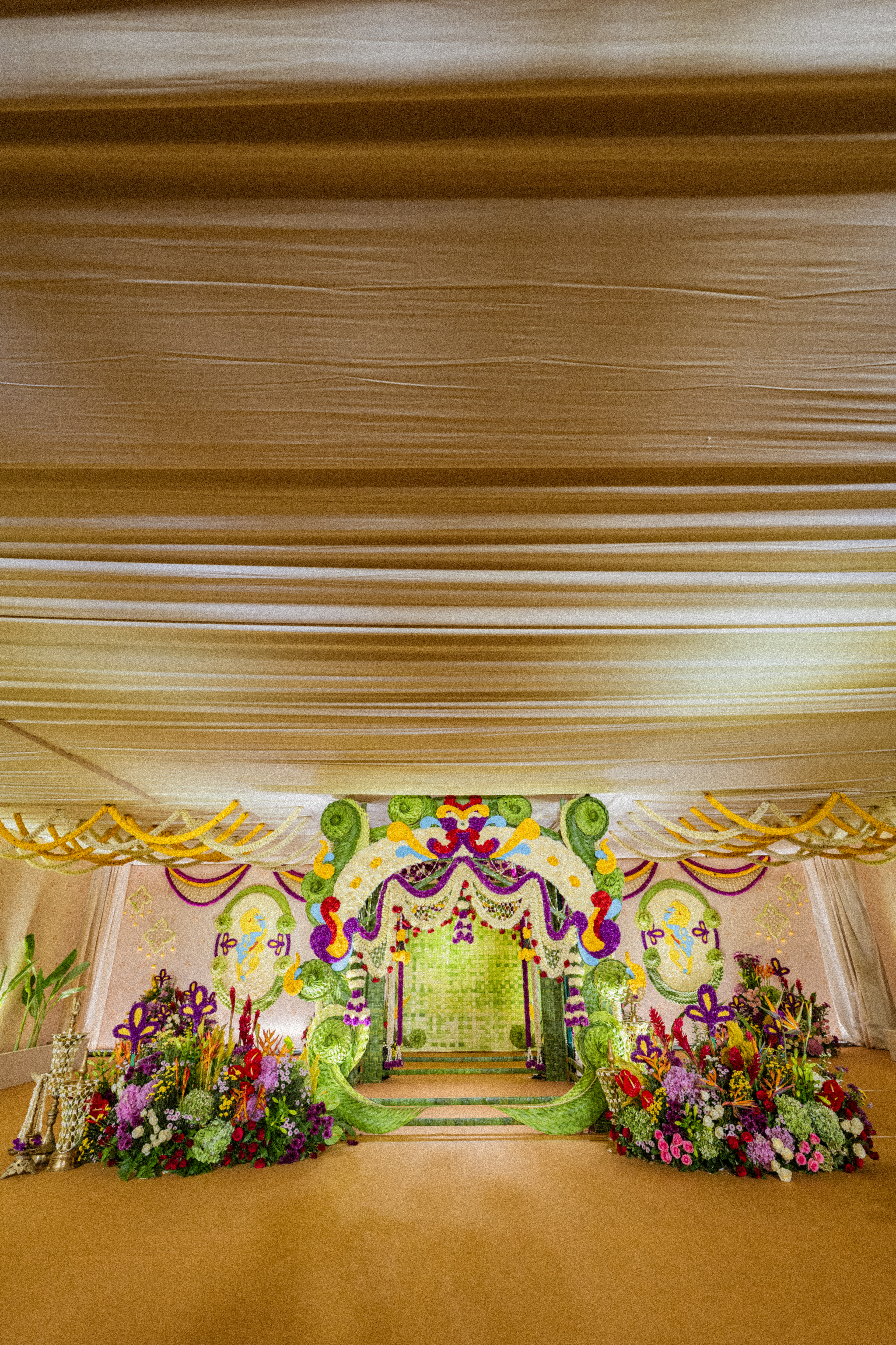 For Aarthi and Peter’s Muhurtham, we journeyed back to the golden era of the 70s and 80s, when South Indian weddings brimmed with quiet beauty, gentle charm, and deeply rooted traditions. At the heart of the celebration stood a mandap inspired by the timeless grace of a prabhavali. It rose gently from a base of lush green olai, adorned with intricate yaazhi motifs and temple-style carvings that curled and flowed like ancient poetry. Each olai swirl was lovingly handmade, an act of devotion that took hours of delicate skill and unwavering patience. These imperfections, these human hands, brought soul into structure, imbuing the space with warmth, memory, and meaning. The rest of the stage remained grounded and intentional, deeply traditional in its presence. A sungudi-inspired fabric backdrop lent colour and texture, while hand-painted temple doors welcomed guests with quiet grandeur. Every detail was imagined to feel familiar and sacred, like a story passed down, whispered gently through generations.