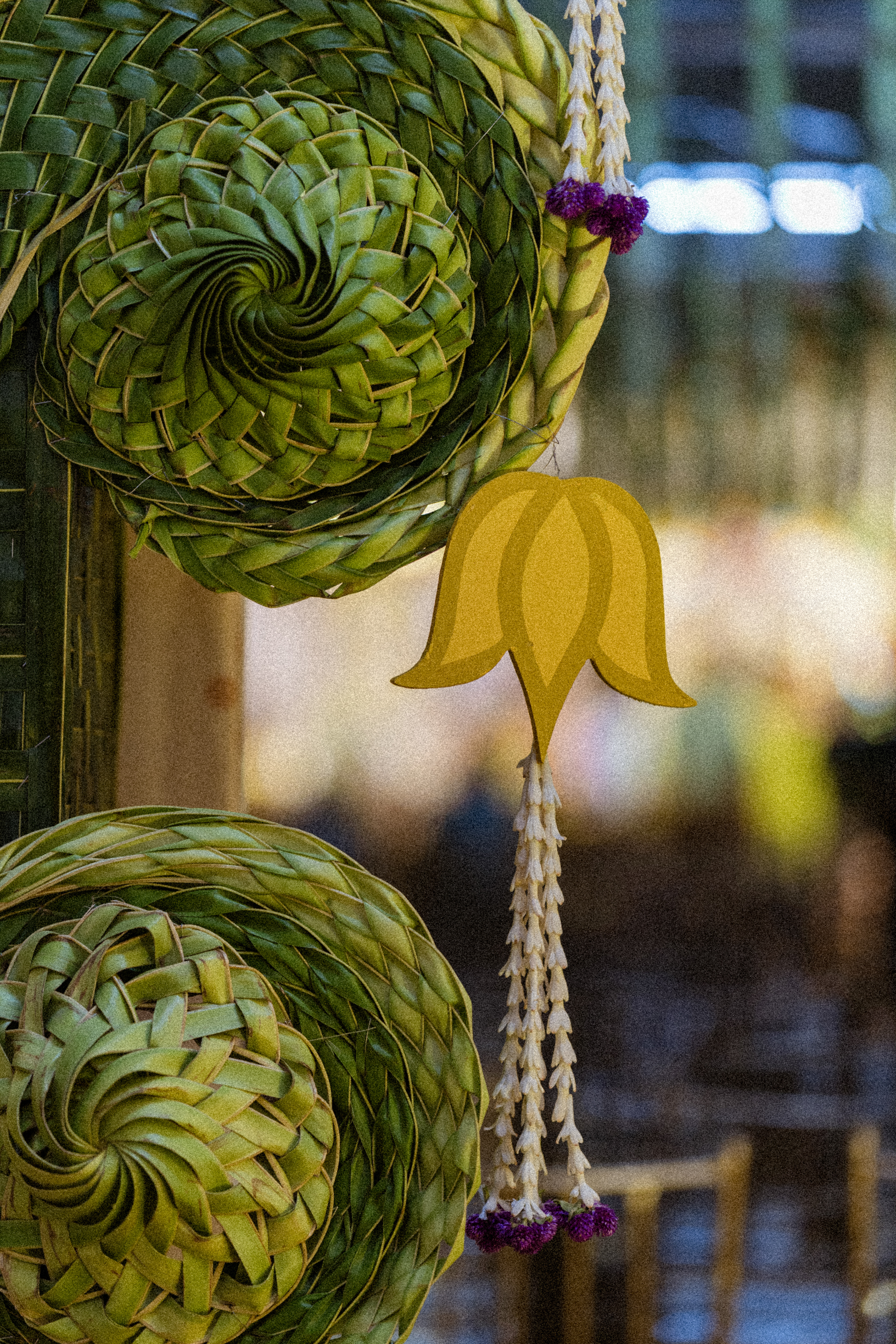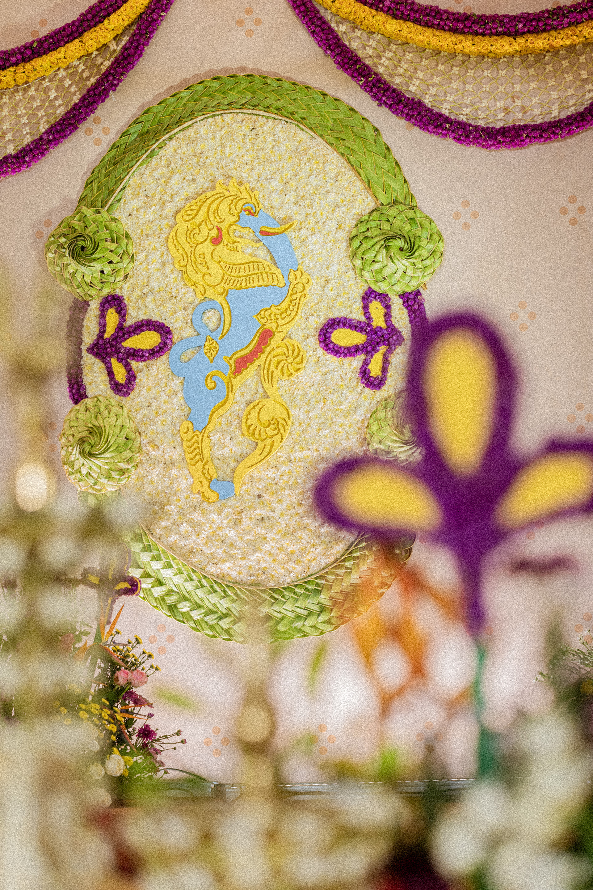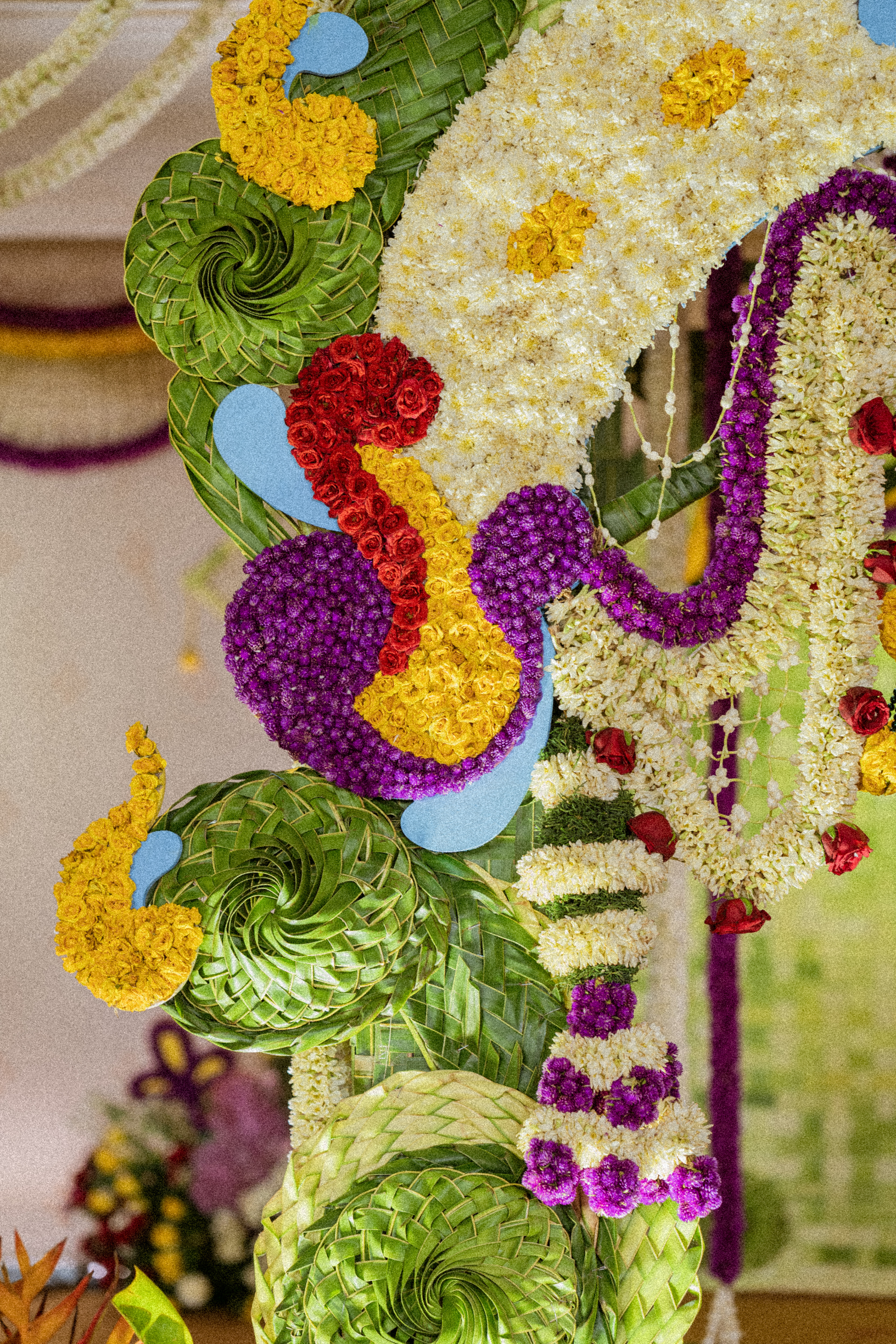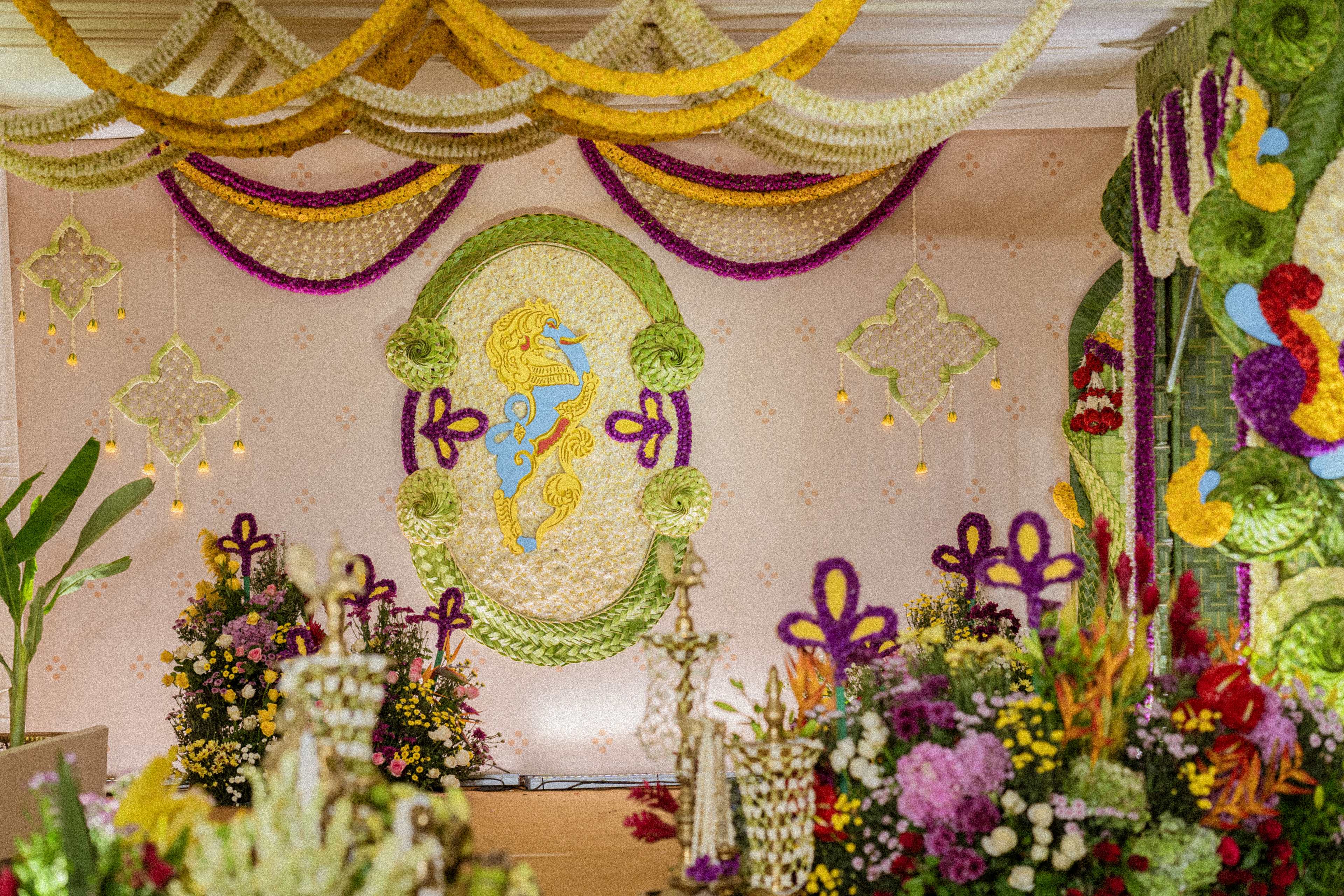 For Aarthi and Peter’s Muhurtham, we journeyed back to the golden era of the 70s and 80s, when South Indian weddings brimmed with quiet beauty, gentle charm, and deeply rooted traditions. At the heart of the celebration stood a mandap inspired by the timeless grace of a prabhavali. It rose gently from a base of lush green olai, adorned with intricate yaazhi motifs and temple-style carvings that curled and flowed like ancient poetry. Each olai swirl was lovingly handmade, an act of devotion that took hours of delicate skill and unwavering patience. These imperfections, these human hands, brought soul into structure, imbuing the space with warmth, memory, and meaning. The rest of the stage remained grounded and intentional, deeply traditional in its presence. A sungudi-inspired fabric backdrop lent colour and texture, while hand-painted temple doors welcomed guests with quiet grandeur. Every detail was imagined to feel familiar and sacred, like a story passed down, whispered gently through generations.