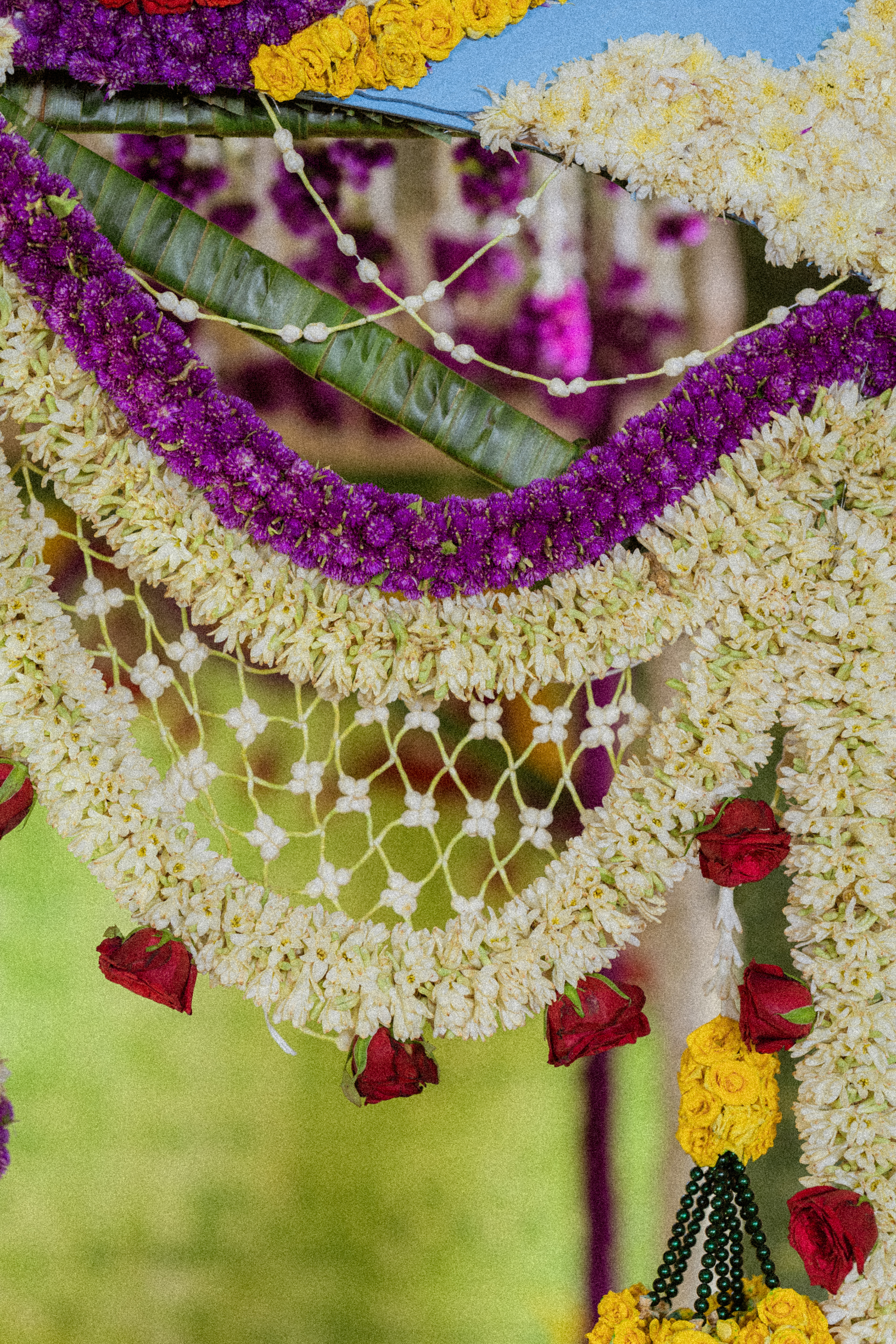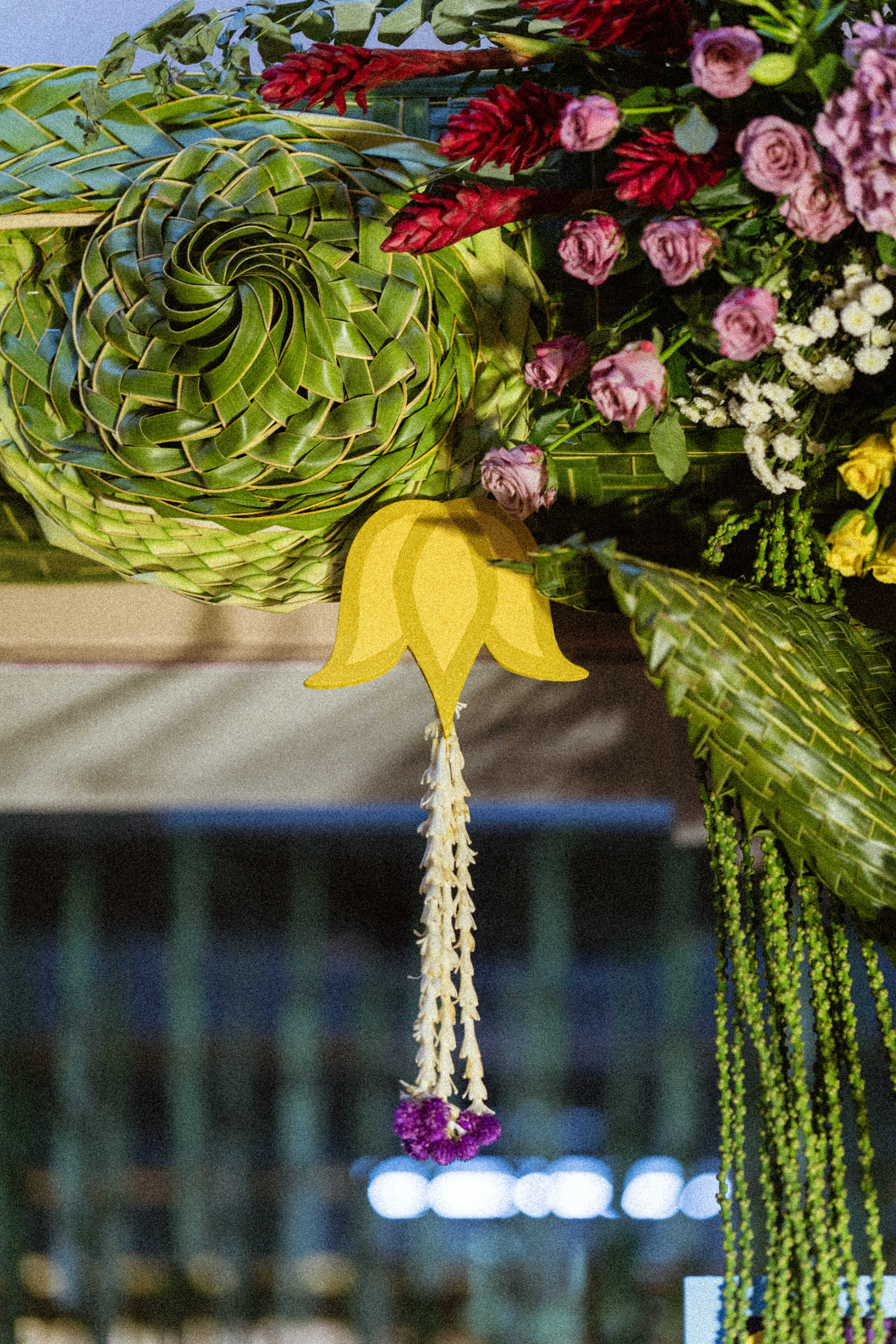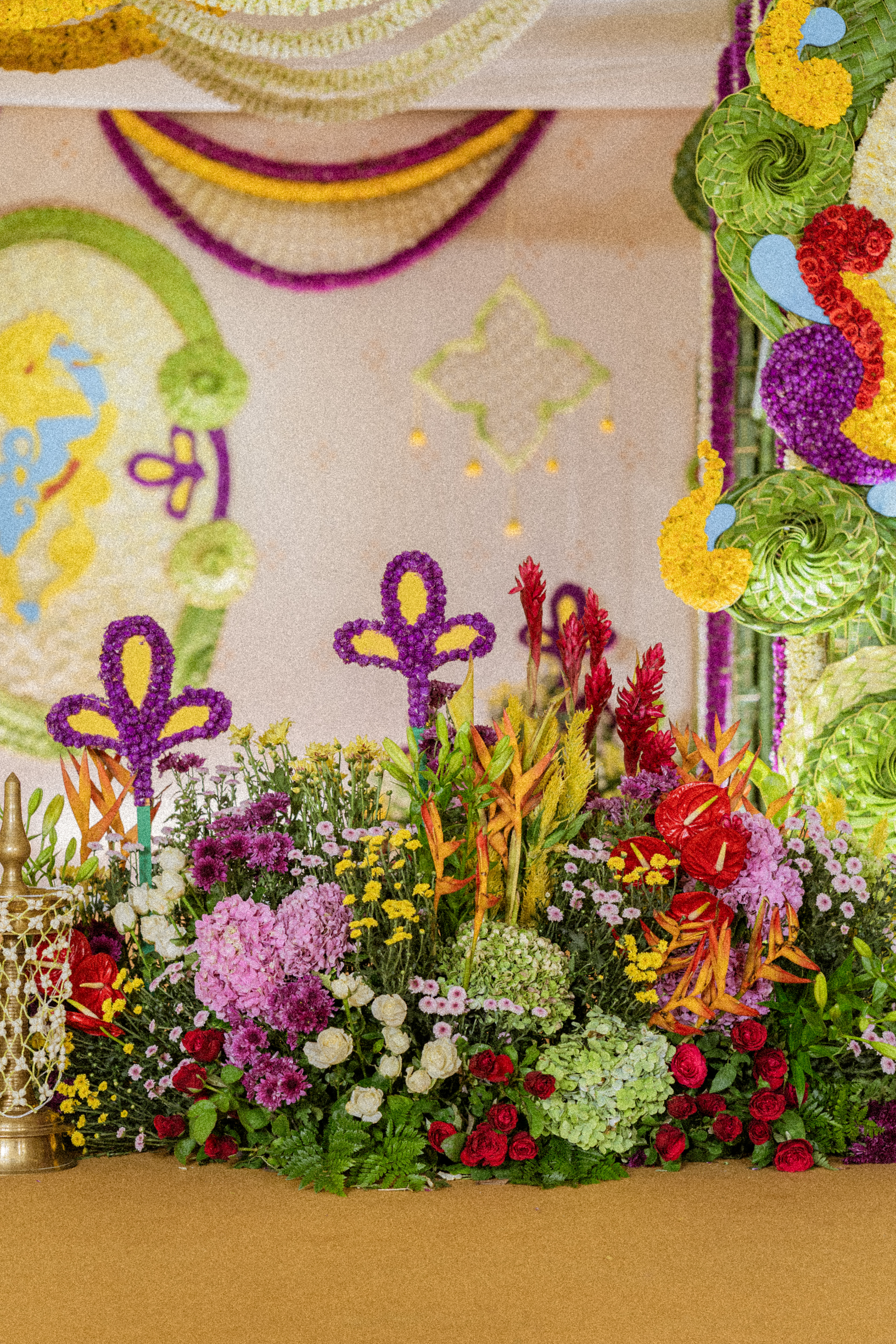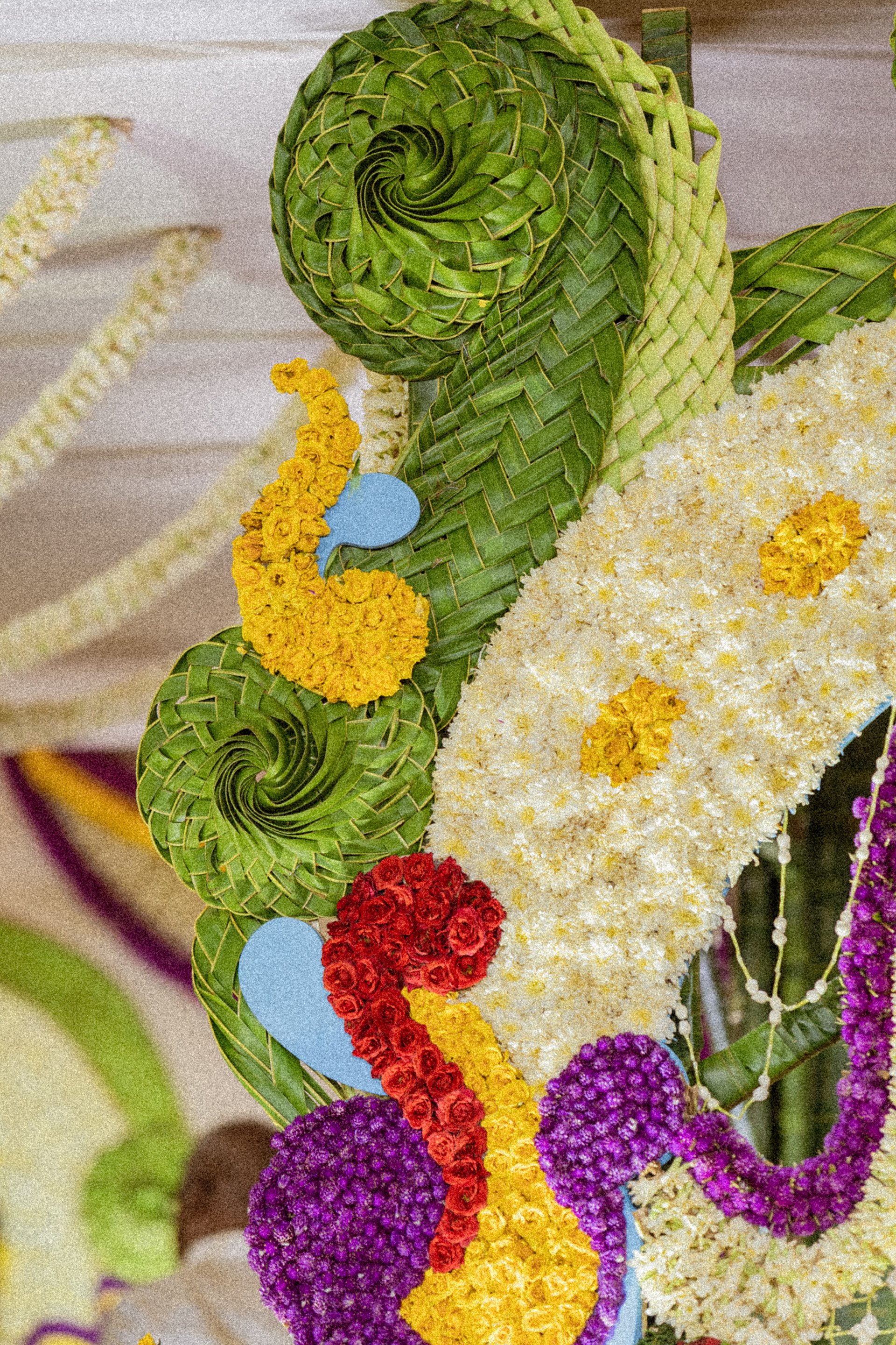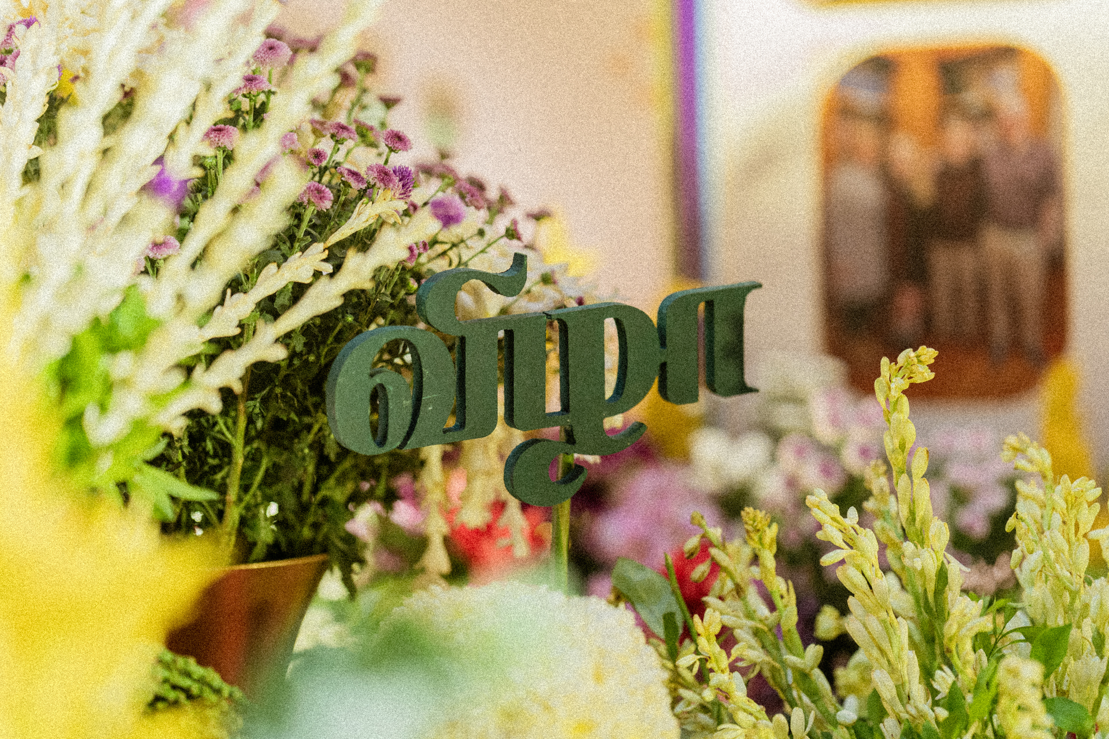 For Aarthi and Peter’s Muhurtham, we journeyed back to the golden era of the 70s and 80s, when South Indian weddings brimmed with quiet beauty, gentle charm, and deeply rooted traditions. At the heart of the celebration stood a mandap inspired by the timeless grace of a prabhavali. It rose gently from a base of lush green olai, adorned with intricate yaazhi motifs and temple-style carvings that curled and flowed like ancient poetry. Each olai swirl was lovingly handmade, an act of devotion that took hours of delicate skill and unwavering patience. These imperfections, these human hands, brought soul into structure, imbuing the space with warmth, memory, and meaning. The rest of the stage remained grounded and intentional, deeply traditional in its presence. A sungudi-inspired fabric backdrop lent colour and texture, while hand-painted temple doors welcomed guests with quiet grandeur. Every detail was imagined to feel familiar and sacred, like a story passed down, whispered gently through generations.