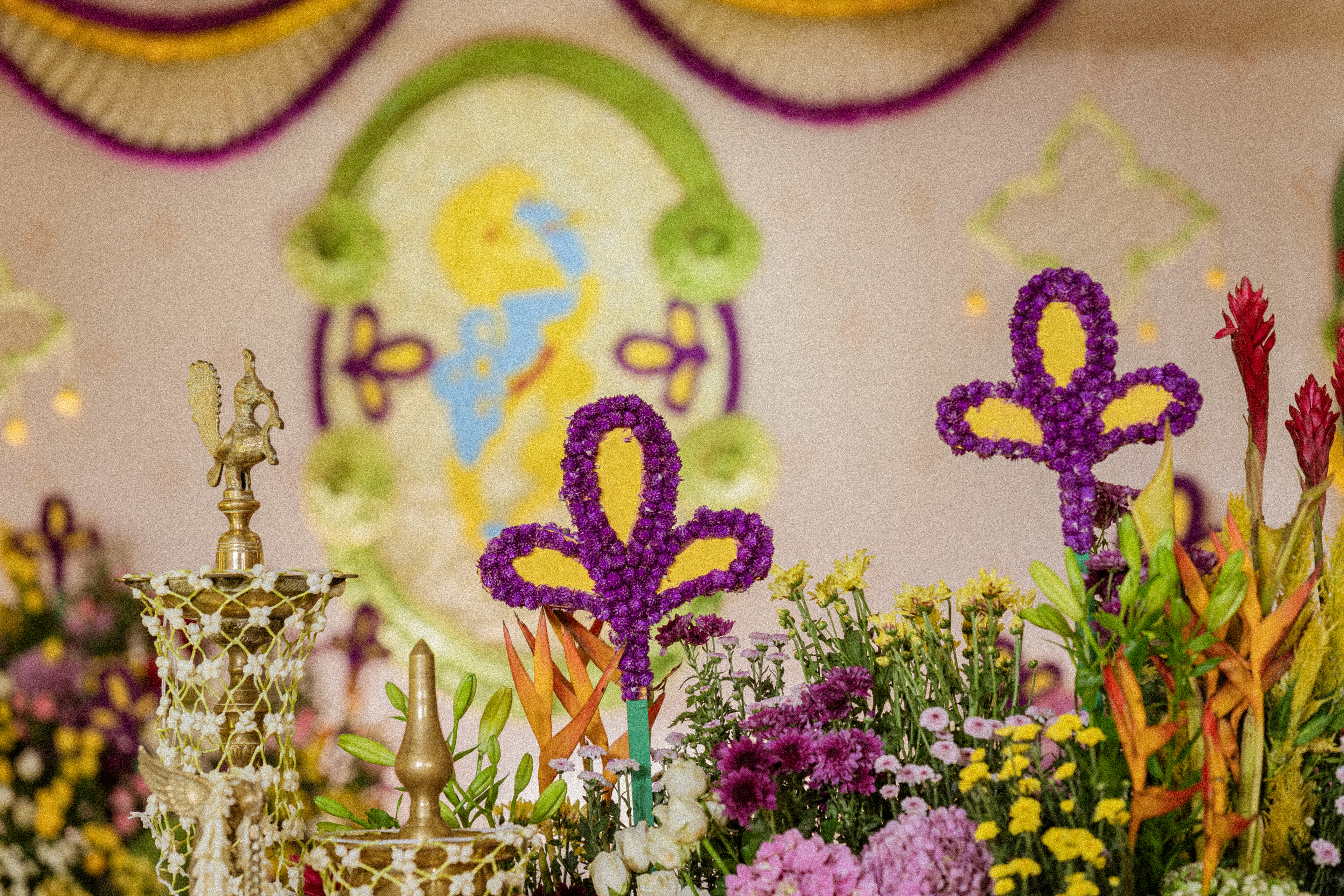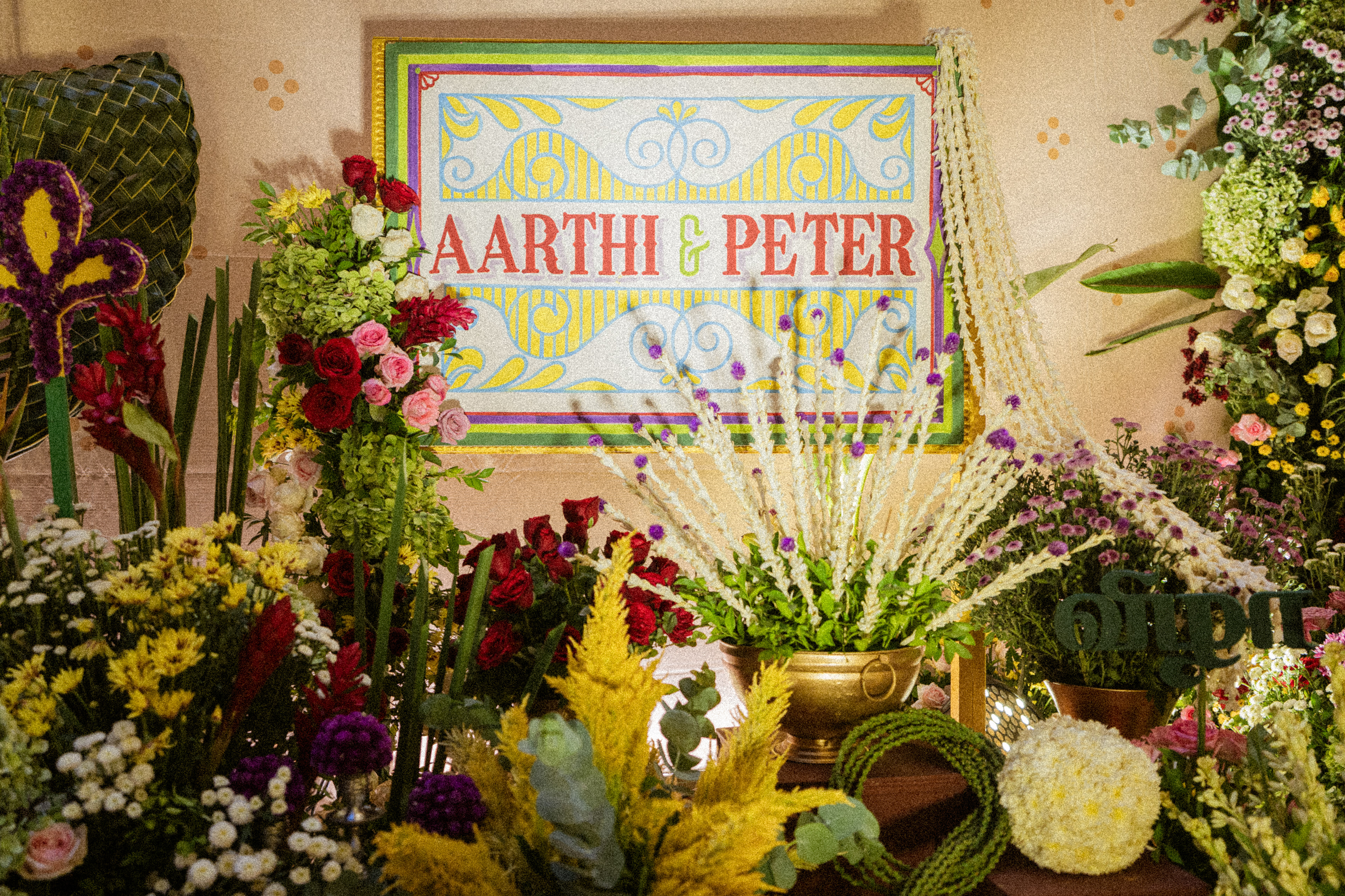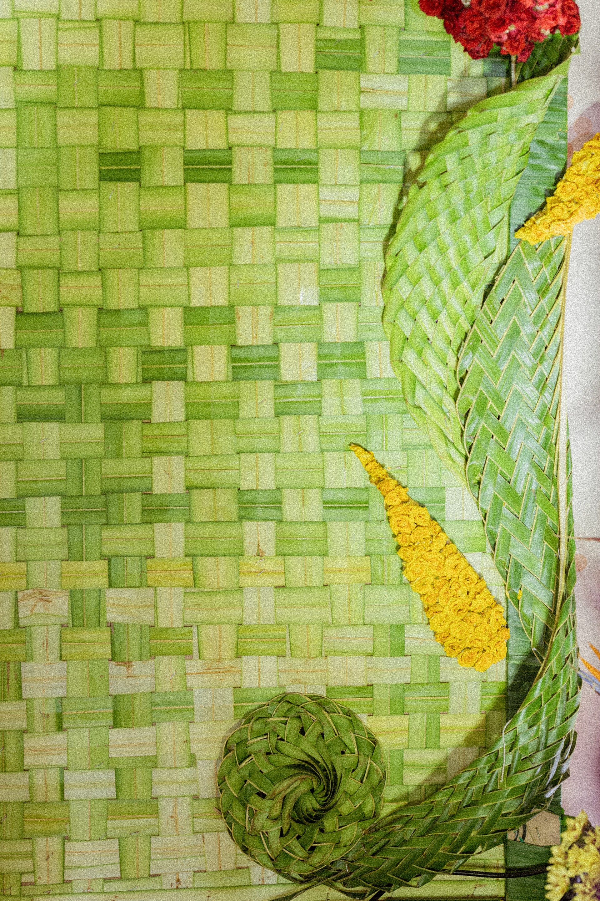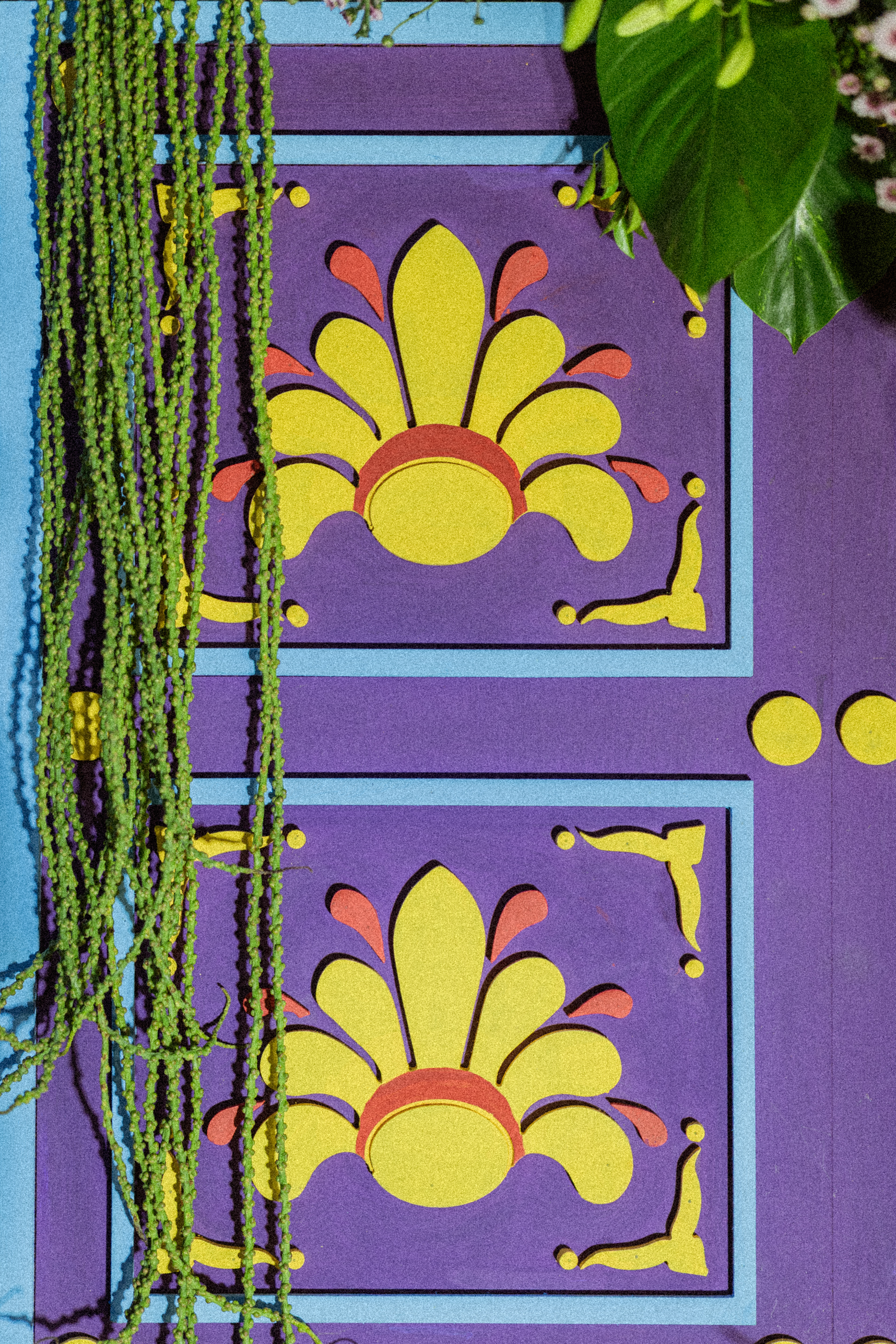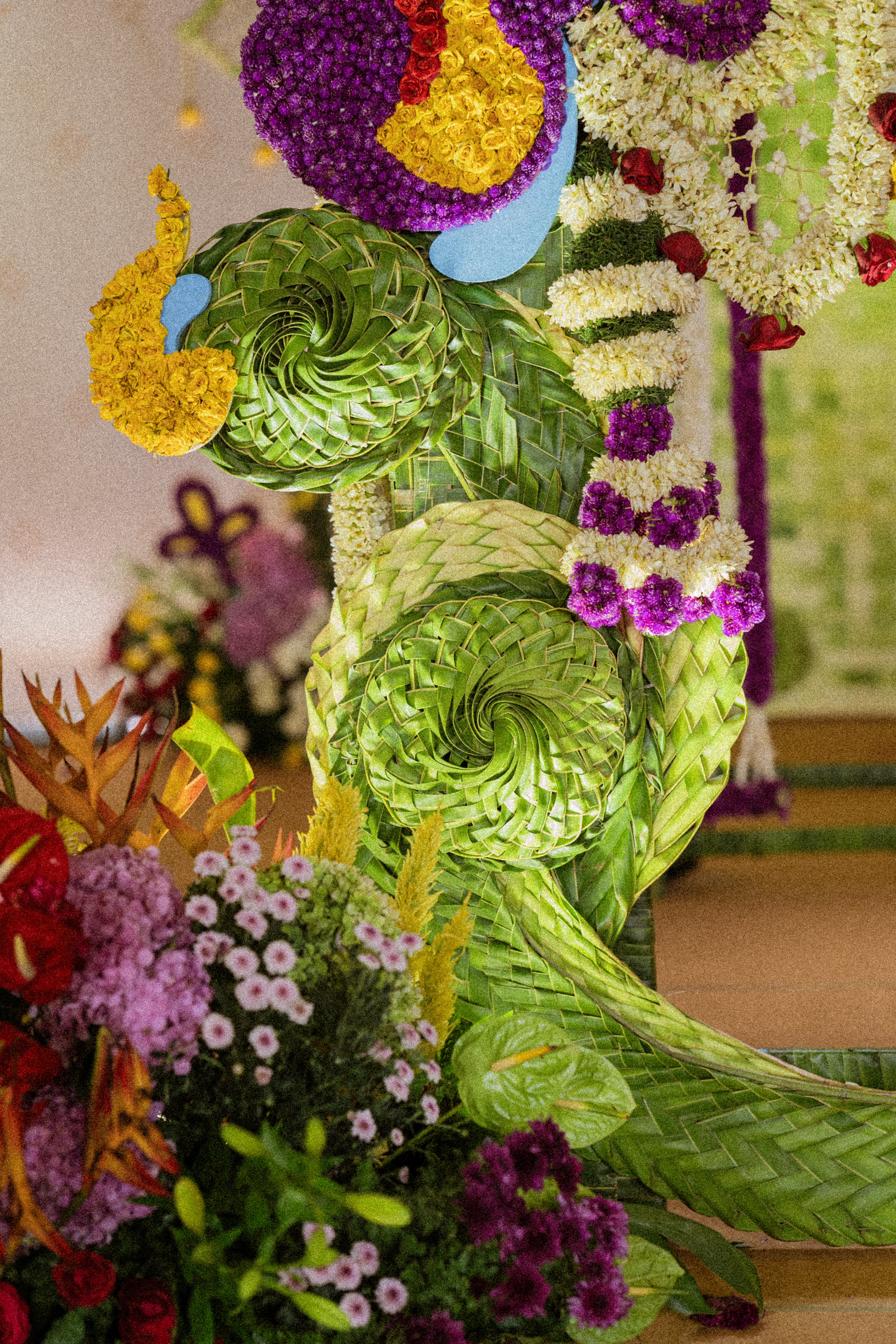 For Aarthi and Peter’s Muhurtham, we journeyed back to the golden era of the 70s and 80s, when South Indian weddings brimmed with quiet beauty, gentle charm, and deeply rooted traditions. At the heart of the celebration stood a mandap inspired by the timeless grace of a prabhavali. It rose gently from a base of lush green olai, adorned with intricate yaazhi motifs and temple-style carvings that curled and flowed like ancient poetry. Each olai swirl was lovingly handmade, an act of devotion that took hours of delicate skill and unwavering patience. These imperfections, these human hands, brought soul into structure, imbuing the space with warmth, memory, and meaning. The rest of the stage remained grounded and intentional, deeply traditional in its presence. A sungudi-inspired fabric backdrop lent colour and texture, while hand-painted temple doors welcomed guests with quiet grandeur. Every detail was imagined to feel familiar and sacred, like a story passed down, whispered gently through generations.