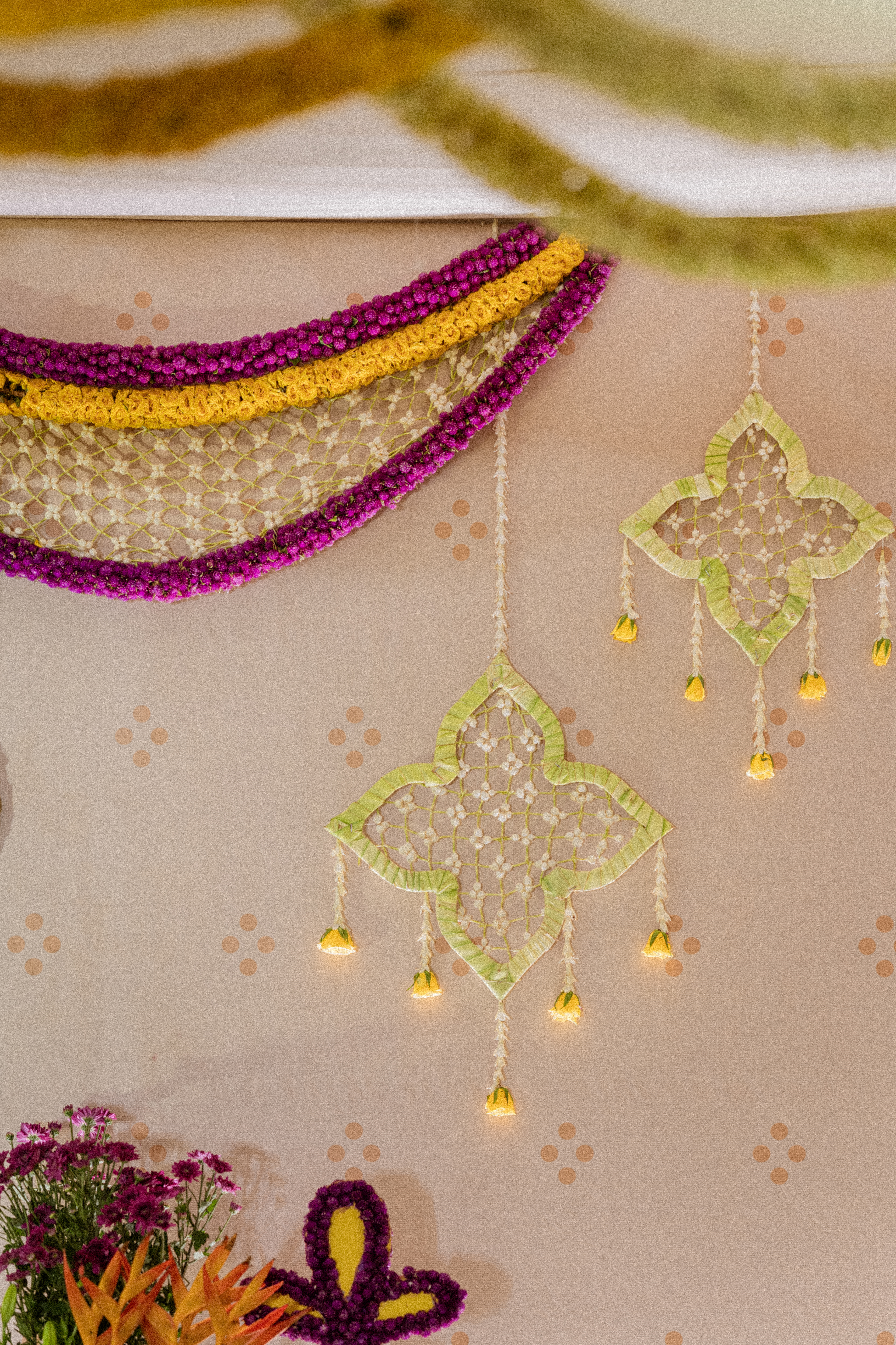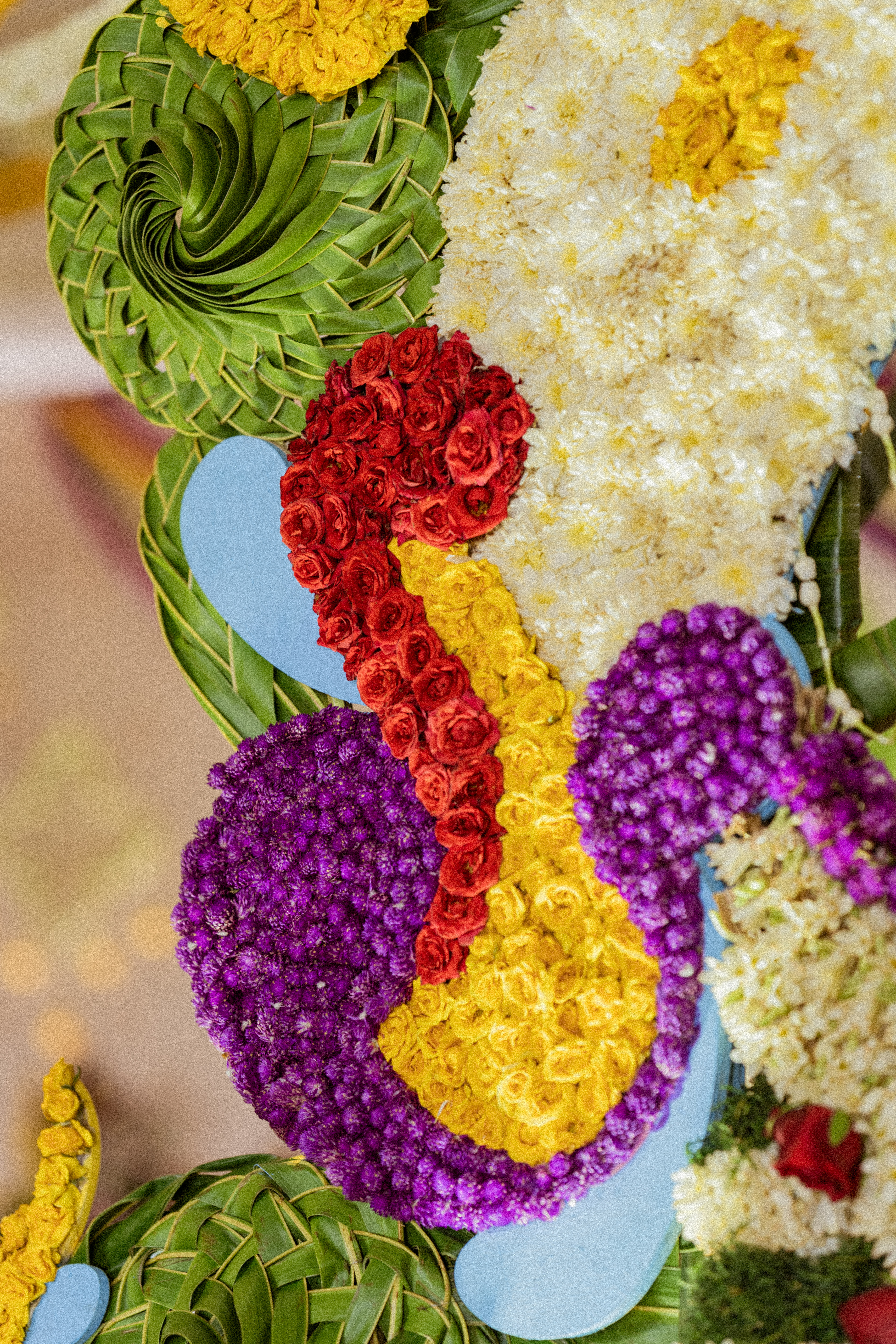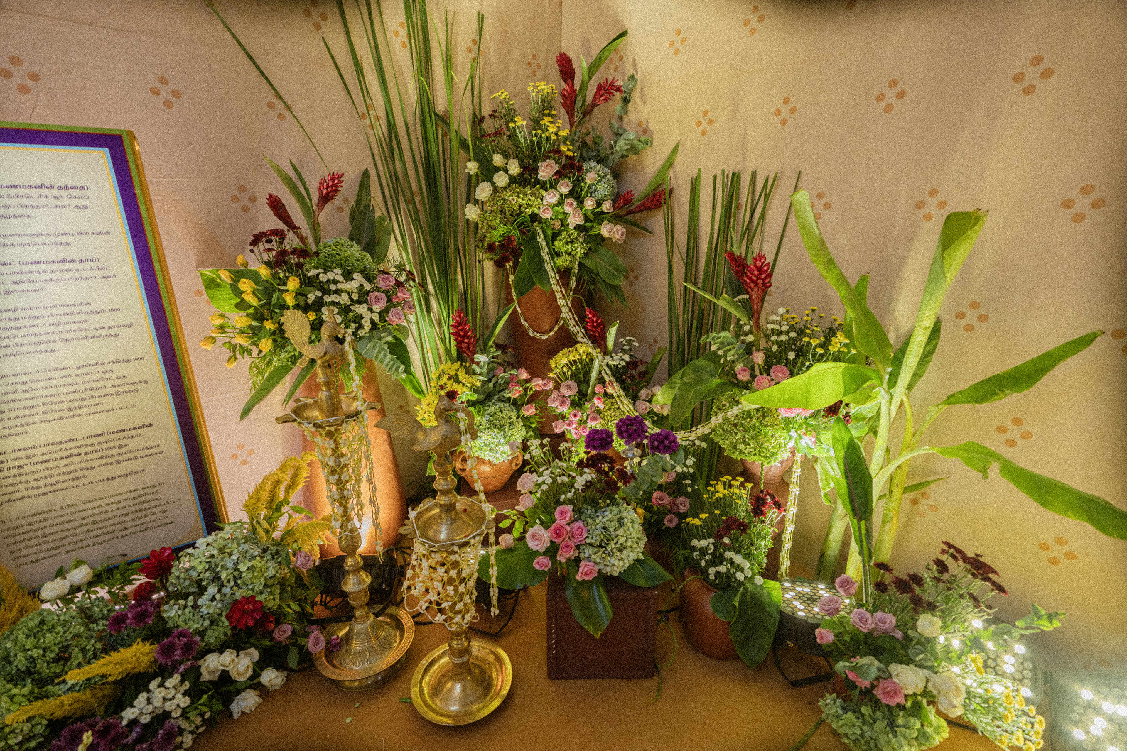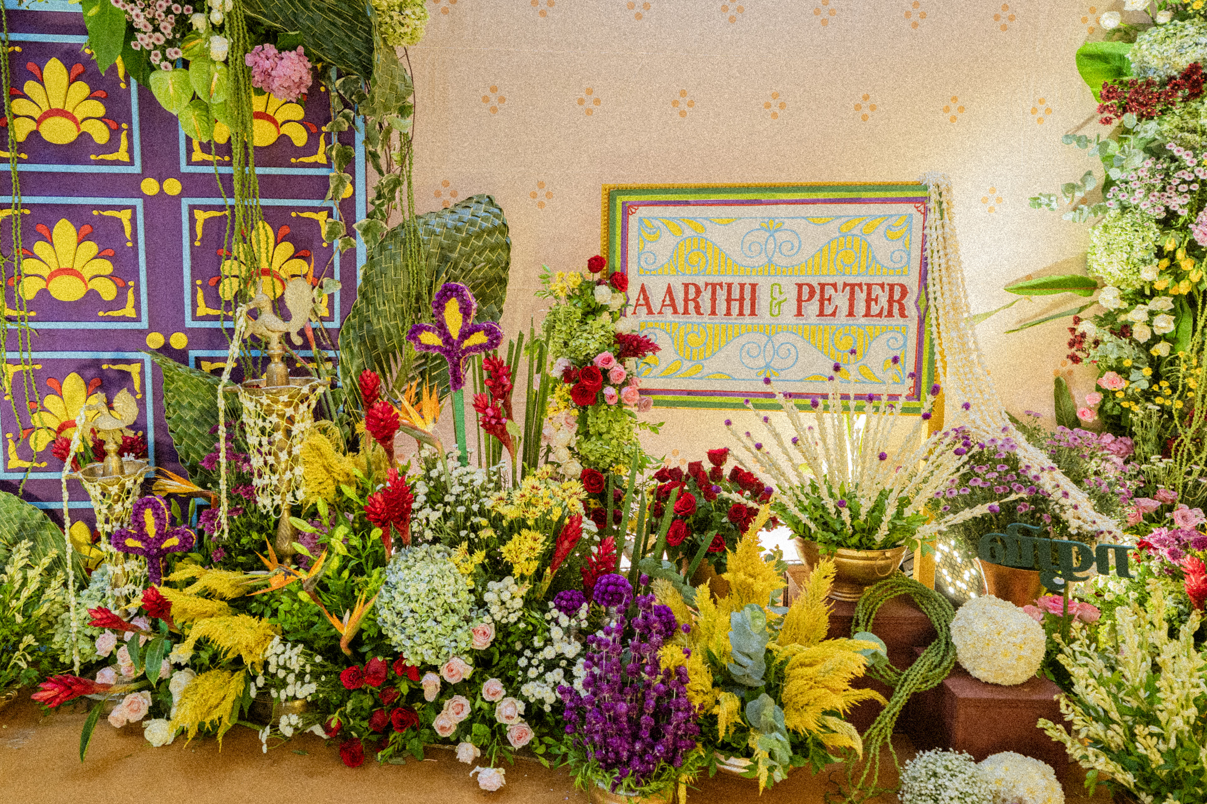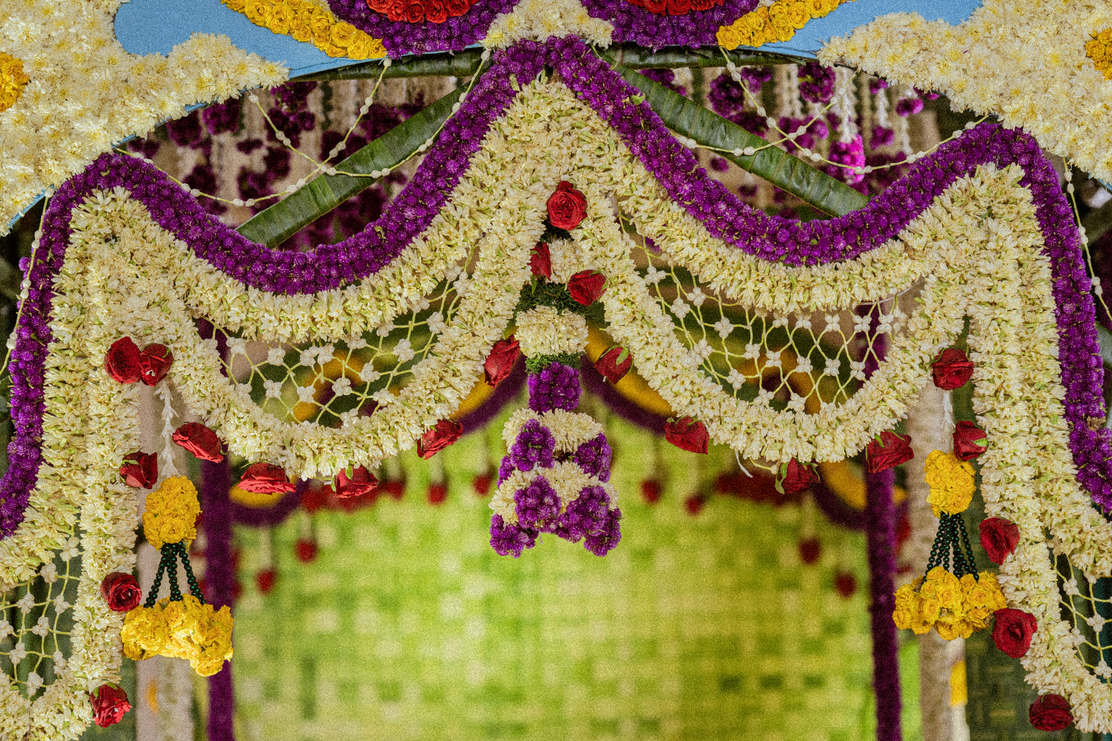For Aarthi and Peter’s Muhurtham, we journeyed back to the golden era of the 70s and 80s, when South Indian weddings brimmed with quiet beauty, gentle charm, and deeply rooted traditions. At the heart of the celebration stood a mandap inspired by the timeless grace of a prabhavali. It rose gently from a base of lush green olai, adorned with intricate yaazhi motifs and temple-style carvings that curled and flowed like ancient poetry. Each olai swirl was lovingly handmade, an act of devotion that took hours of delicate skill and unwavering patience. These imperfections, these human hands, brought soul into structure, imbuing the space with warmth, memory, and meaning. The rest of the stage remained grounded and intentional, deeply traditional in its presence. A sungudi-inspired fabric backdrop lent colour and texture, while hand-painted temple doors welcomed guests with quiet grandeur. Every detail was imagined to feel familiar and sacred, like a story passed down, whispered gently through generations.