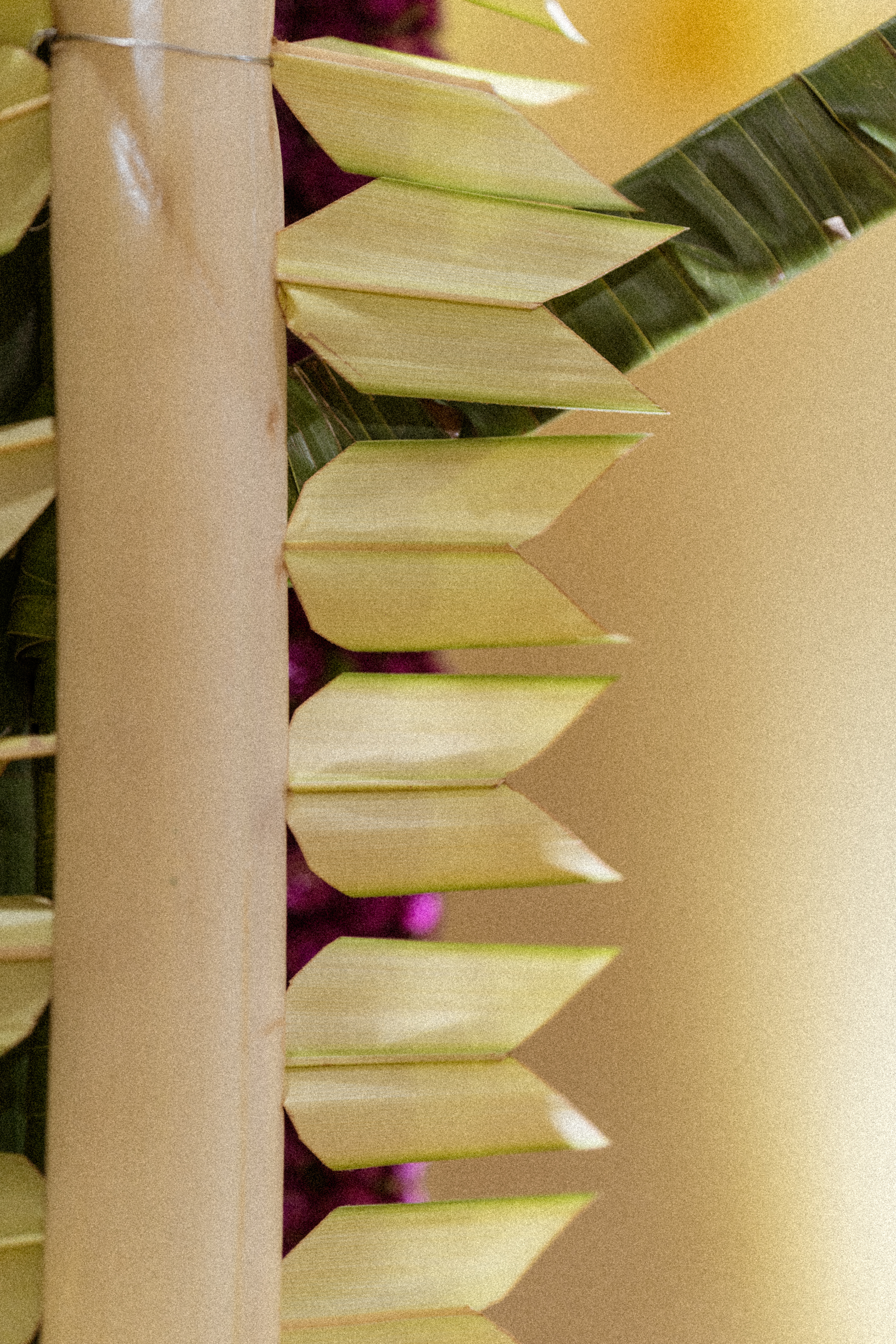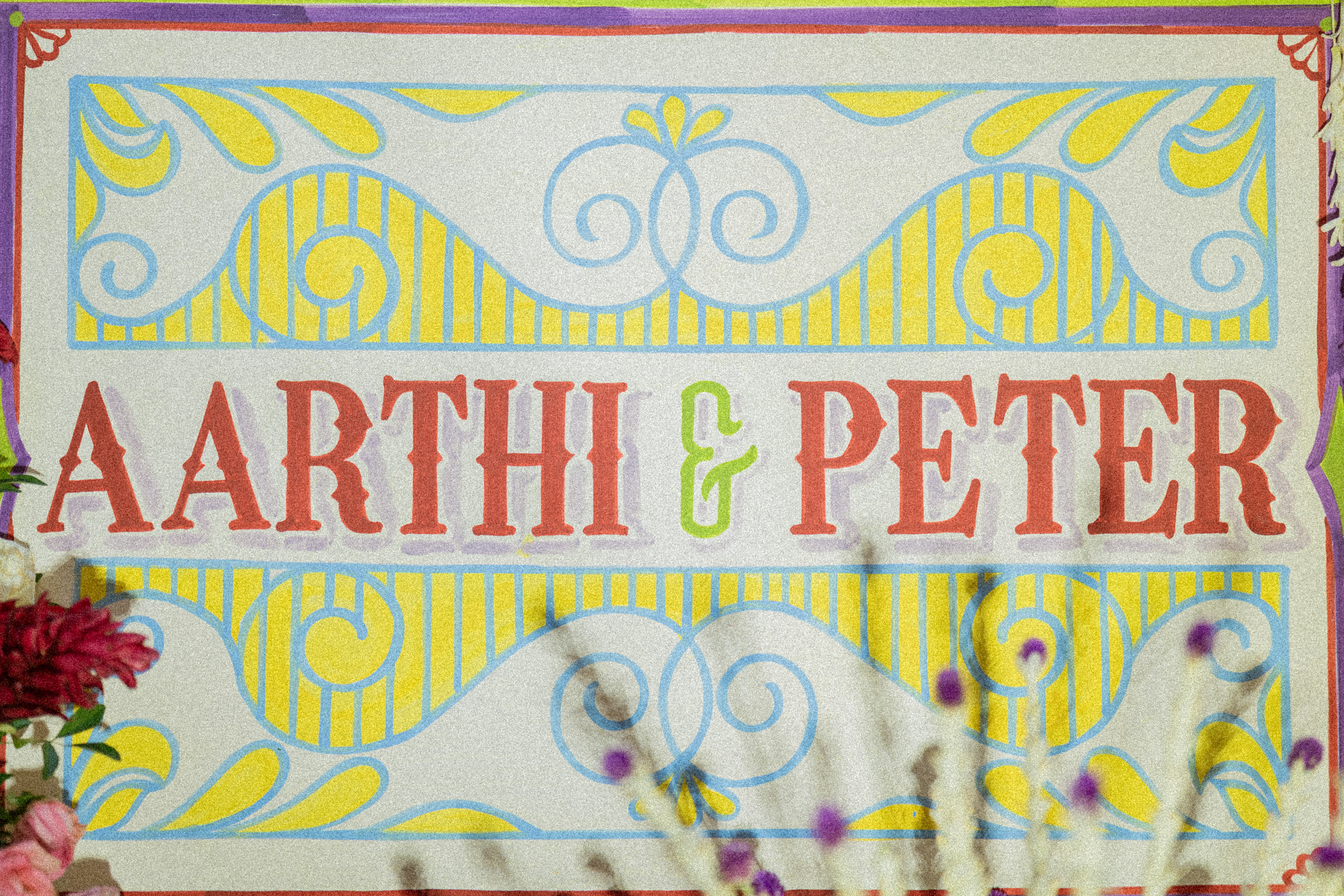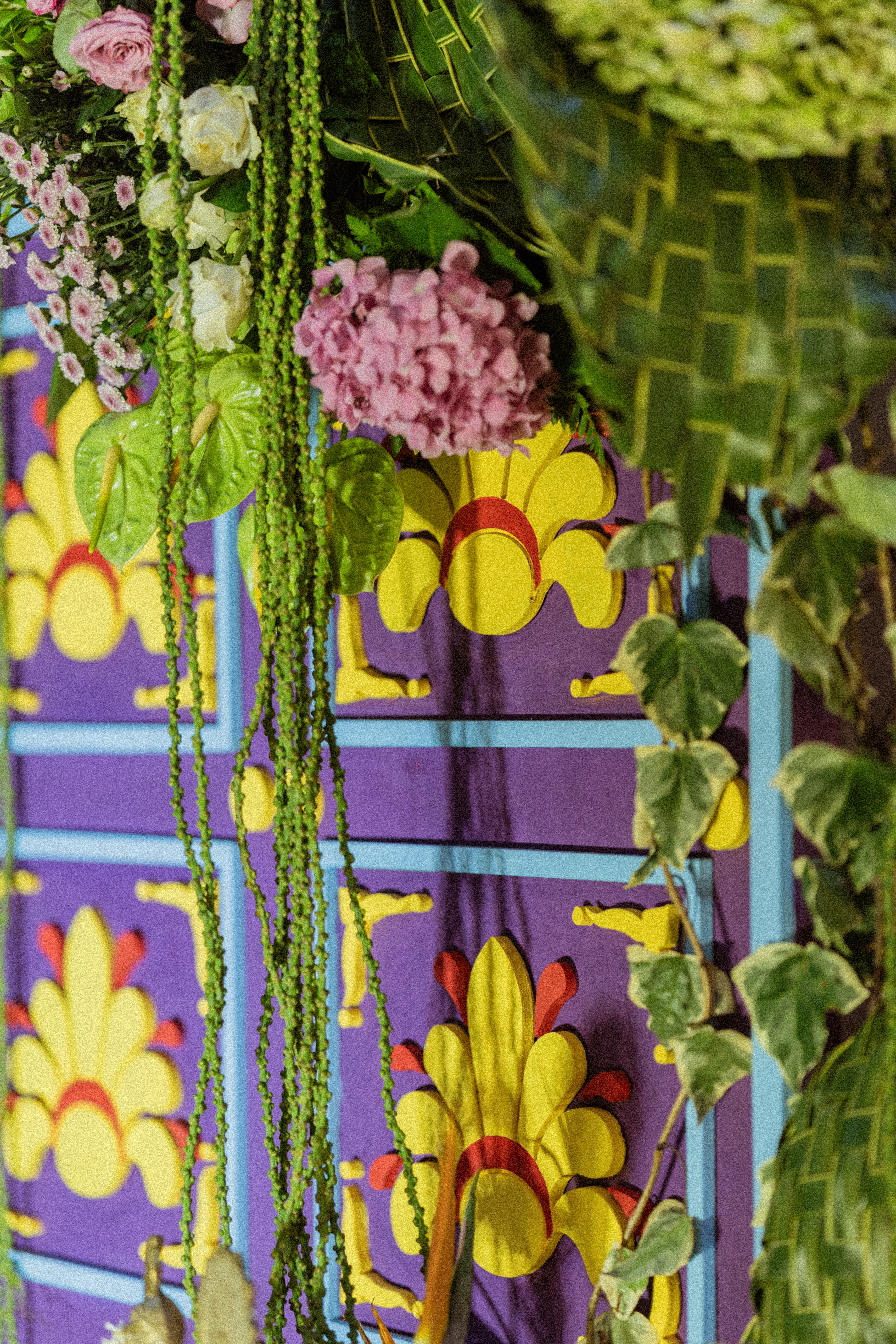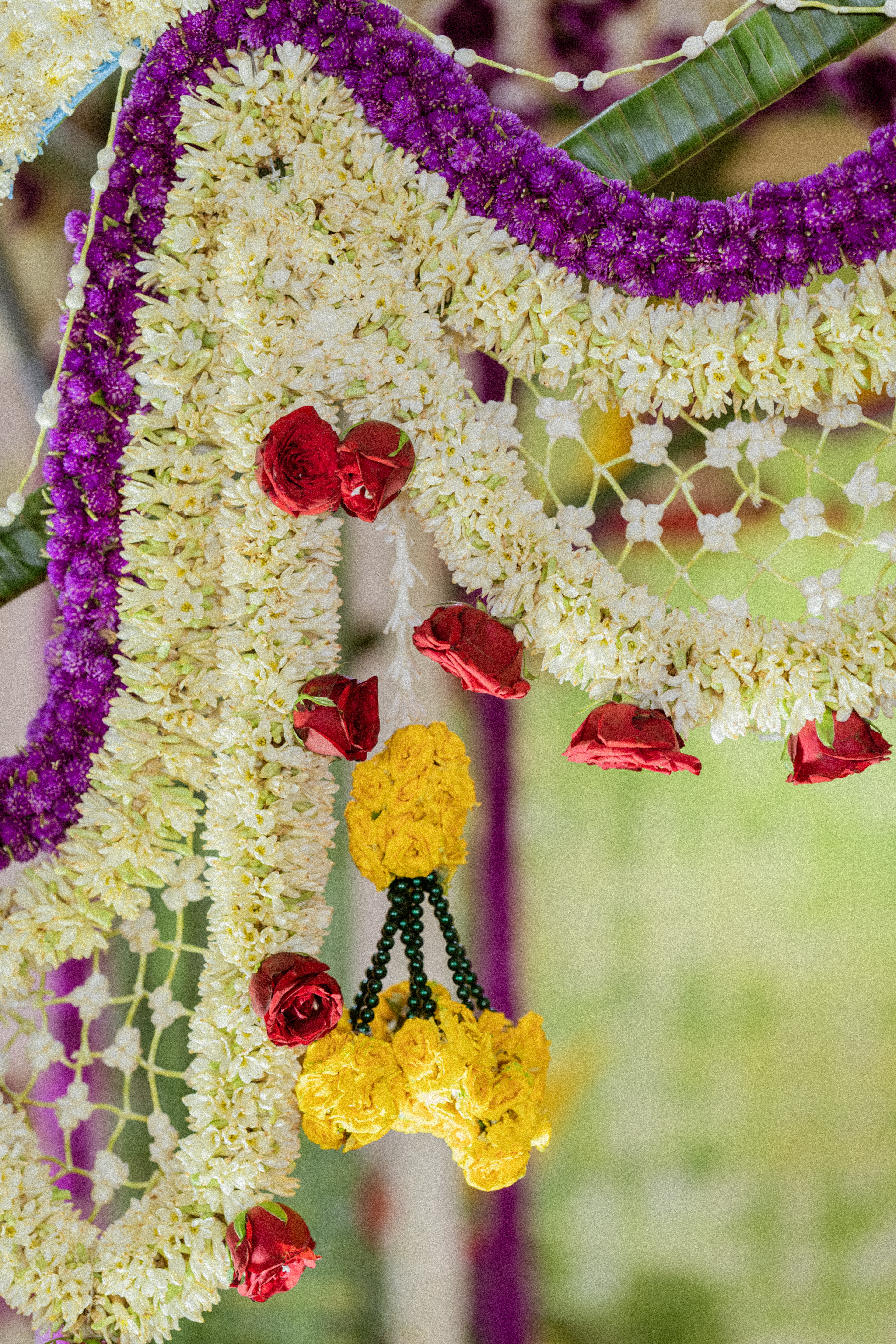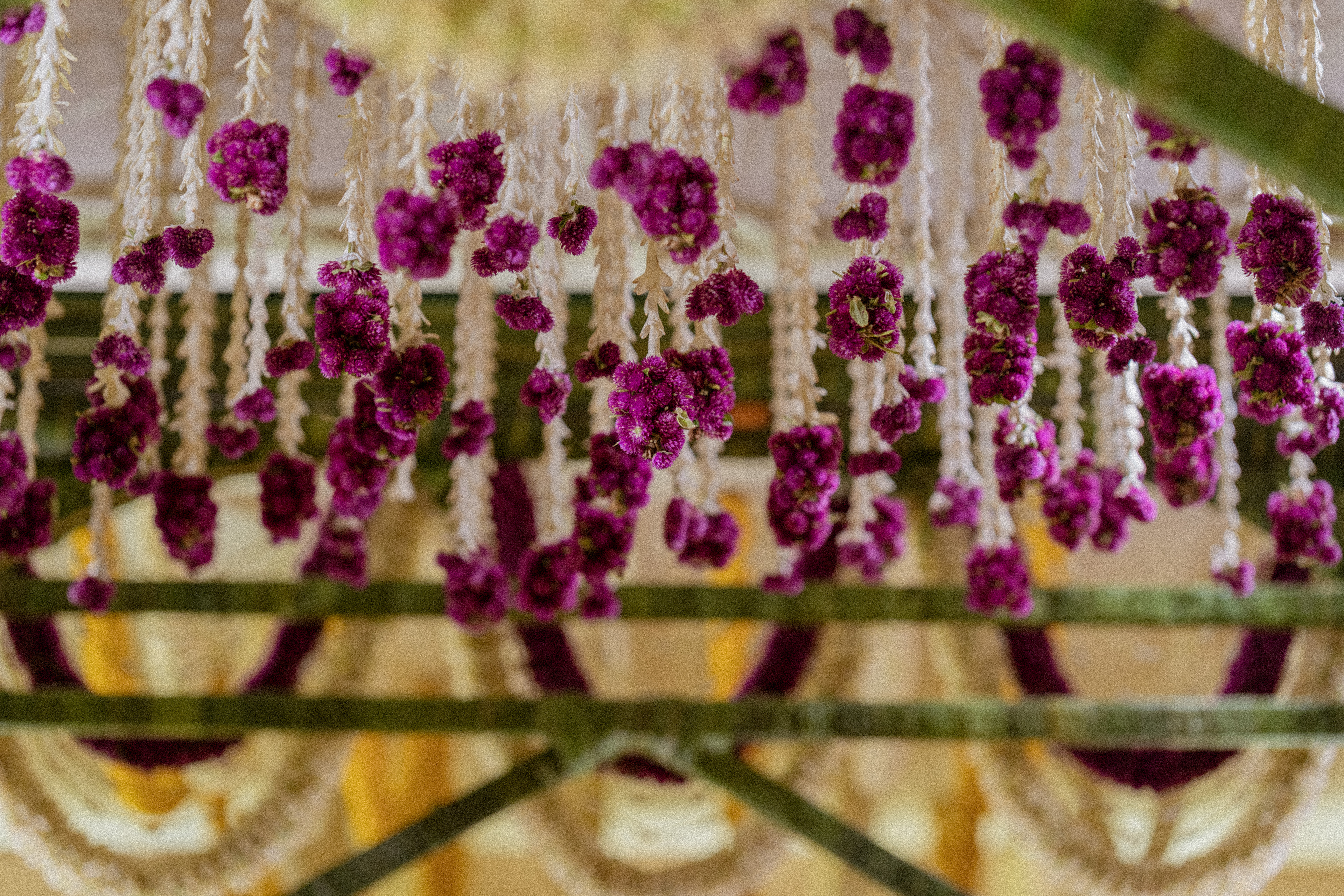 For Aarthi and Peter’s Muhurtham, we journeyed back to the golden era of the 70s and 80s, when South Indian weddings brimmed with quiet beauty, gentle charm, and deeply rooted traditions. At the heart of the celebration stood a mandap inspired by the timeless grace of a prabhavali. It rose gently from a base of lush green olai, adorned with intricate yaazhi motifs and temple-style carvings that curled and flowed like ancient poetry. Each olai swirl was lovingly handmade, an act of devotion that took hours of delicate skill and unwavering patience. These imperfections, these human hands, brought soul into structure, imbuing the space with warmth, memory, and meaning. The rest of the stage remained grounded and intentional, deeply traditional in its presence. A sungudi-inspired fabric backdrop lent colour and texture, while hand-painted temple doors welcomed guests with quiet grandeur. Every detail was imagined to feel familiar and sacred, like a story passed down, whispered gently through generations.