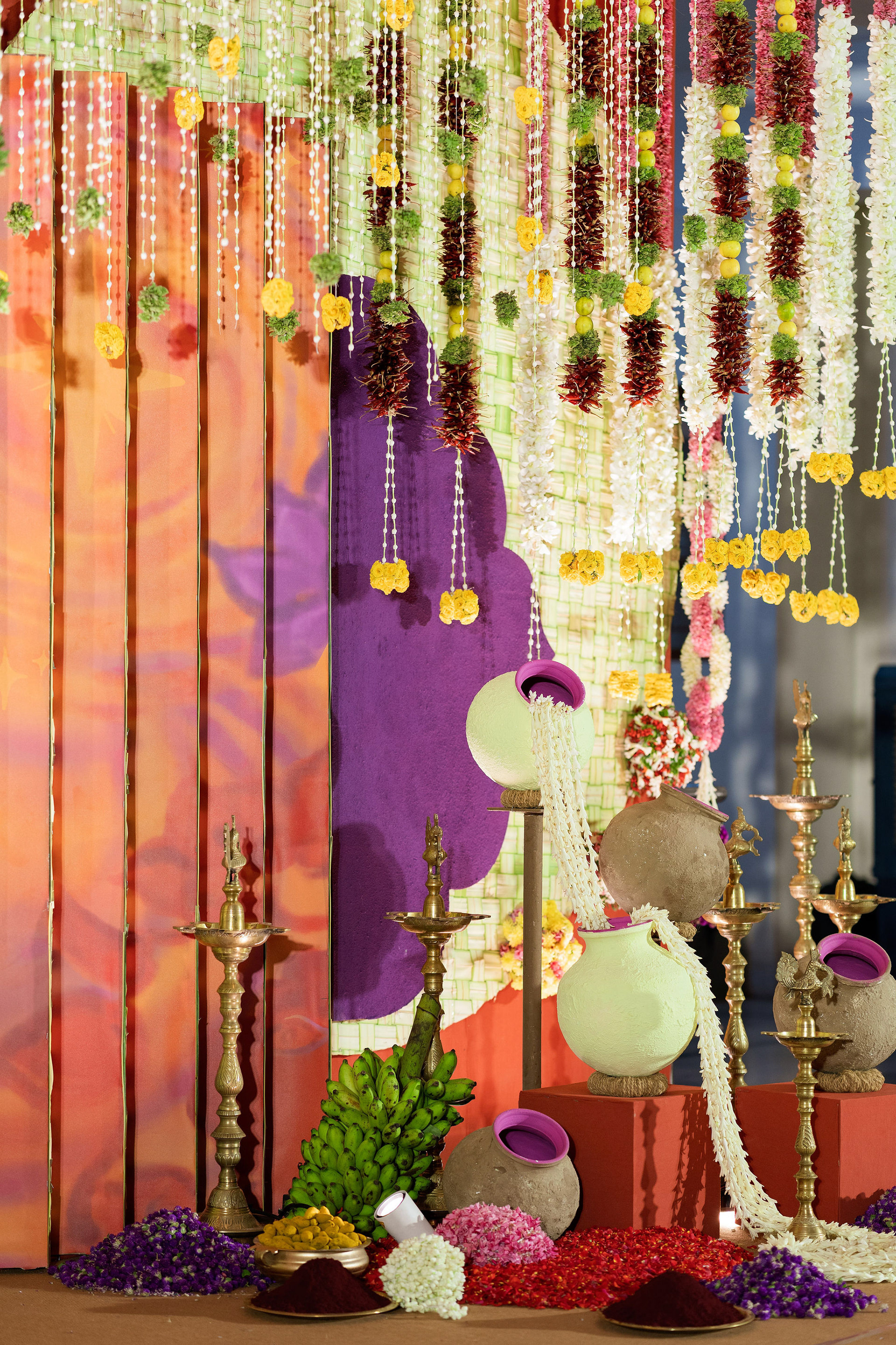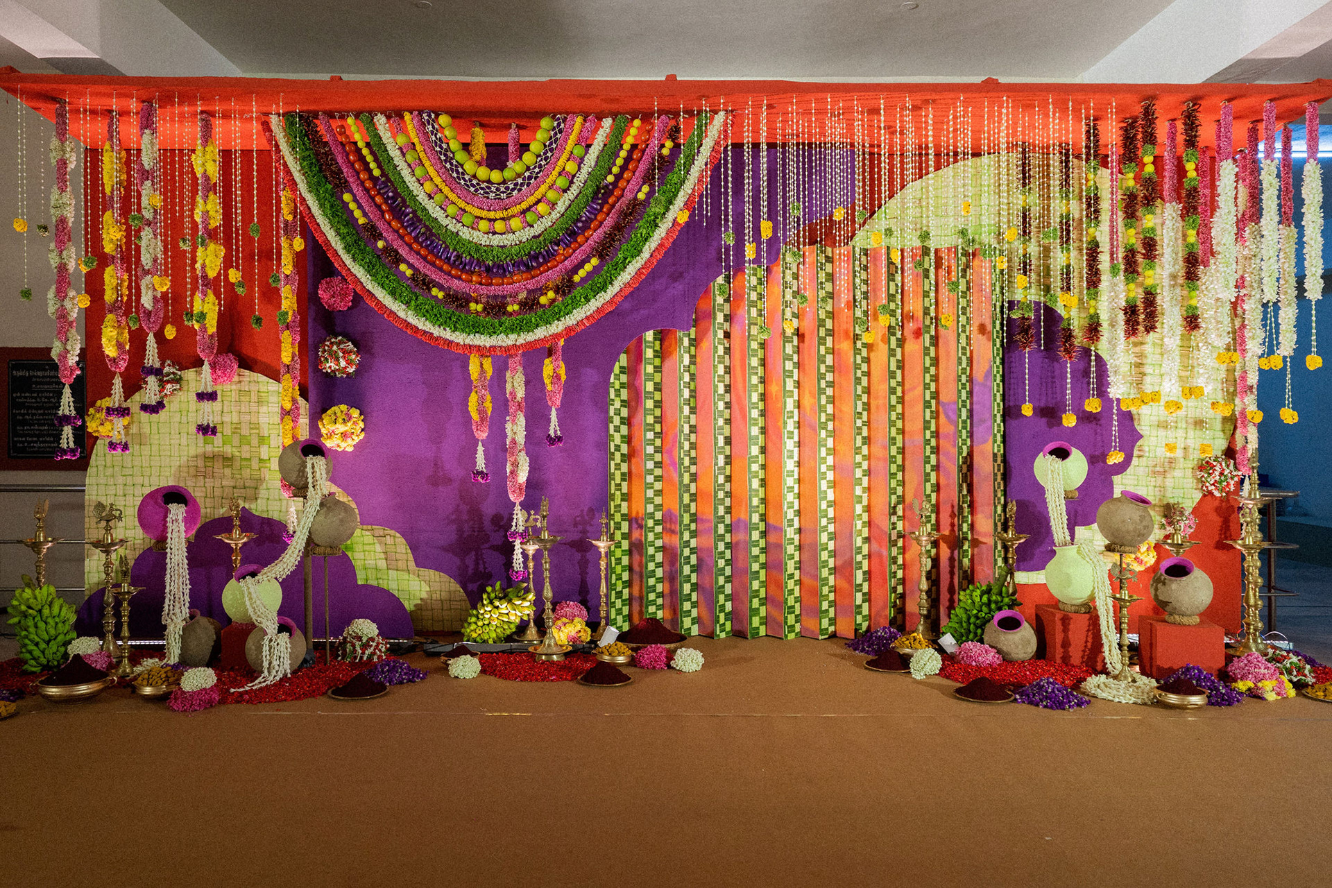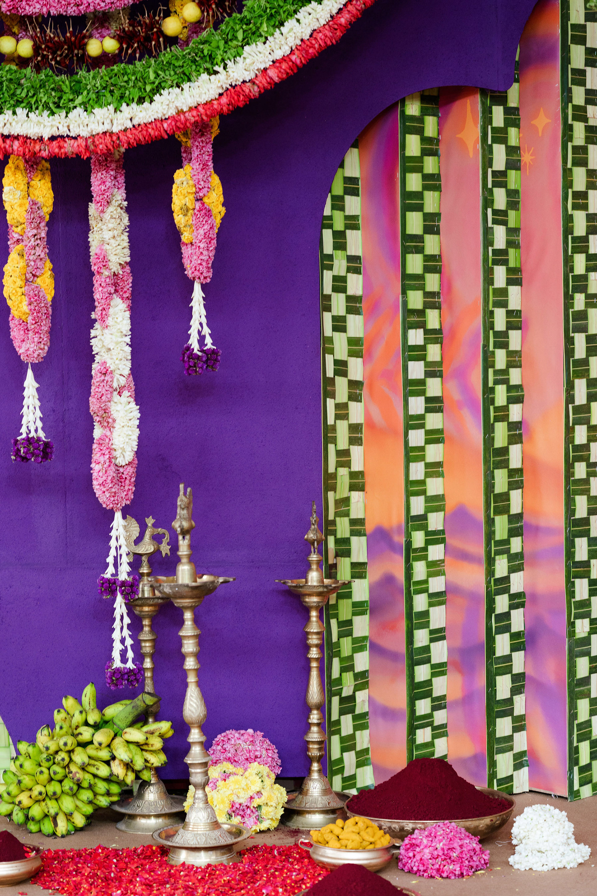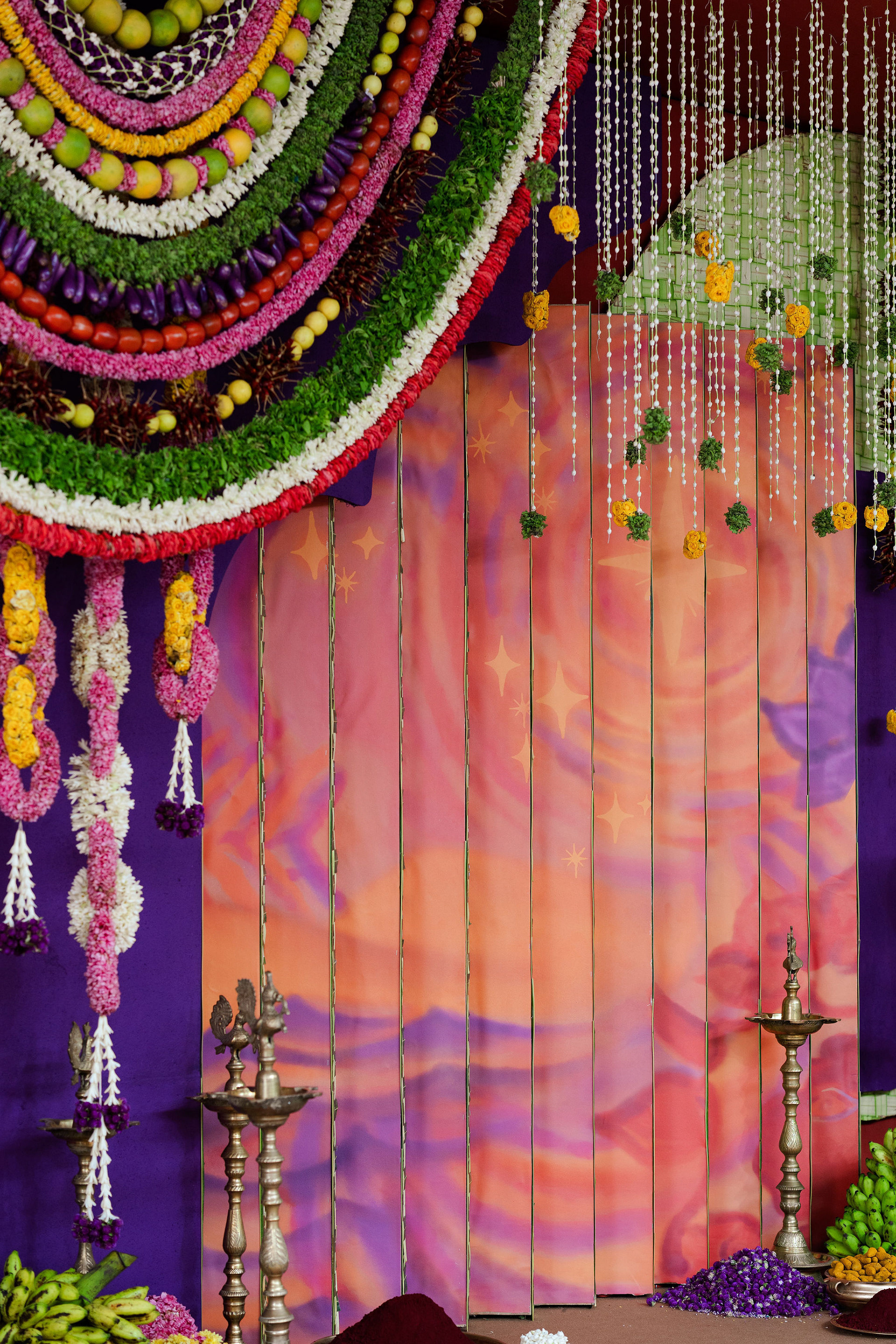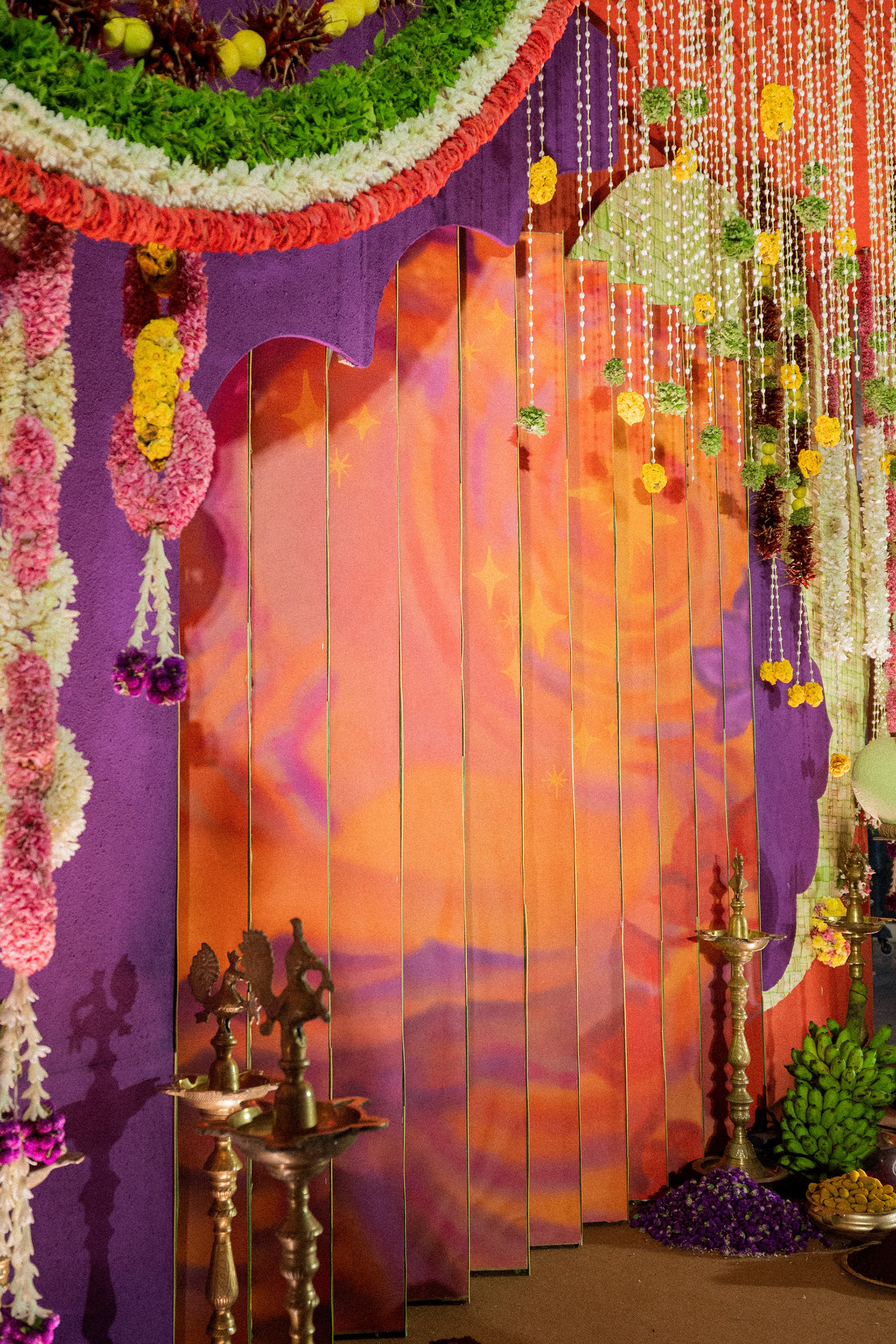 The moment we stepped into the Selvanayagi Amman temple, the space gently claimed us. What began as a venue became our compass for Yashu and Guha’s wedding. Its stone, its silence, its spirit guided every gesture of design. We shaped a hand-crafted backdrop that felt like it belonged there. Garlands of fruits, vegetables and chillies paid homage to Selvanayagi Amman. Our illustrations drew their warmth from the temple’s age-old murals and sculptures. And quietly, we wove the couple’s story into the stage through an accordion panel. From one side, their illustrated journey revealed itself. From another, the tenderness of the coconut leaf panel revealed itself. Two perspectives. One story. A dynamic visual. To welcome them, we laid out colour-blocked kolams etched with symbols that carried their love into the space. In a setting like this, inspiration wasn’t sought. It was offered, gently and abundantly.