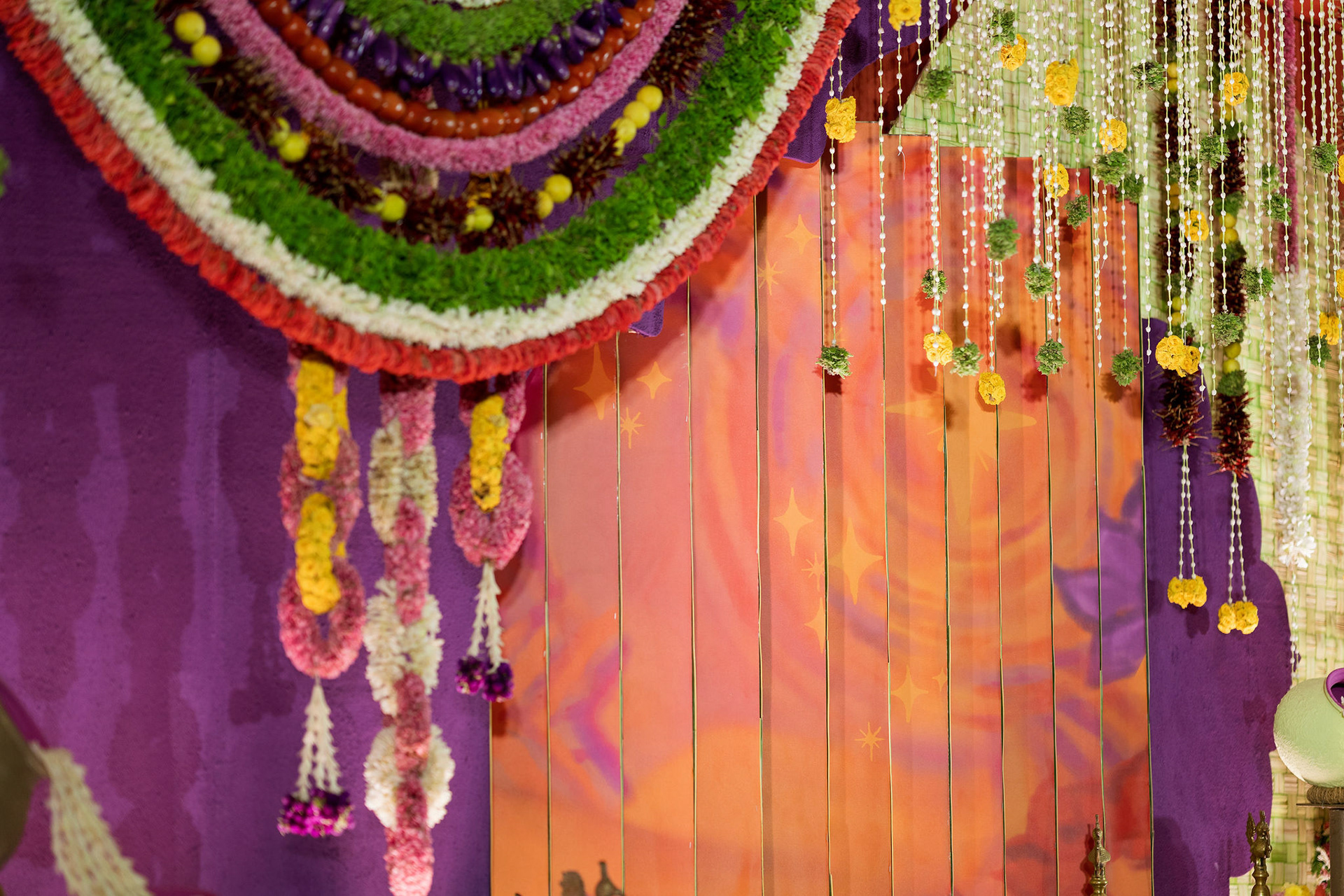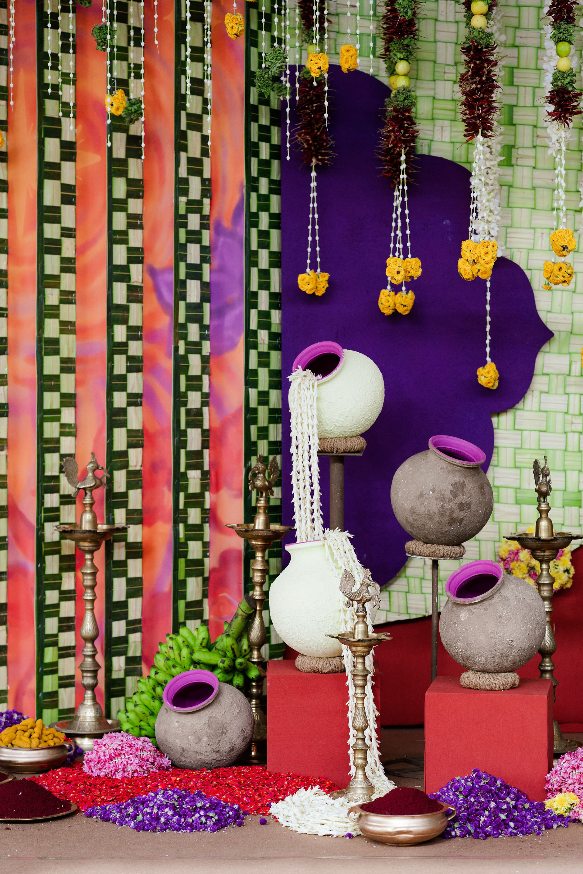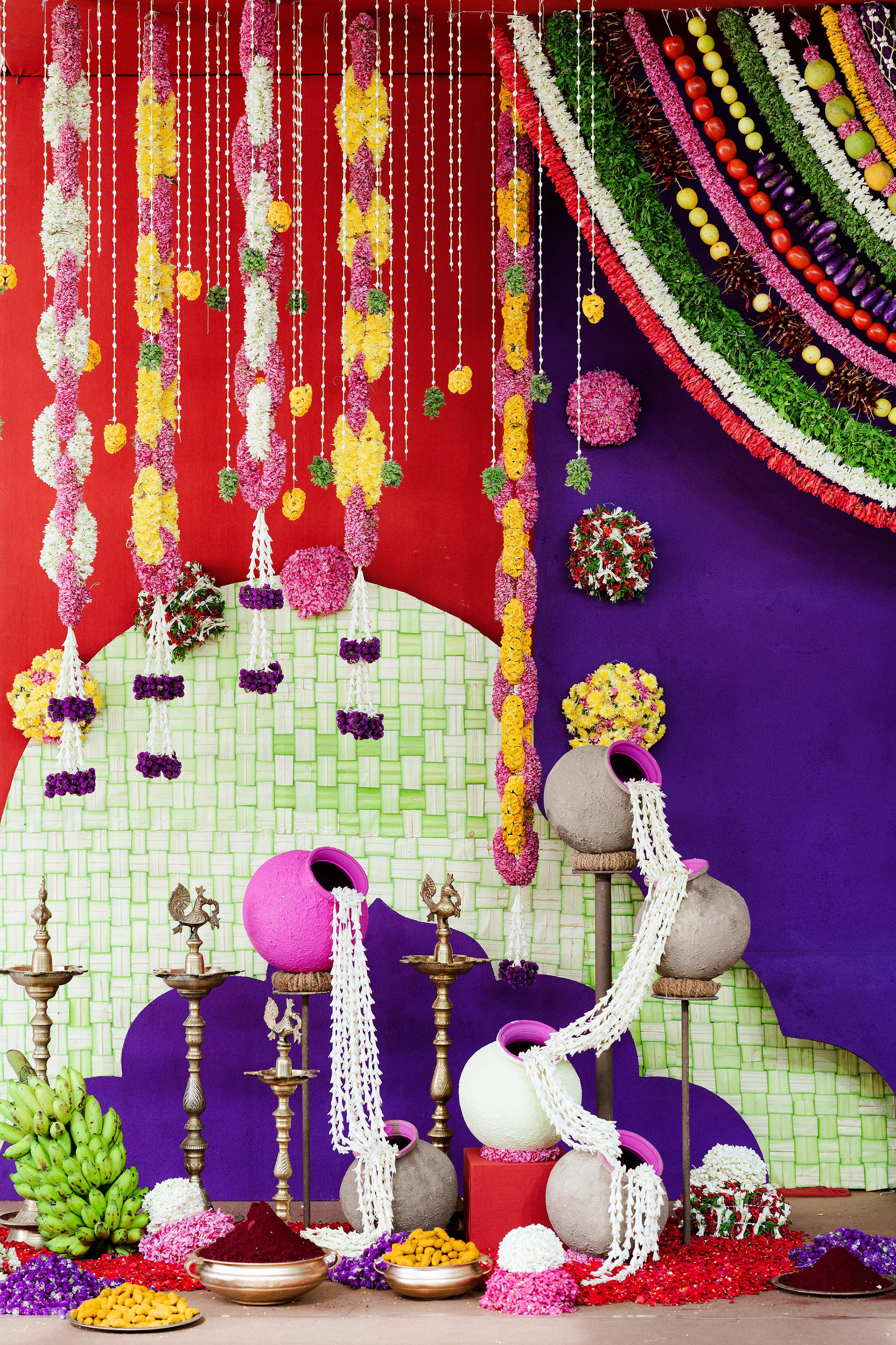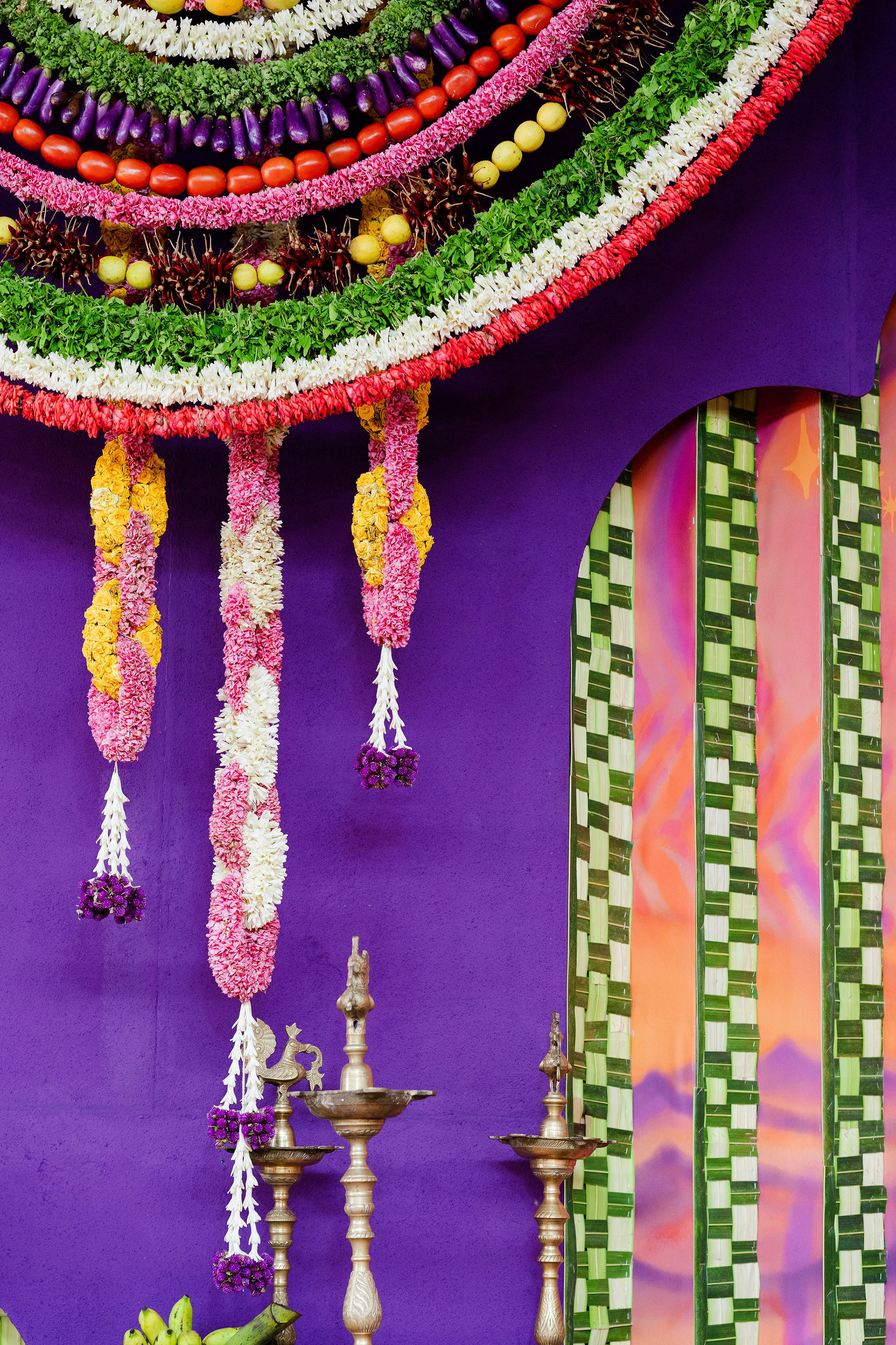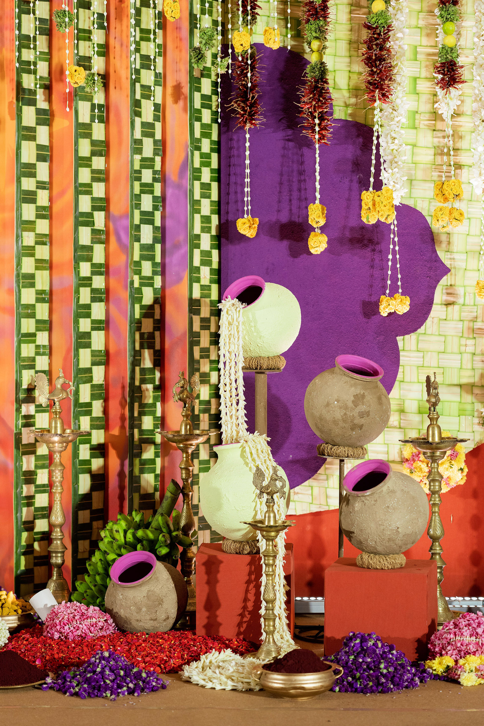 The moment we stepped into the Selvanayagi Amman temple, the space gently claimed us. What began as a venue became our compass for Yashu and Guha’s wedding. Its stone, its silence, its spirit guided every gesture of design. We shaped a hand-crafted backdrop that felt like it belonged there. Garlands of fruits, vegetables and chillies paid homage to Selvanayagi Amman. Our illustrations drew their warmth from the temple’s age-old murals and sculptures. And quietly, we wove the couple’s story into the stage through an accordion panel. From one side, their illustrated journey revealed itself. From another, the tenderness of the coconut leaf panel revealed itself. Two perspectives. One story. A dynamic visual. To welcome them, we laid out colour-blocked kolams etched with symbols that carried their love into the space. In a setting like this, inspiration wasn’t sought. It was offered, gently and abundantly.