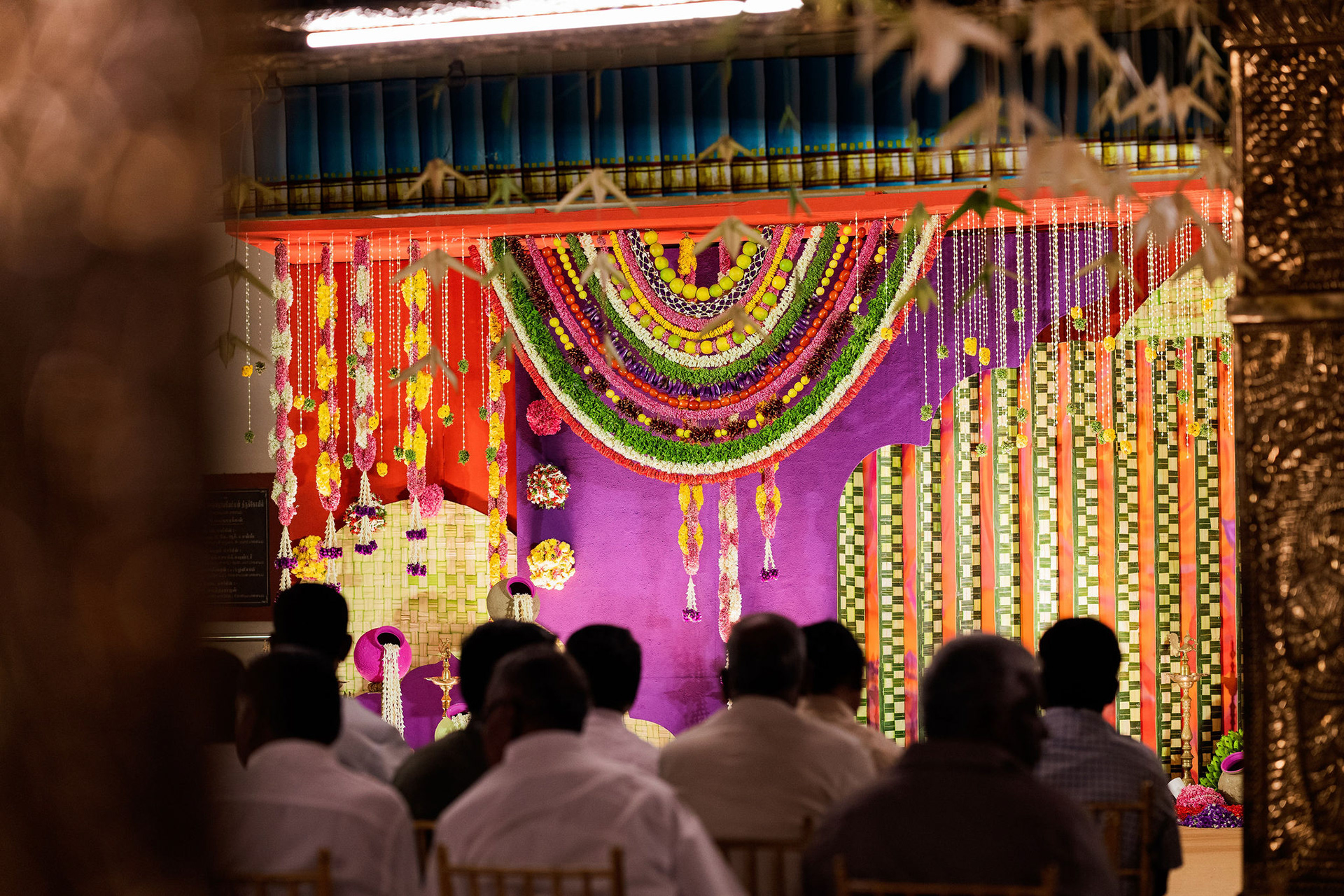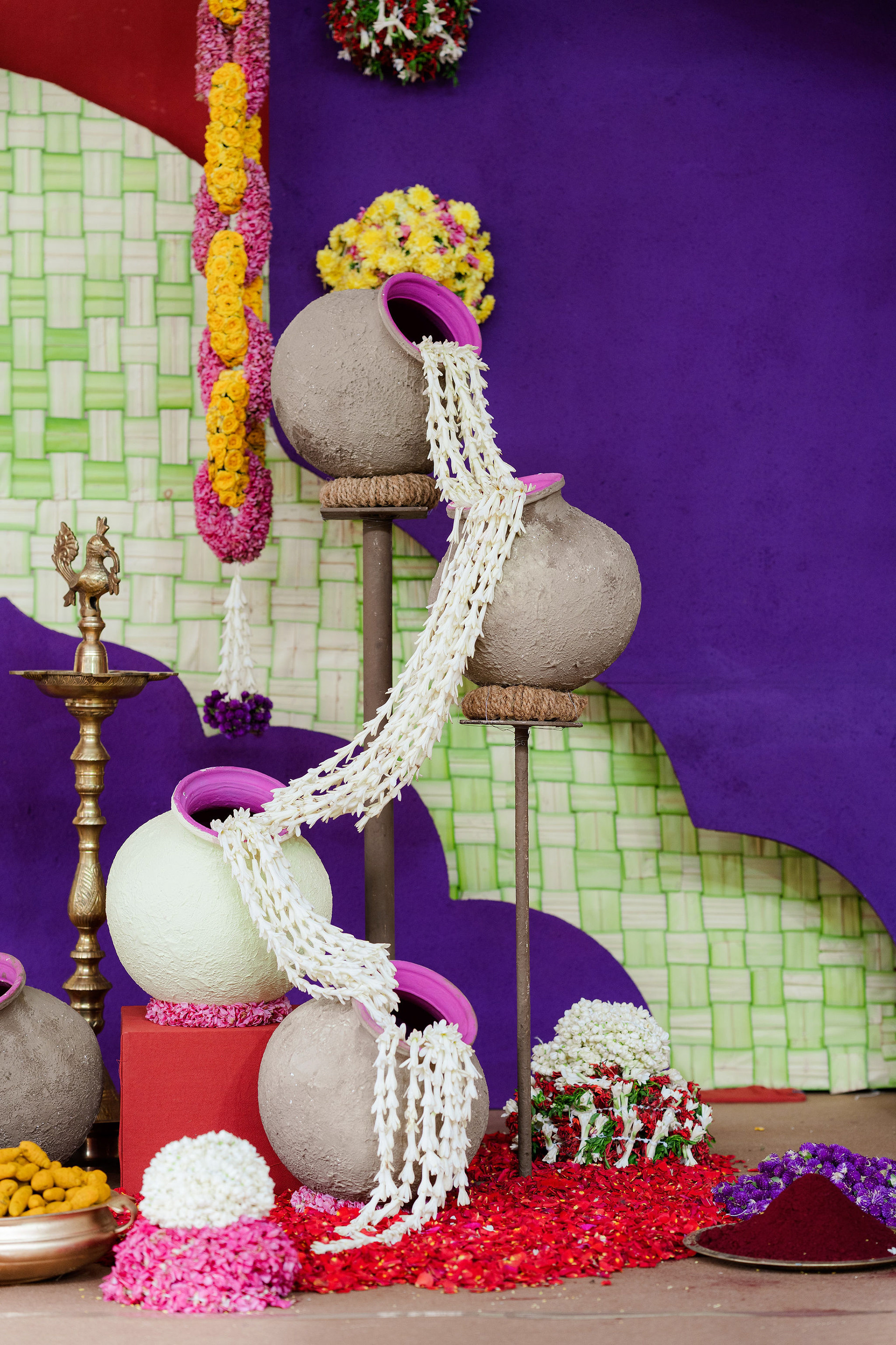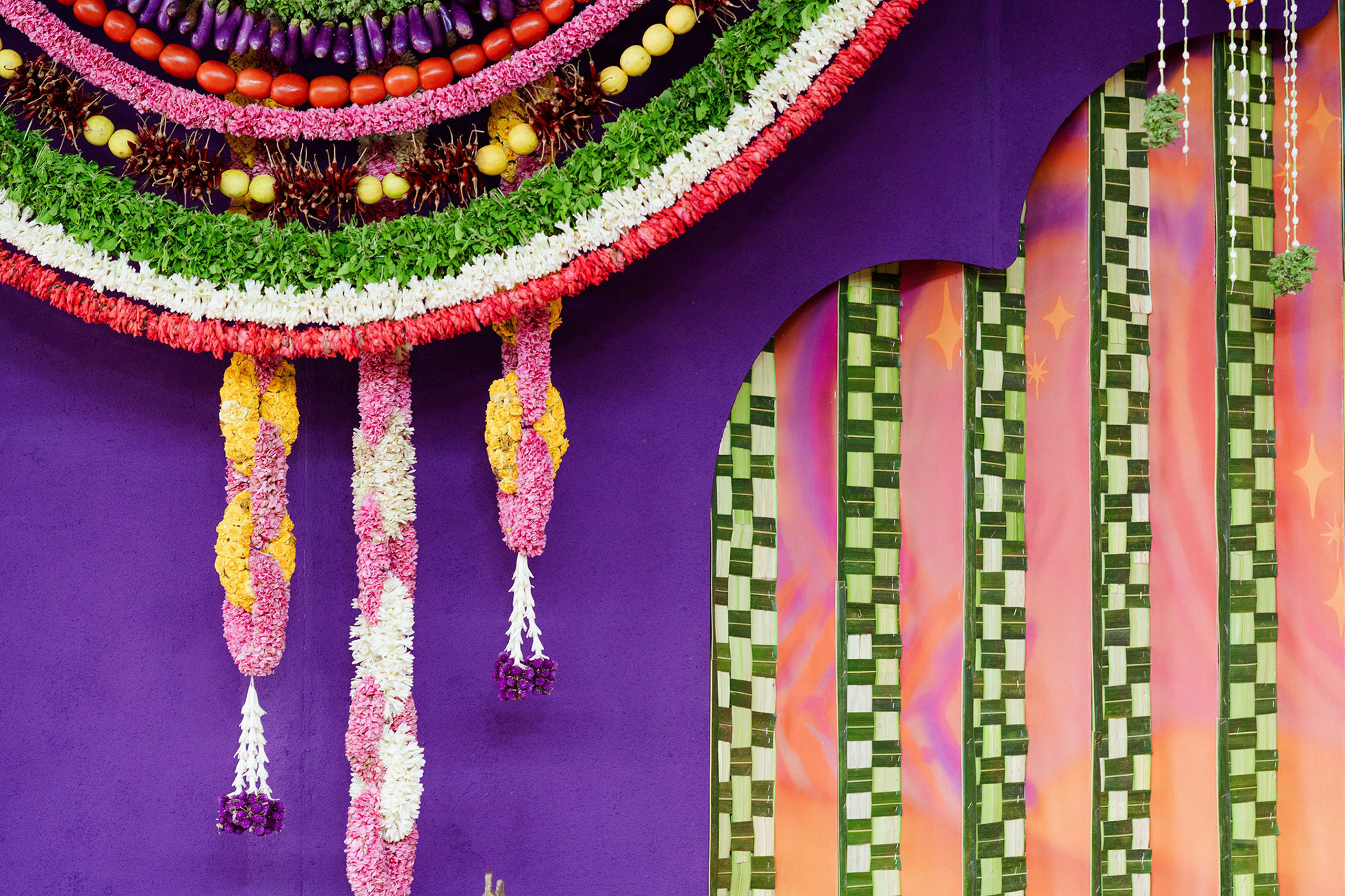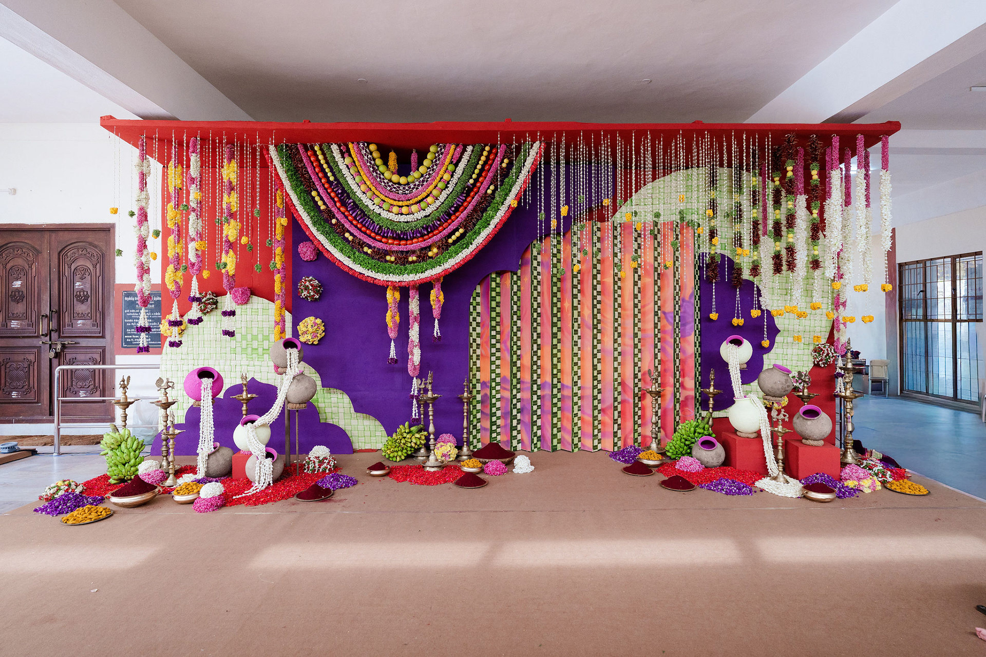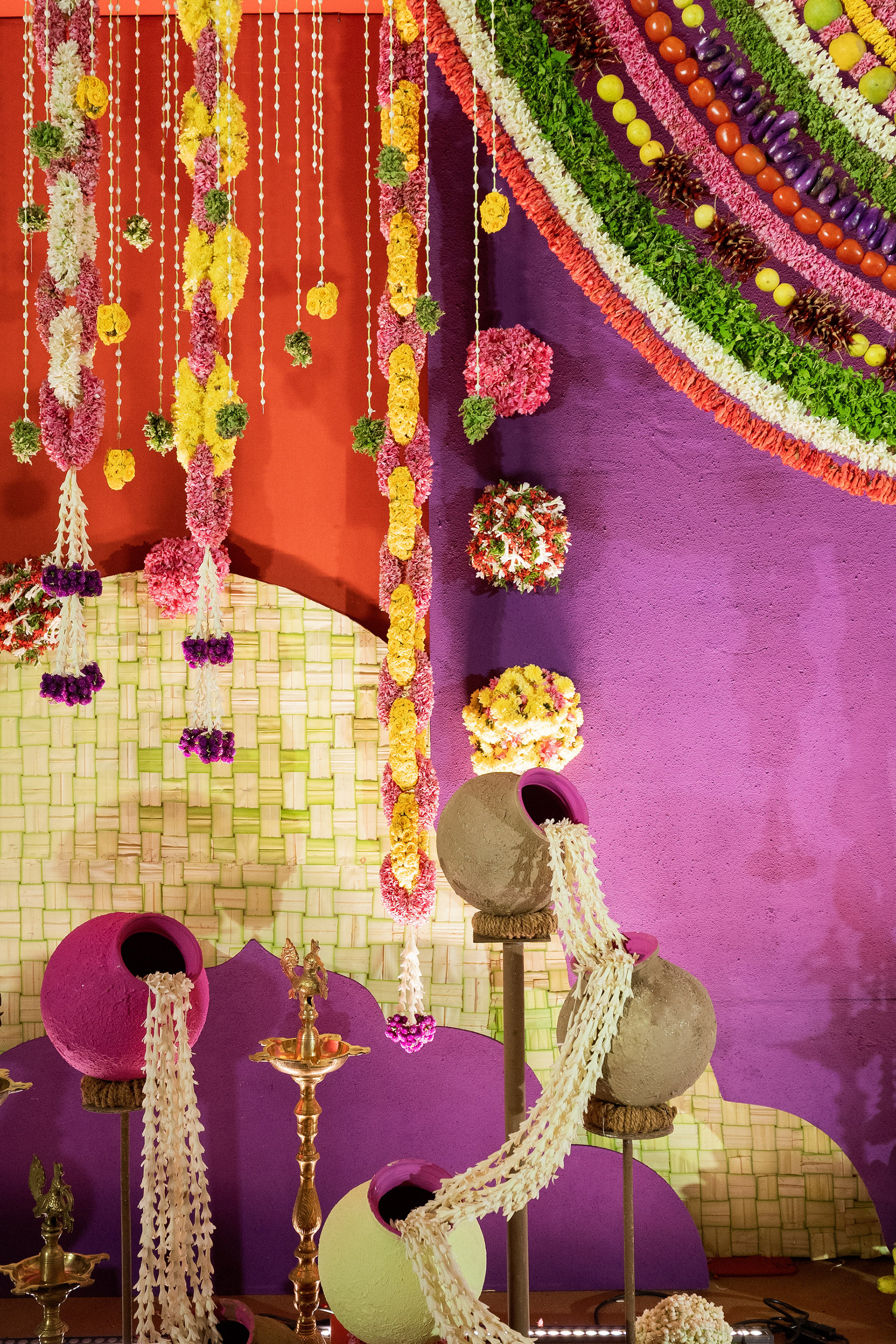 The moment we stepped into the Selvanayagi Amman temple, the space gently claimed us. What began as a venue became our compass for Yashu and Guha’s wedding. Its stone, its silence, its spirit guided every gesture of design. We shaped a hand-crafted backdrop that felt like it belonged there. Garlands of fruits, vegetables and chillies paid homage to Selvanayagi Amman. Our illustrations drew their warmth from the temple’s age-old murals and sculptures. And quietly, we wove the couple’s story into the stage through an accordion panel. From one side, their illustrated journey revealed itself. From another, the tenderness of the coconut leaf panel revealed itself. Two perspectives. One story. A dynamic visual. To welcome them, we laid out colour-blocked kolams etched with symbols that carried their love into the space. In a setting like this, inspiration wasn’t sought. It was offered, gently and abundantly.