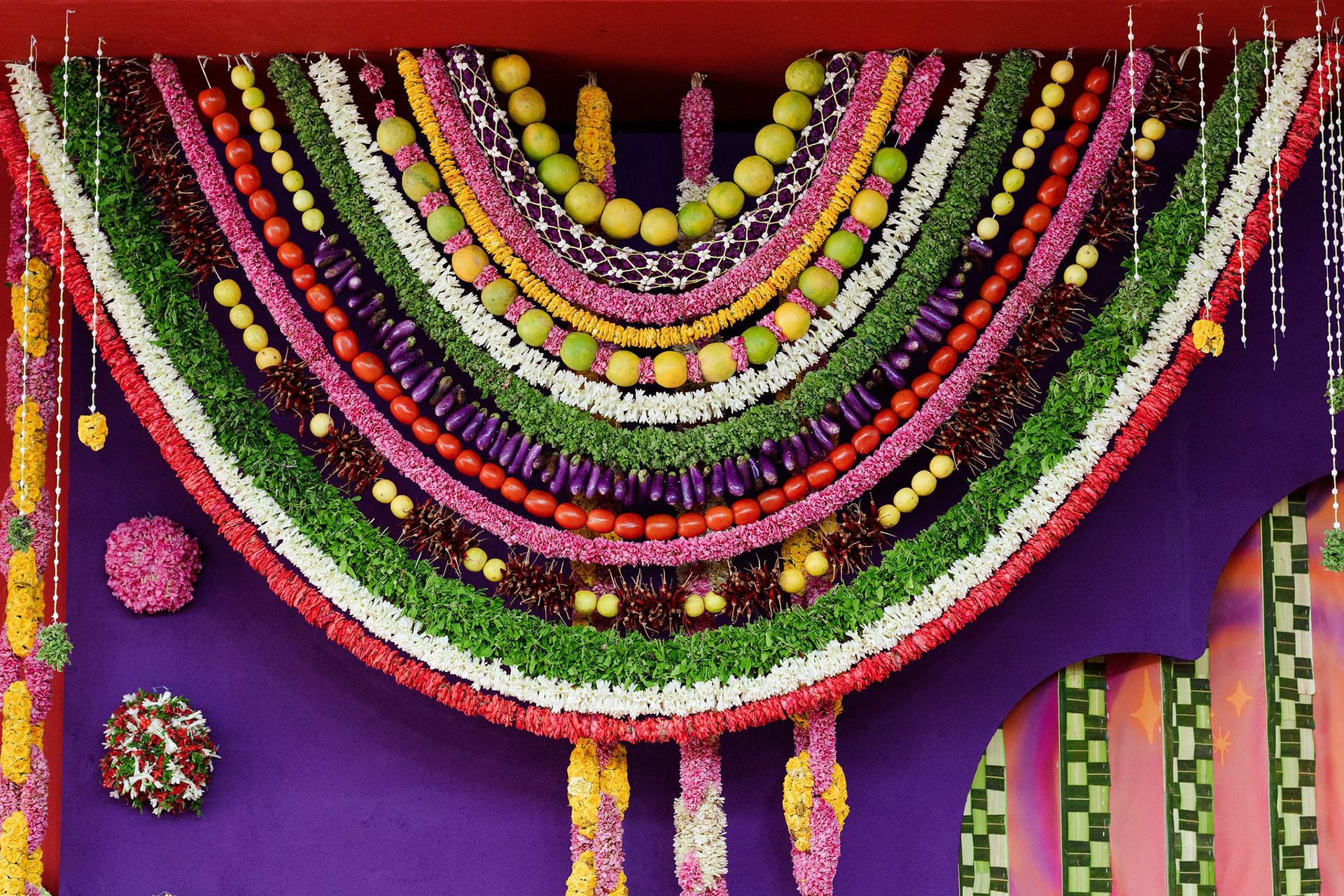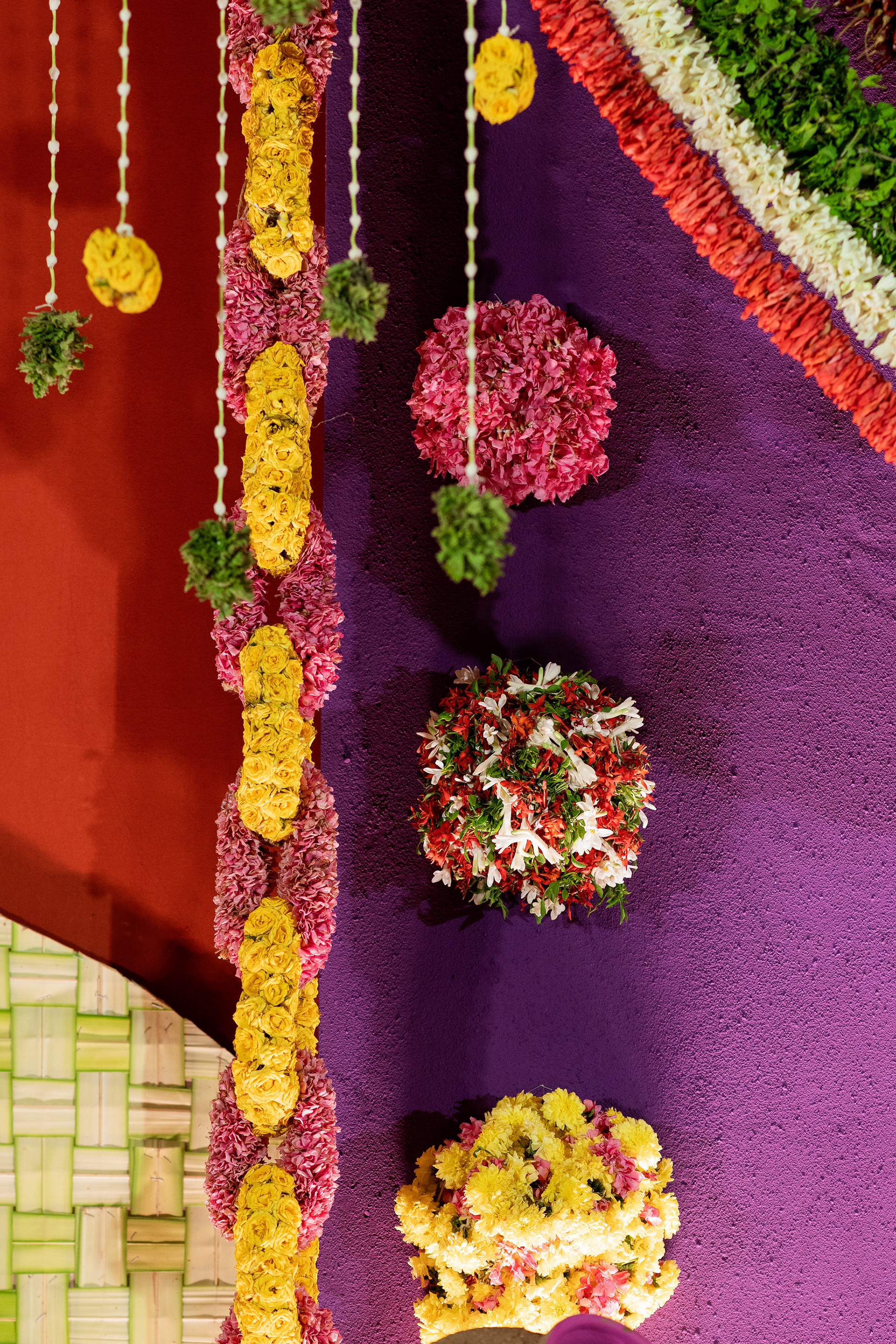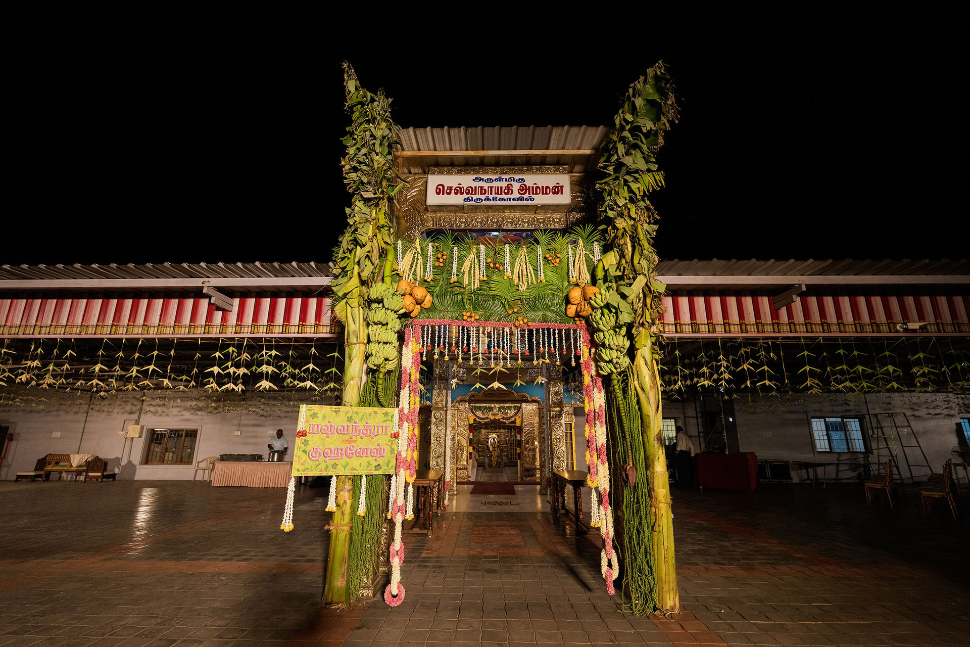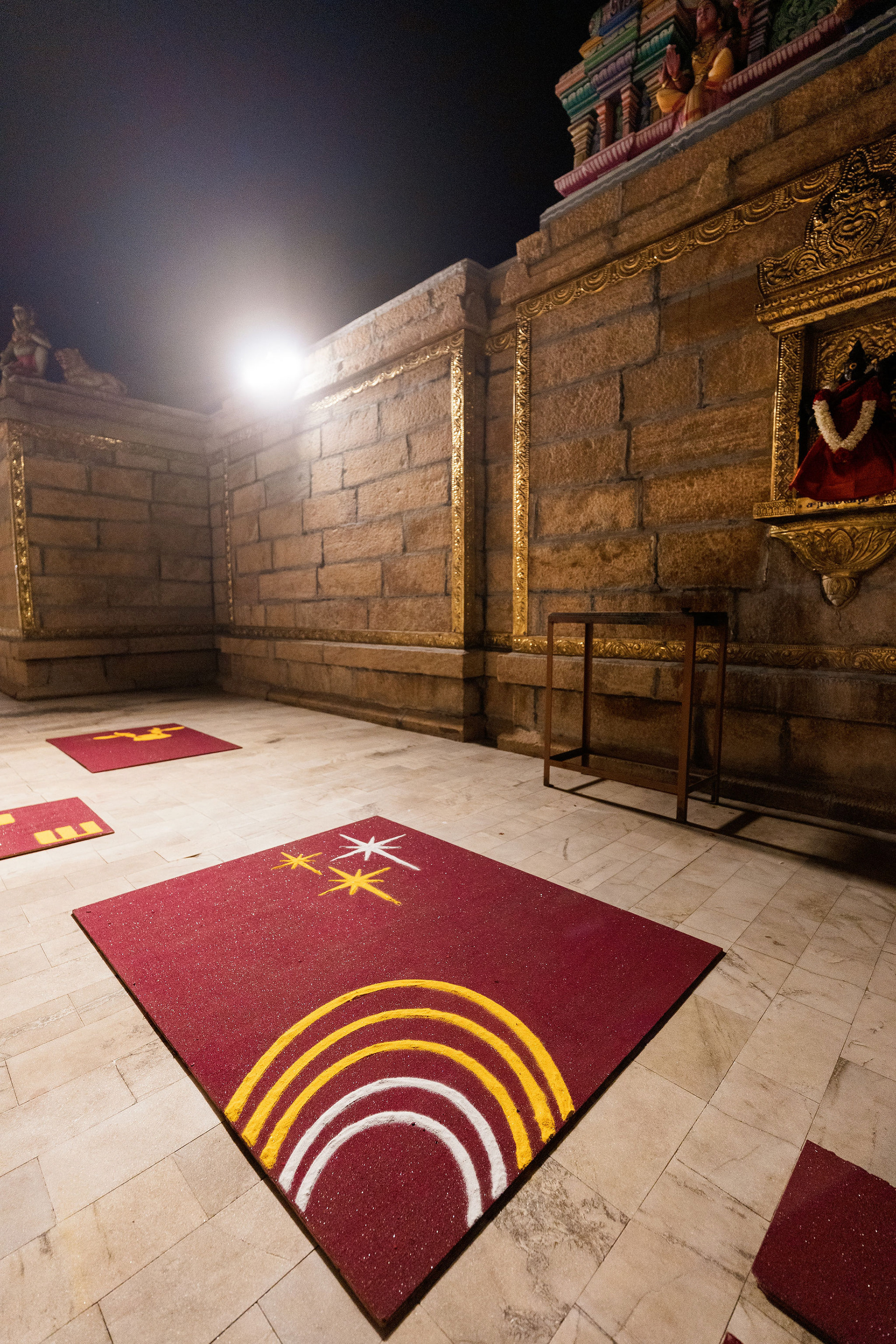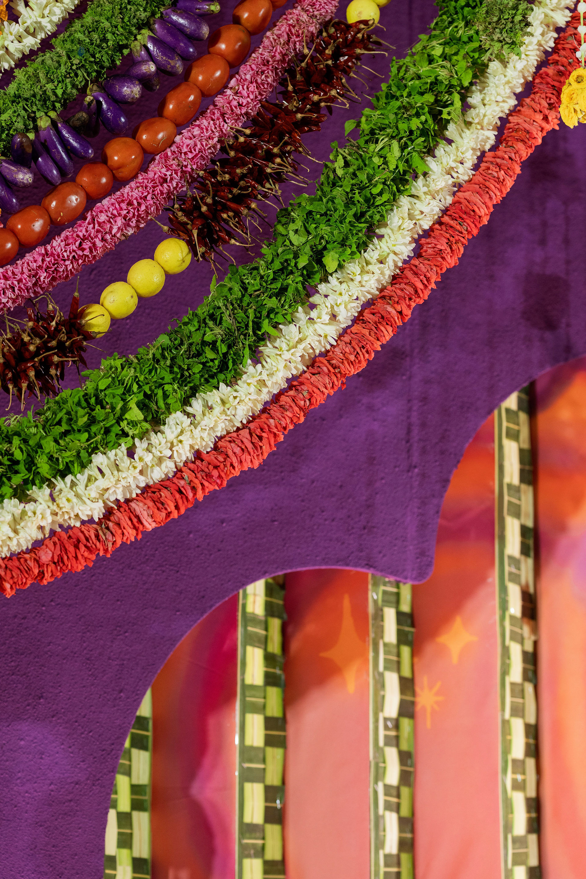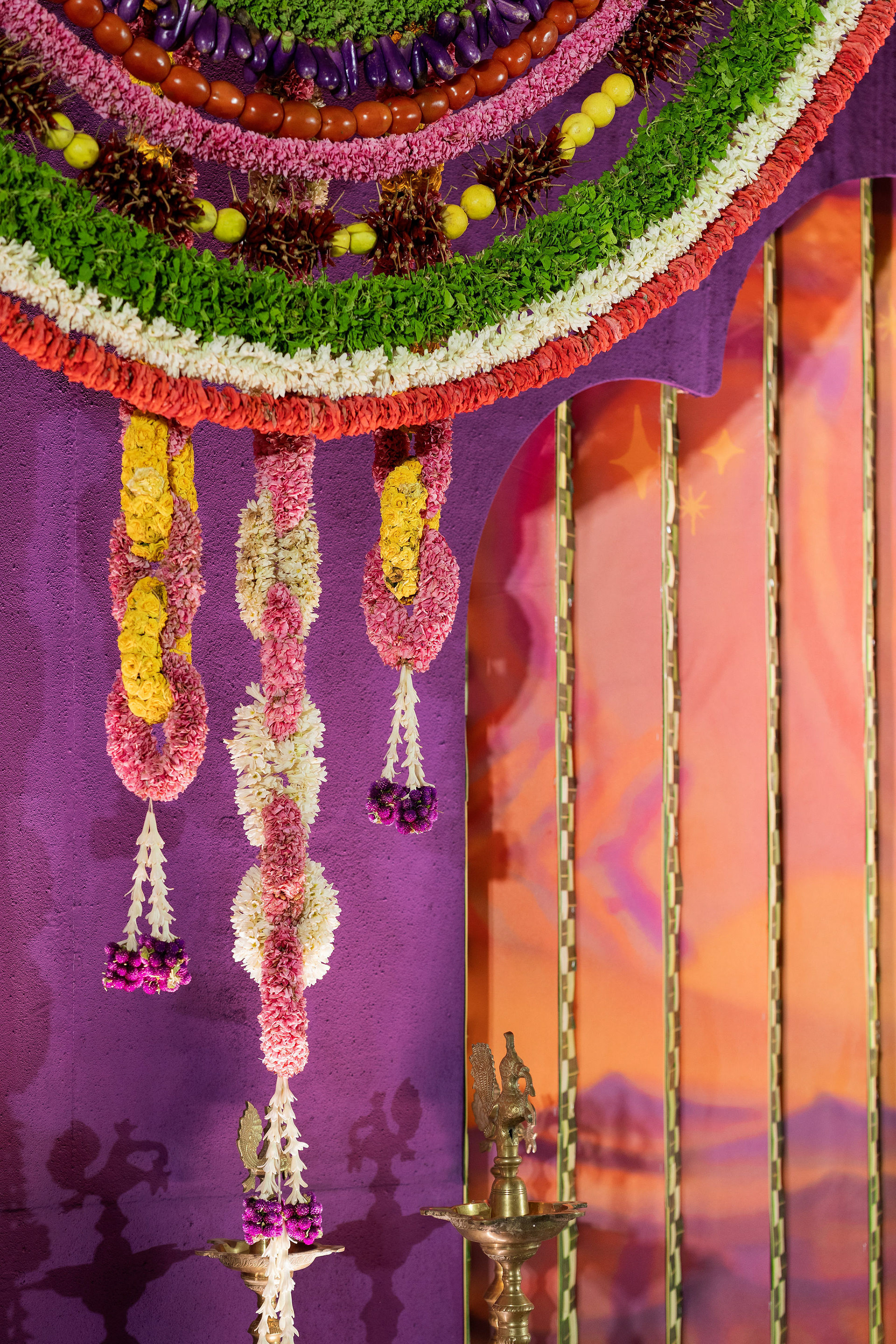 The moment we stepped into the Selvanayagi Amman temple, the space gently claimed us. What began as a venue became our compass for Yashu and Guha’s wedding. Its stone, its silence, its spirit guided every gesture of design. We shaped a hand-crafted backdrop that felt like it belonged there. Garlands of fruits, vegetables and chillies paid homage to Selvanayagi Amman. Our illustrations drew their warmth from the temple’s age-old murals and sculptures. And quietly, we wove the couple’s story into the stage through an accordion panel. From one side, their illustrated journey revealed itself. From another, the tenderness of the coconut leaf panel revealed itself. Two perspectives. One story. A dynamic visual. To welcome them, we laid out colour-blocked kolams etched with symbols that carried their love into the space. In a setting like this, inspiration wasn’t sought. It was offered, gently and abundantly.