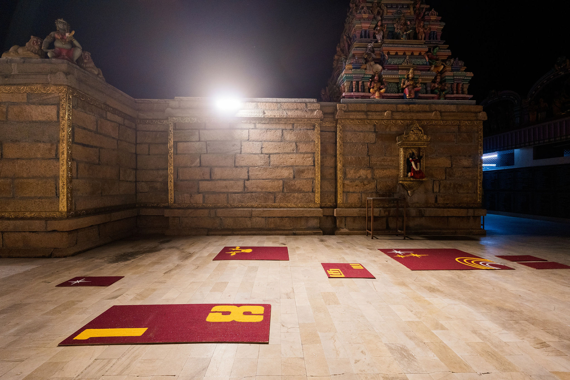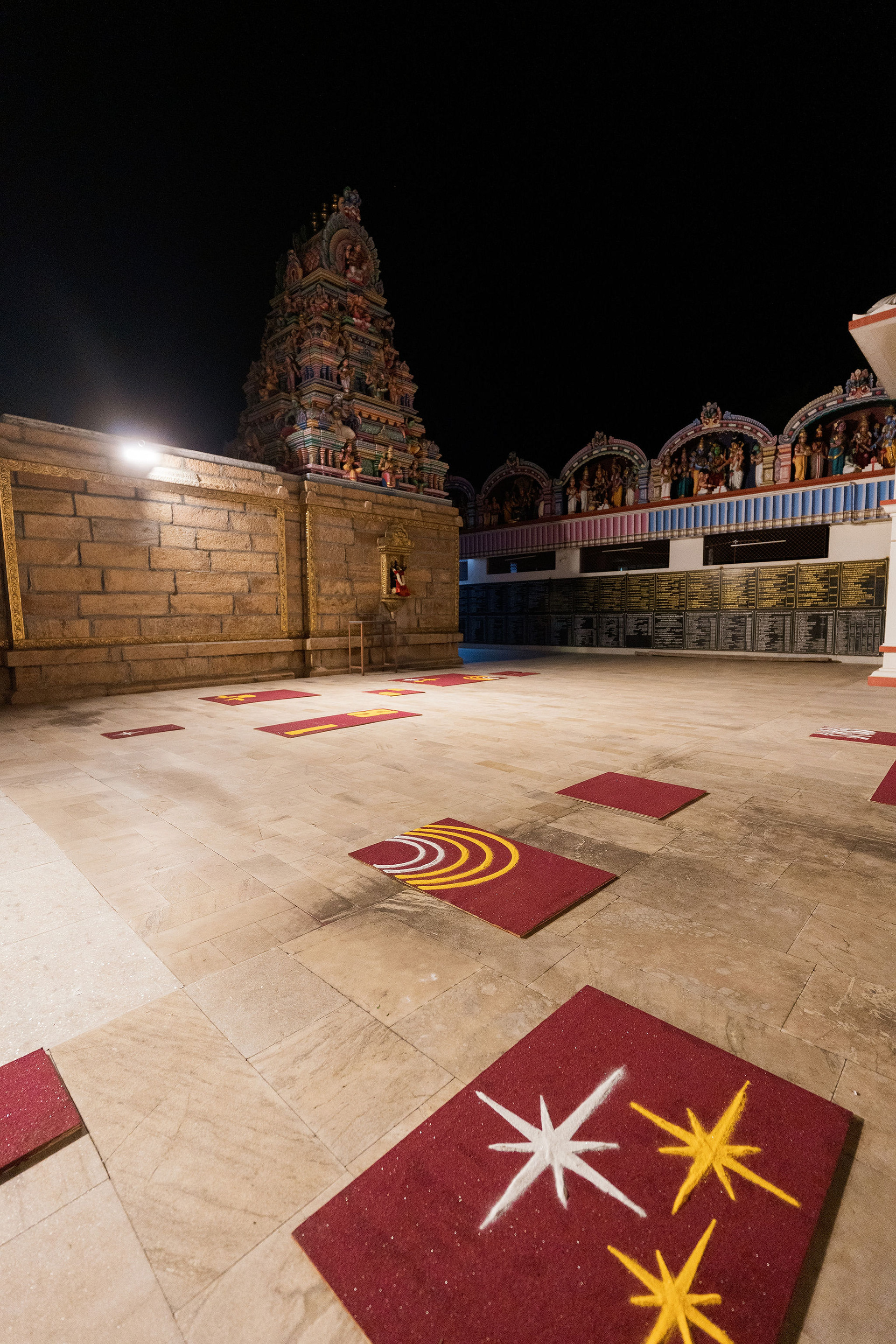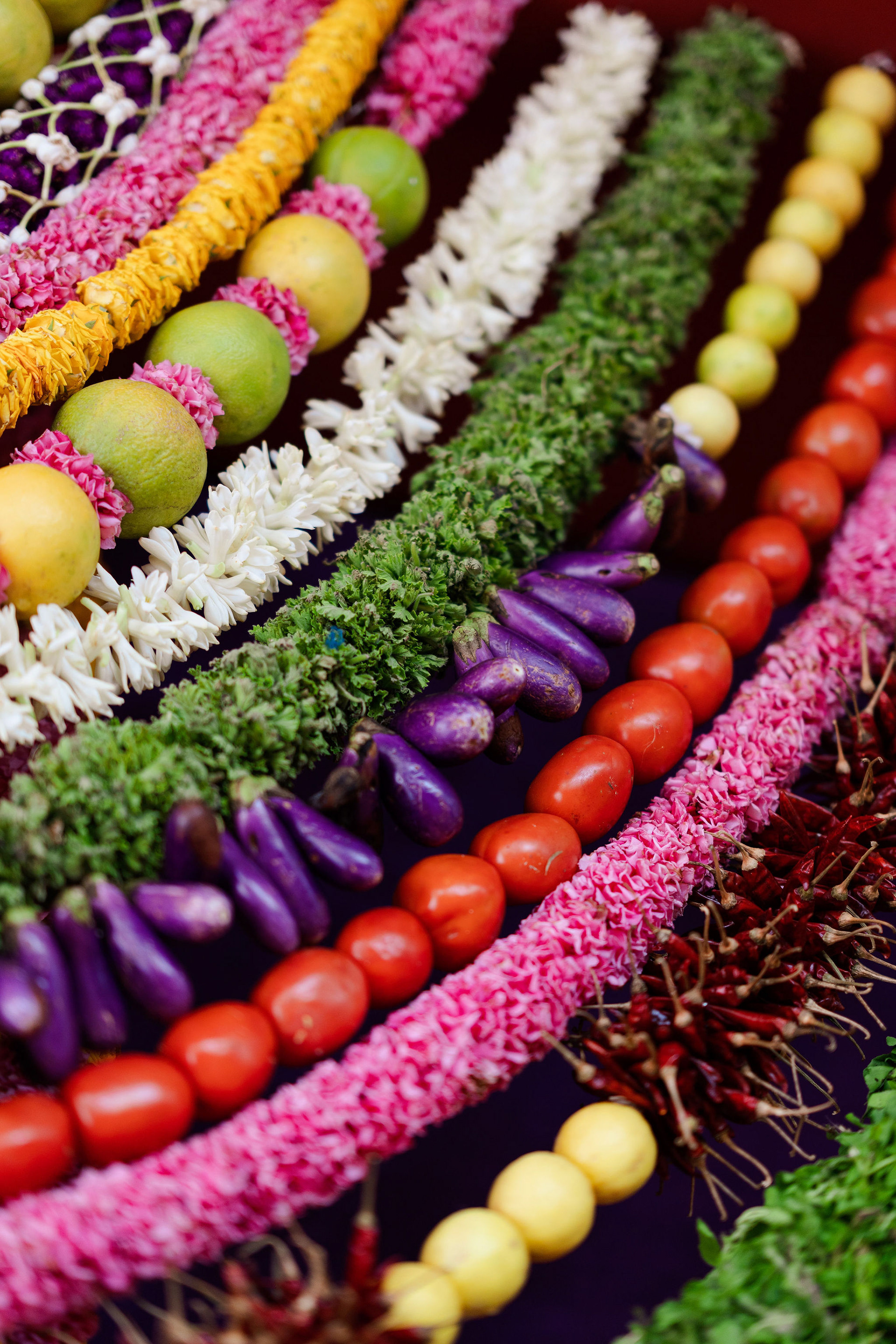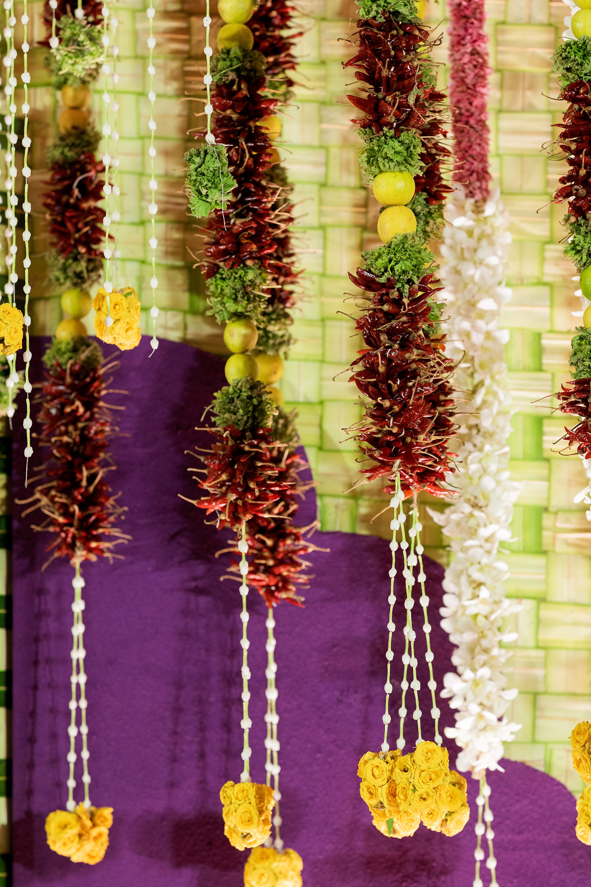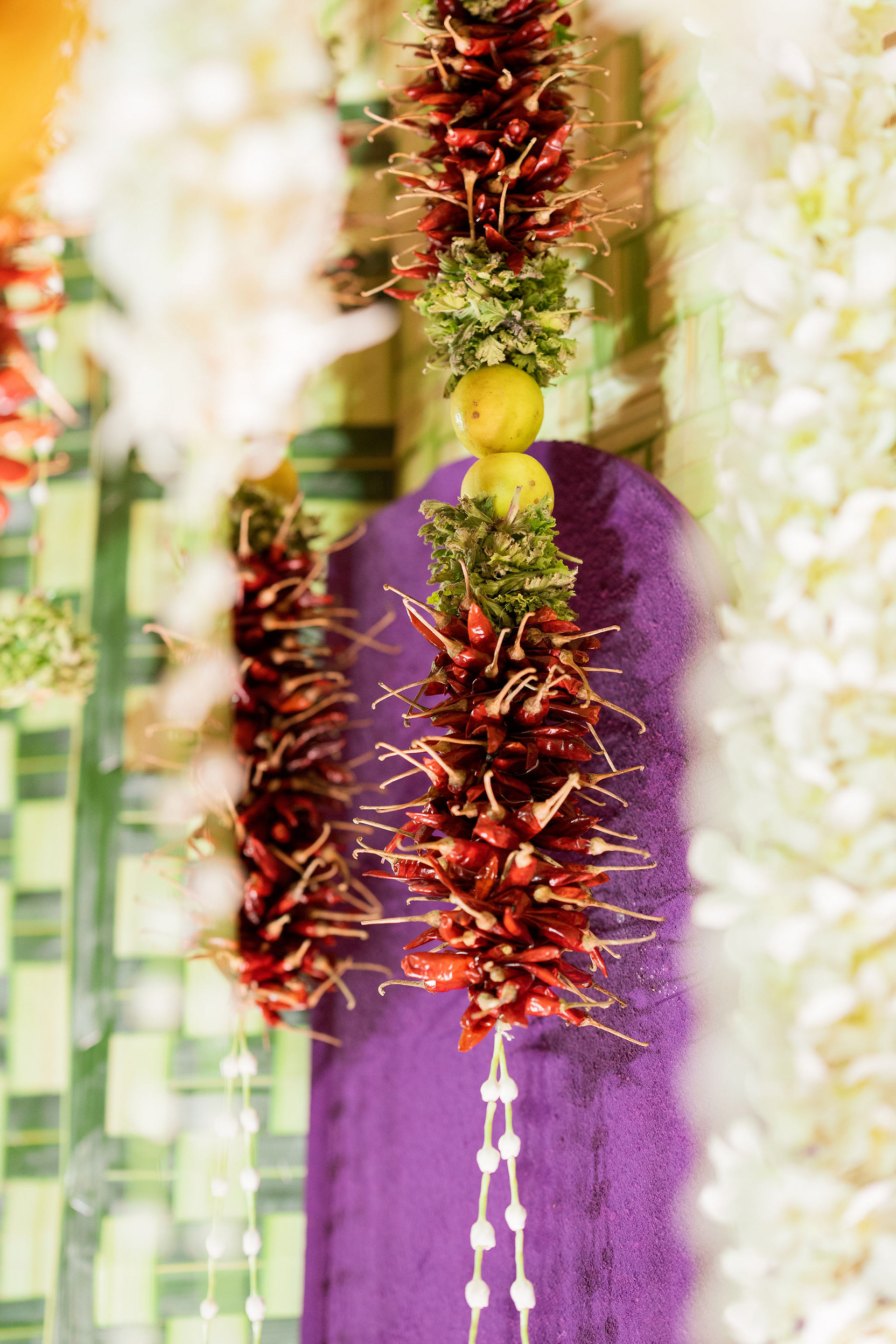The moment we stepped into the Selvanayagi Amman temple, the space gently claimed us. What began as a venue became our compass for Yashu and Guha’s wedding. Its stone, its silence, its spirit guided every gesture of design. We shaped a hand-crafted backdrop that felt like it belonged there. Garlands of fruits, vegetables and chillies paid homage to Selvanayagi Amman. Our illustrations drew their warmth from the temple’s age-old murals and sculptures. And quietly, we wove the couple’s story into the stage through an accordion panel. From one side, their illustrated journey revealed itself. From another, the tenderness of the coconut leaf panel revealed itself. Two perspectives. One story. A dynamic visual. To welcome them, we laid out colour-blocked kolams etched with symbols that carried their love into the space. In a setting like this, inspiration wasn’t sought. It was offered, gently and abundantly.