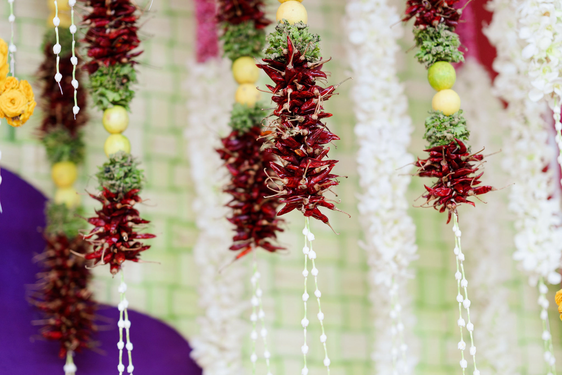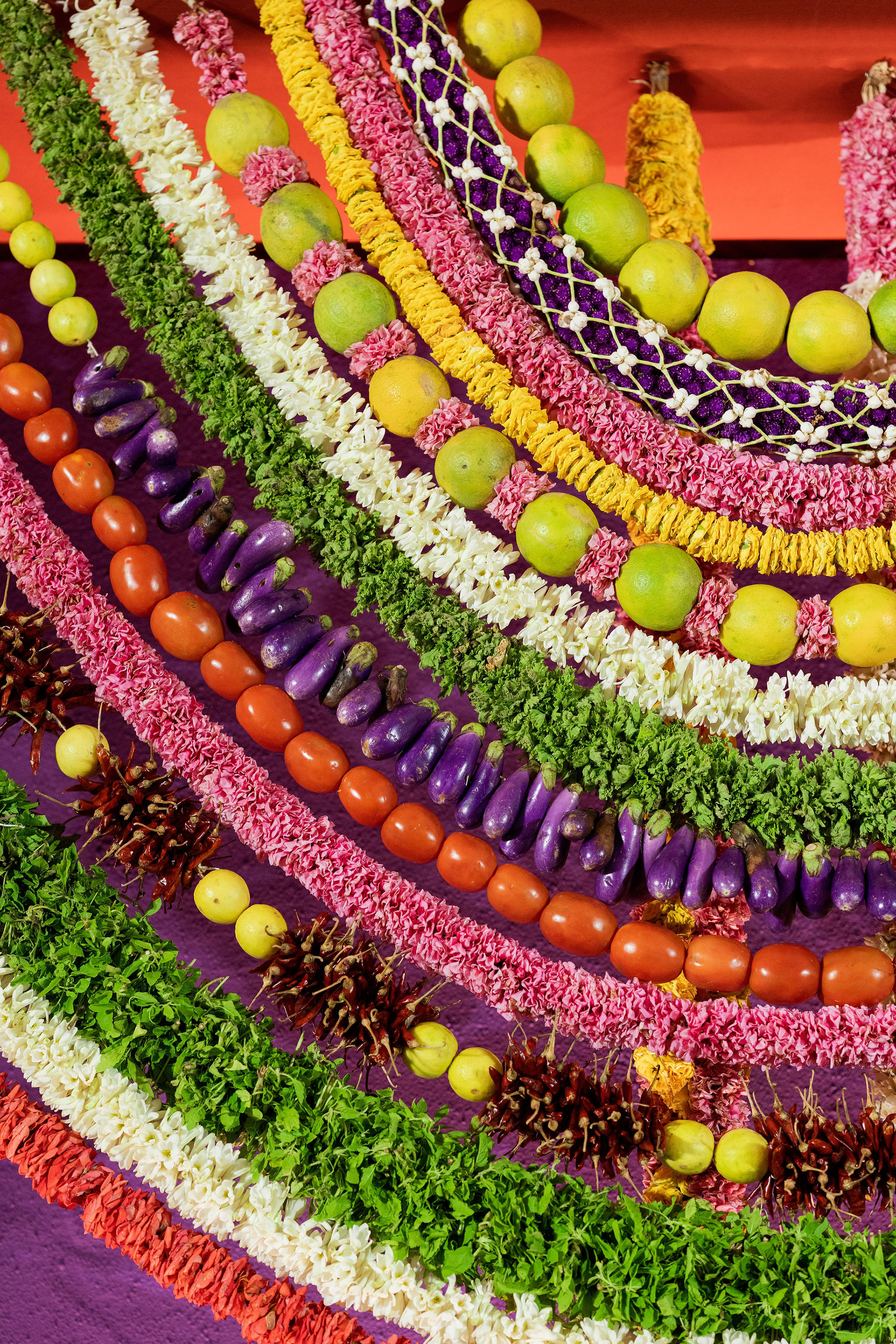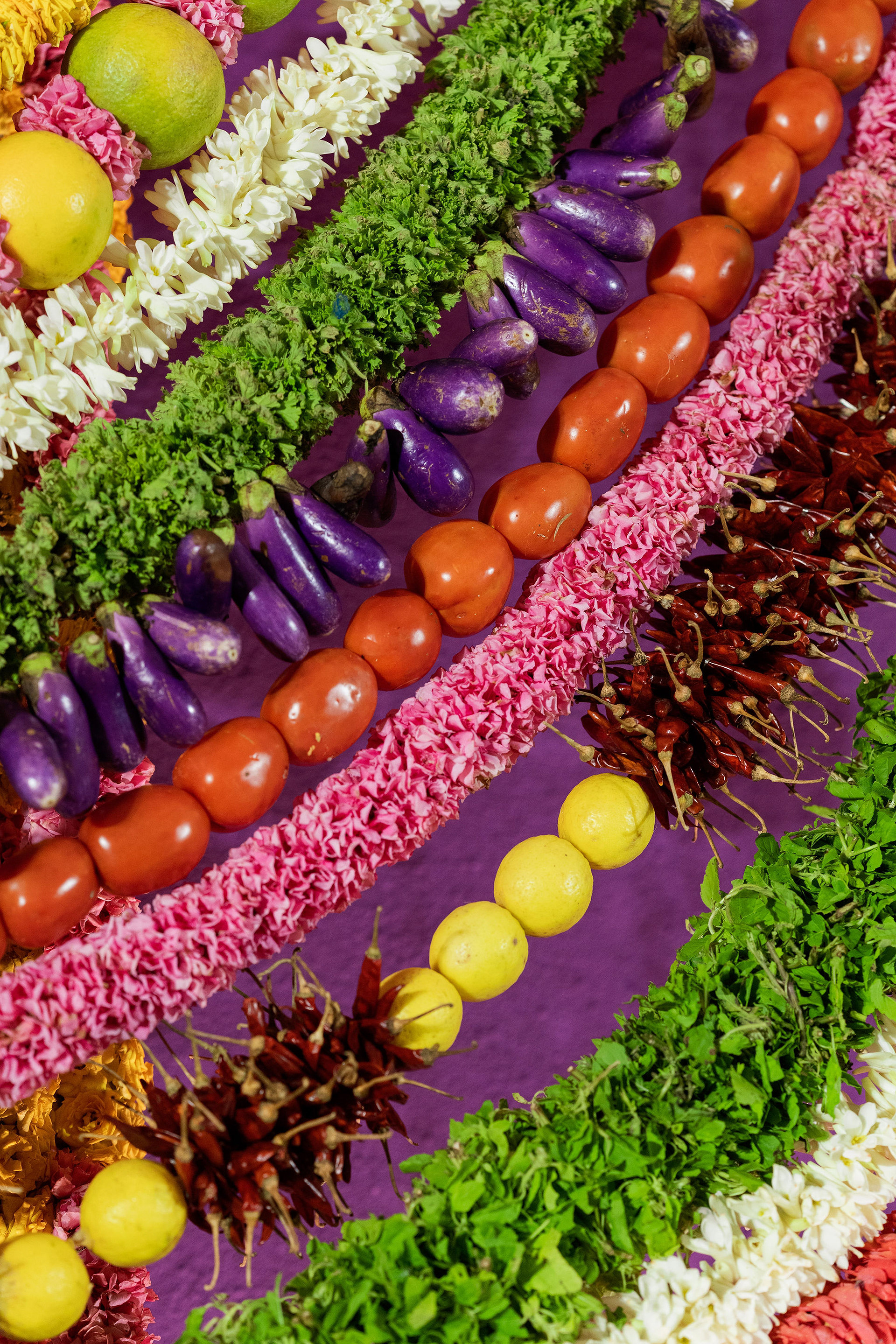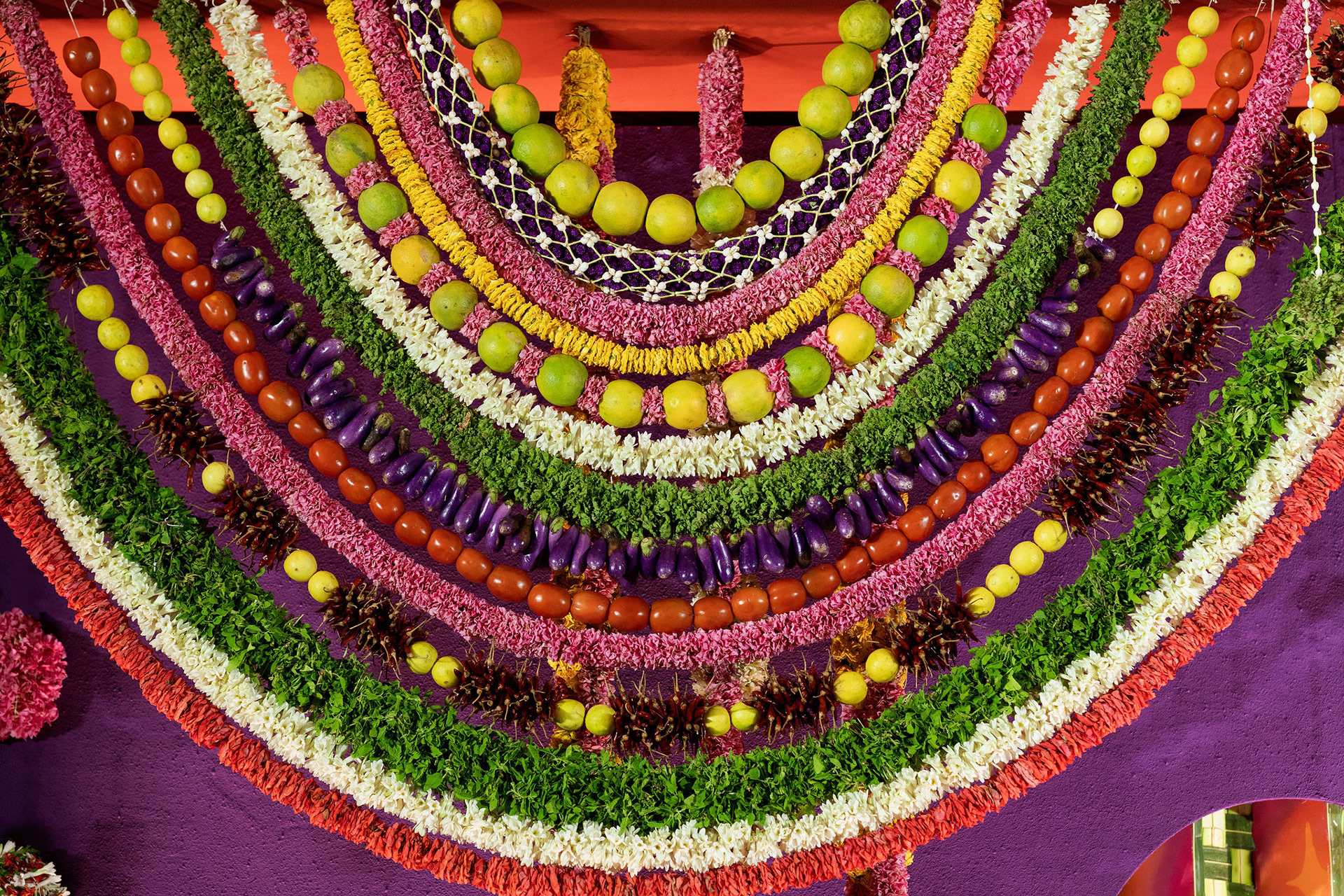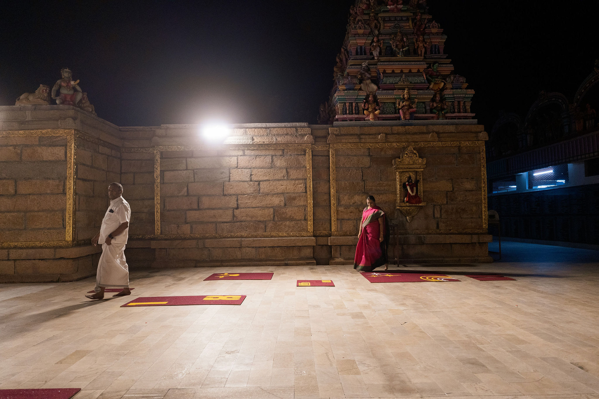 The moment we stepped into the Selvanayagi Amman temple, the space gently claimed us. What began as a venue became our compass for Yashu and Guha’s wedding. Its stone, its silence, its spirit guided every gesture of design. We shaped a hand-crafted backdrop that felt like it belonged there. Garlands of fruits, vegetables and chillies paid homage to Selvanayagi Amman. Our illustrations drew their warmth from the temple’s age-old murals and sculptures. And quietly, we wove the couple’s story into the stage through an accordion panel. From one side, their illustrated journey revealed itself. From another, the tenderness of the coconut leaf panel revealed itself. Two perspectives. One story. A dynamic visual. To welcome them, we laid out colour-blocked kolams etched with symbols that carried their love into the space. In a setting like this, inspiration wasn’t sought. It was offered, gently and abundantly.