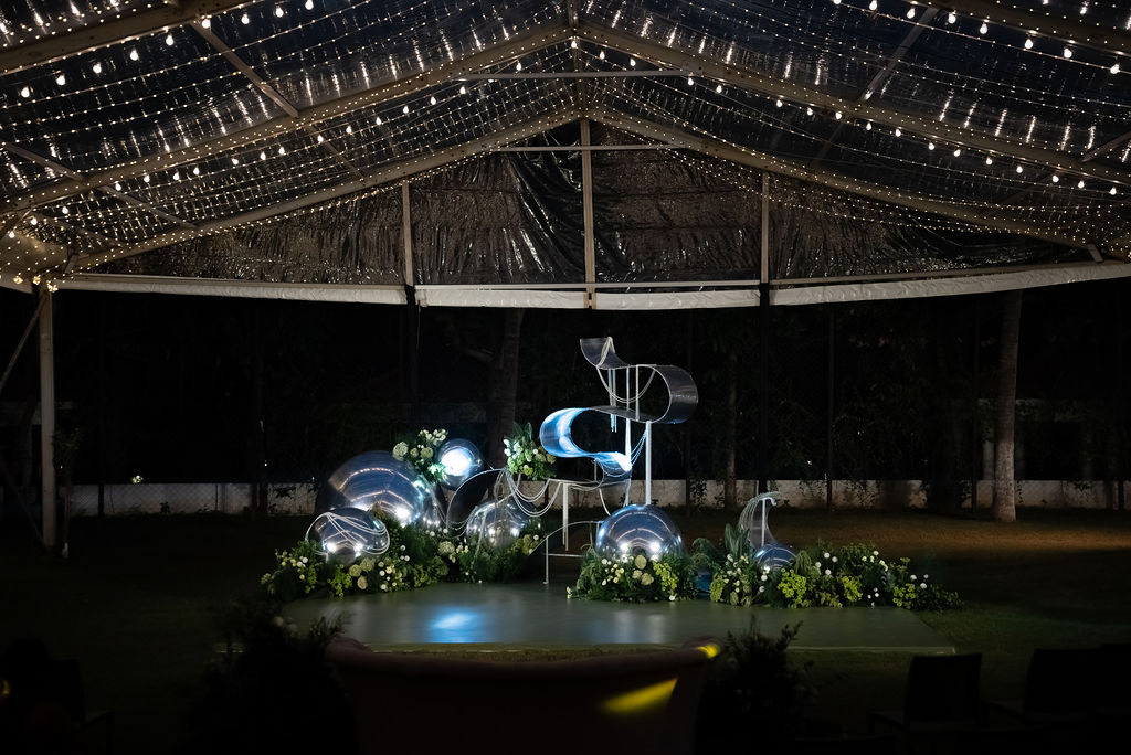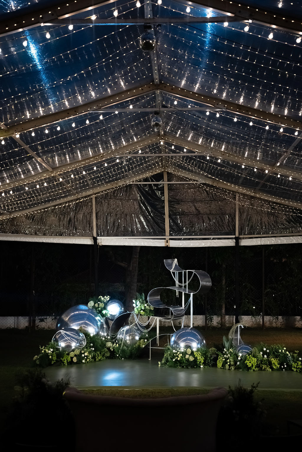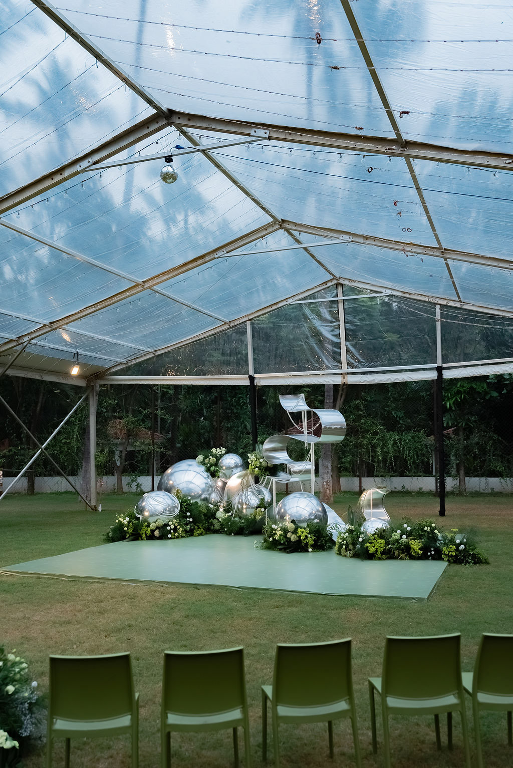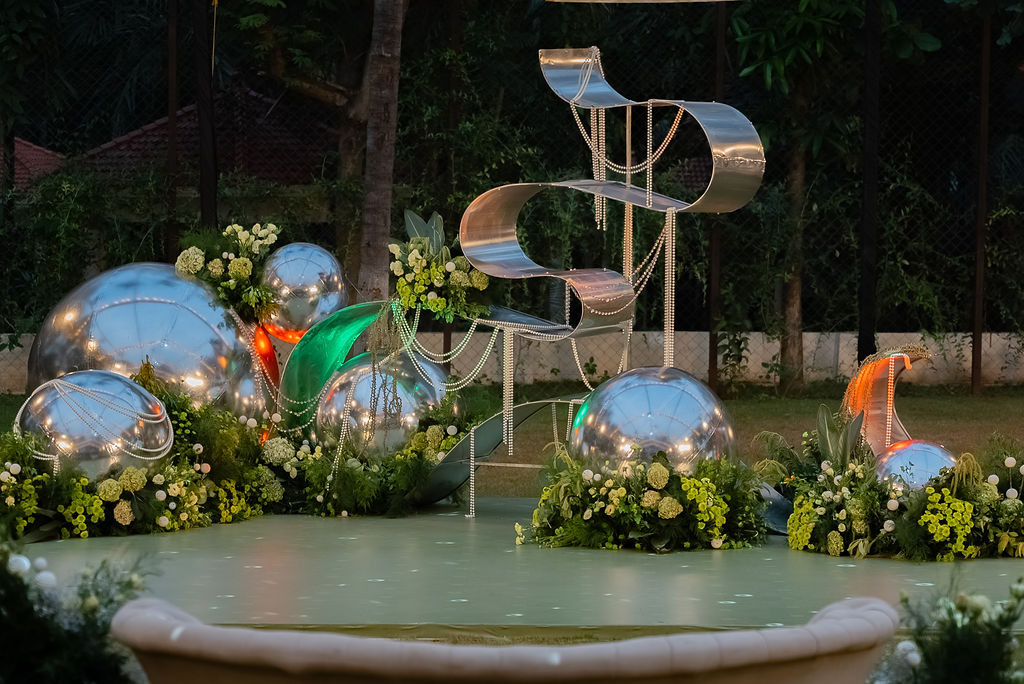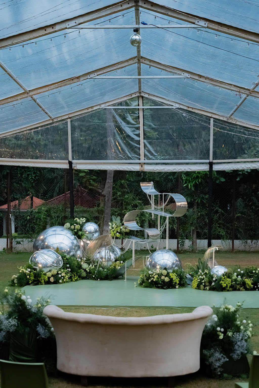 For Khanishkaa and Aadhi’s Sangeeth, we chose monotones to create a canvas that allowed the couple to truly shine. The intention was to build a backdrop that felt both subtle and striking, quietly holding space while still making a statement. Layers of green ran through the florals and the dance floor, grounding the design in the open lawn and allowing the landscape to become part of the story. Sculptural metal forms and reflective spheres introduced movement and light, catching every glow and amplifying the joy of the night. Pearl strings and crystal details were woven through the structure, adding depth, drama and a quiet richness to the backdrop. As the music played and the couple danced, the curved metallic forms and the reflective elements seemed to move with them, responding to rhythm, light and celebration. The backdrop knew when to stand out and when to soften, gently framing the couple against the green lawn, the open canopy above, and the tranquil hills beyond Coimbatore. A space designed to hold celebration without overpowering it. A canvas that let love take centre stage. Decor design by @vizhamedai Production and execution by @marriagecolours Photographed by @thealaigal Venue @mangohillcoimbatore