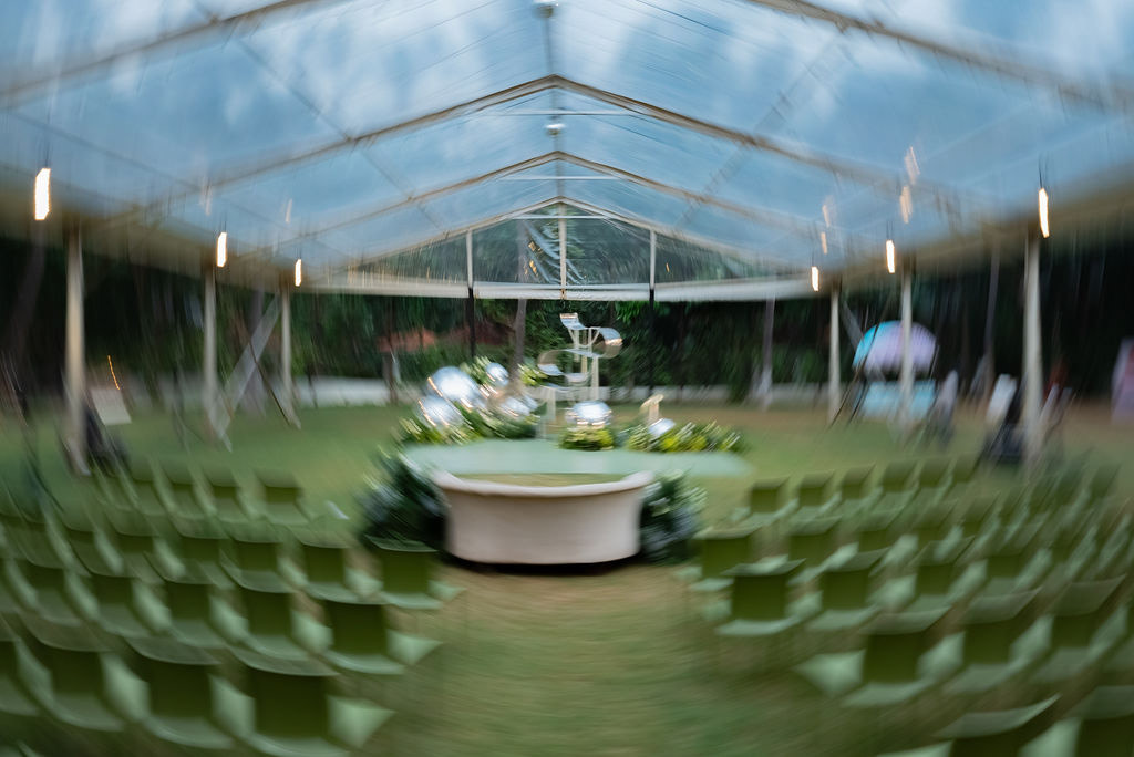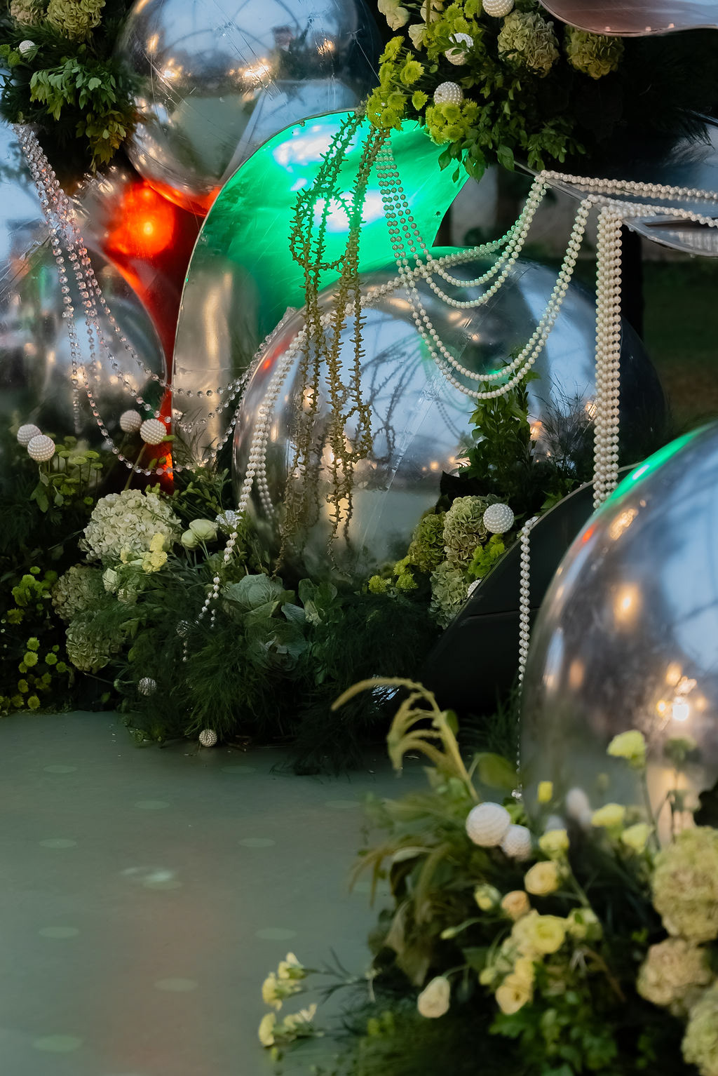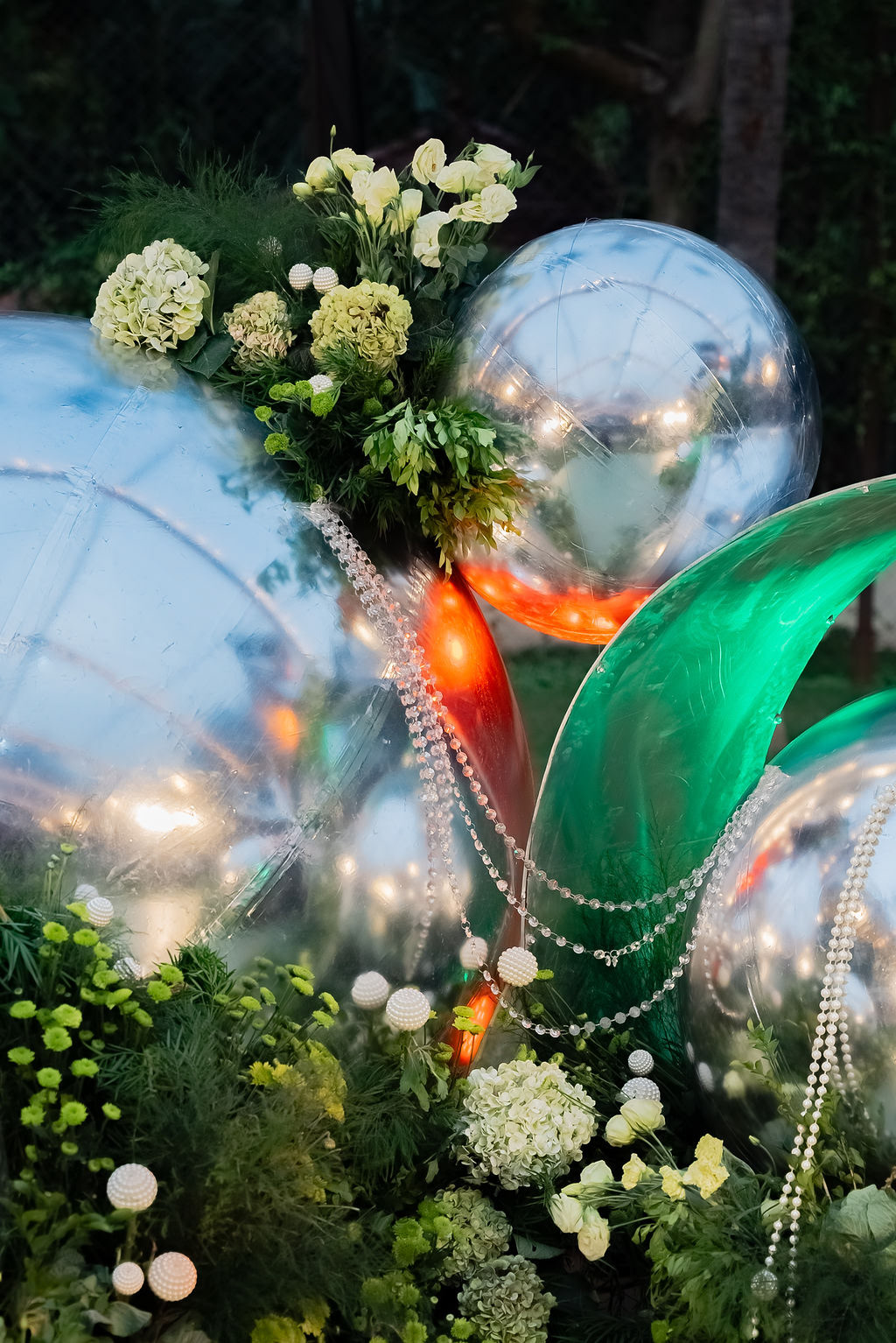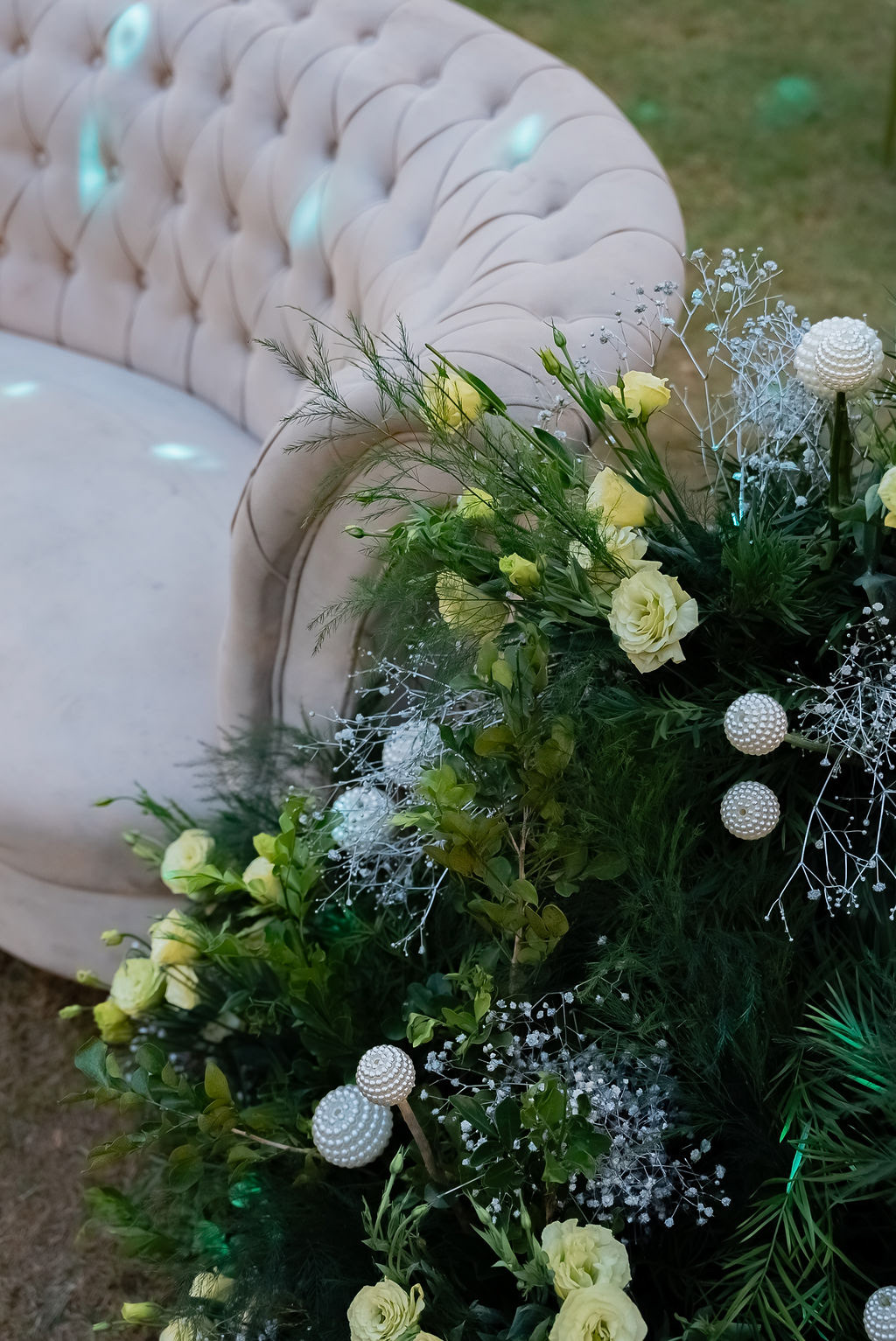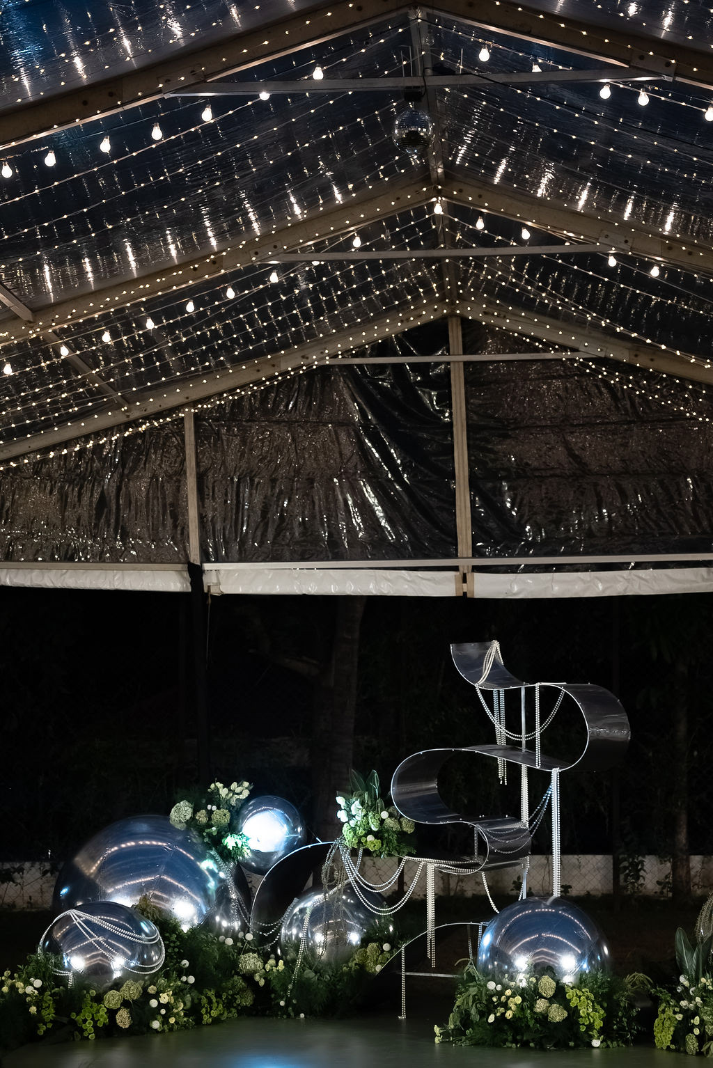 For Khanishkaa and Aadhi’s Sangeeth, we chose monotones to create a canvas that allowed the couple to truly shine. The intention was to build a backdrop that felt both subtle and striking, quietly holding space while still making a statement. Layers of green ran through the florals and the dance floor, grounding the design in the open lawn and allowing the landscape to become part of the story. Sculptural metal forms and reflective spheres introduced movement and light, catching every glow and amplifying the joy of the night. Pearl strings and crystal details were woven through the structure, adding depth, drama and a quiet richness to the backdrop. As the music played and the couple danced, the curved metallic forms and the reflective elements seemed to move with them, responding to rhythm, light and celebration. The backdrop knew when to stand out and when to soften, gently framing the couple against the green lawn, the open canopy above, and the tranquil hills beyond Coimbatore. A space designed to hold celebration without overpowering it. A canvas that let love take centre stage. Decor design by @vizhamedai Production and execution by @marriagecolours Photographed by @thealaigal Venue @mangohillcoimbatore
