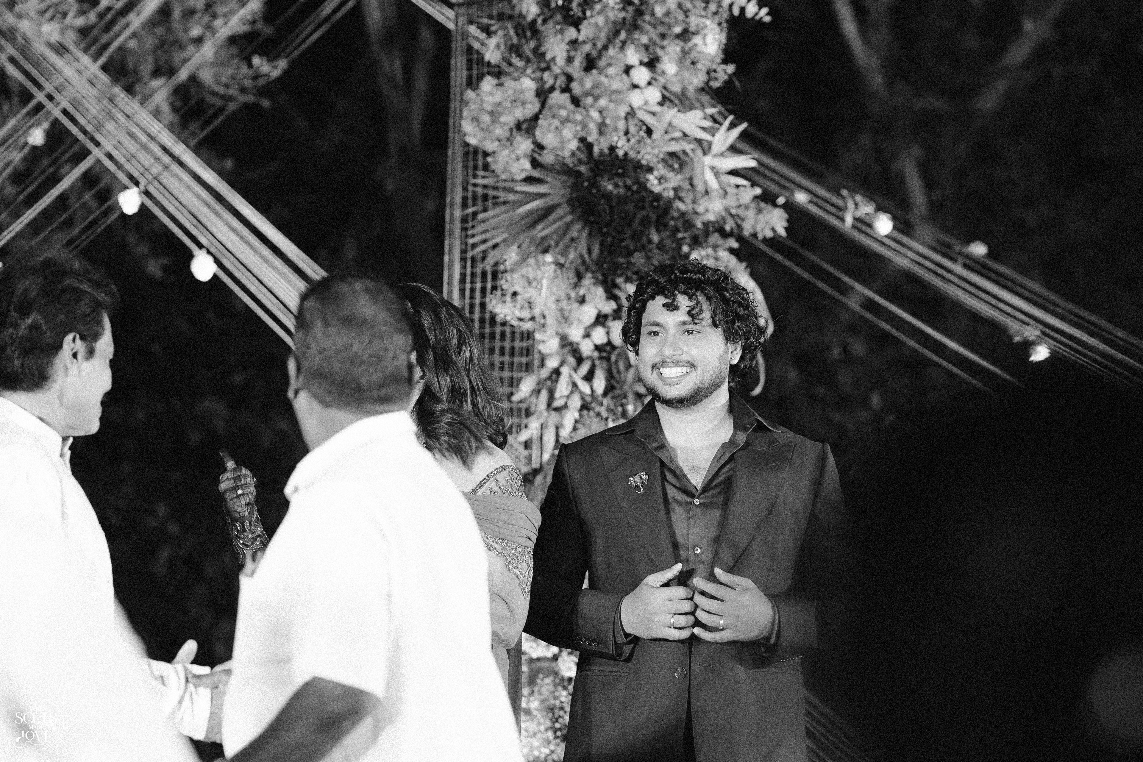 A reception décor where minimalism meets visual drama—warm rust and copper tones, illuminated by a thoughtful play of lights, creating a setting that is both refined and captivating. At the heart of it all stood a simple rustic arch, effortlessly elegant, with florals adding texture and depth to the design. Diagonal lines broke the monotony, subtly guiding the eye and adding a dynamic edge to the composition. As the lights played along these lines, they cut through the space, creating a layered visual that was both structured and surreal. The couple’s entry was nothing short of magical. With all lights cut, a single follow spot traced their graceful steps, making them appear as if they were floating towards forever—a moment of pure elegance, framed in light and emotion.