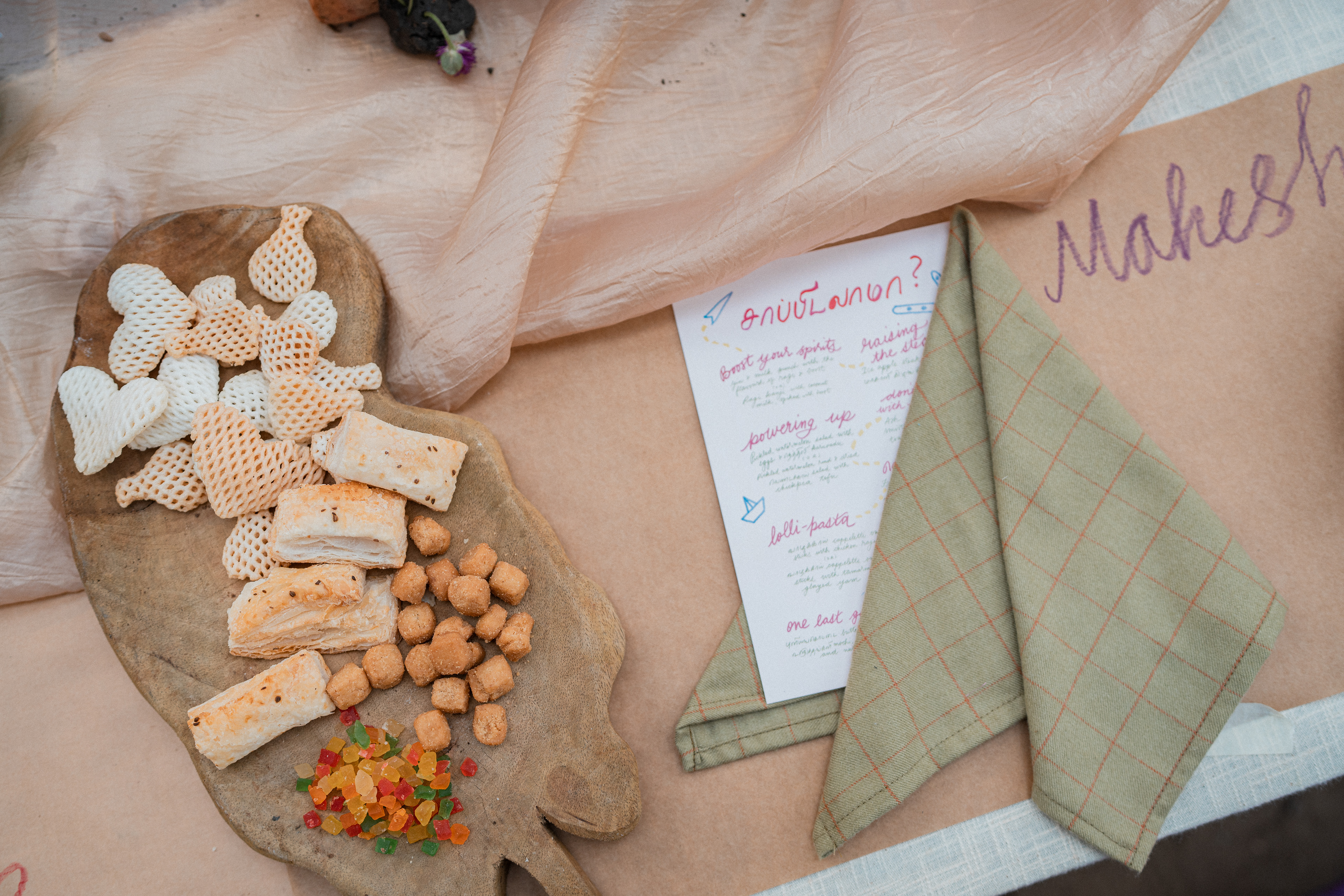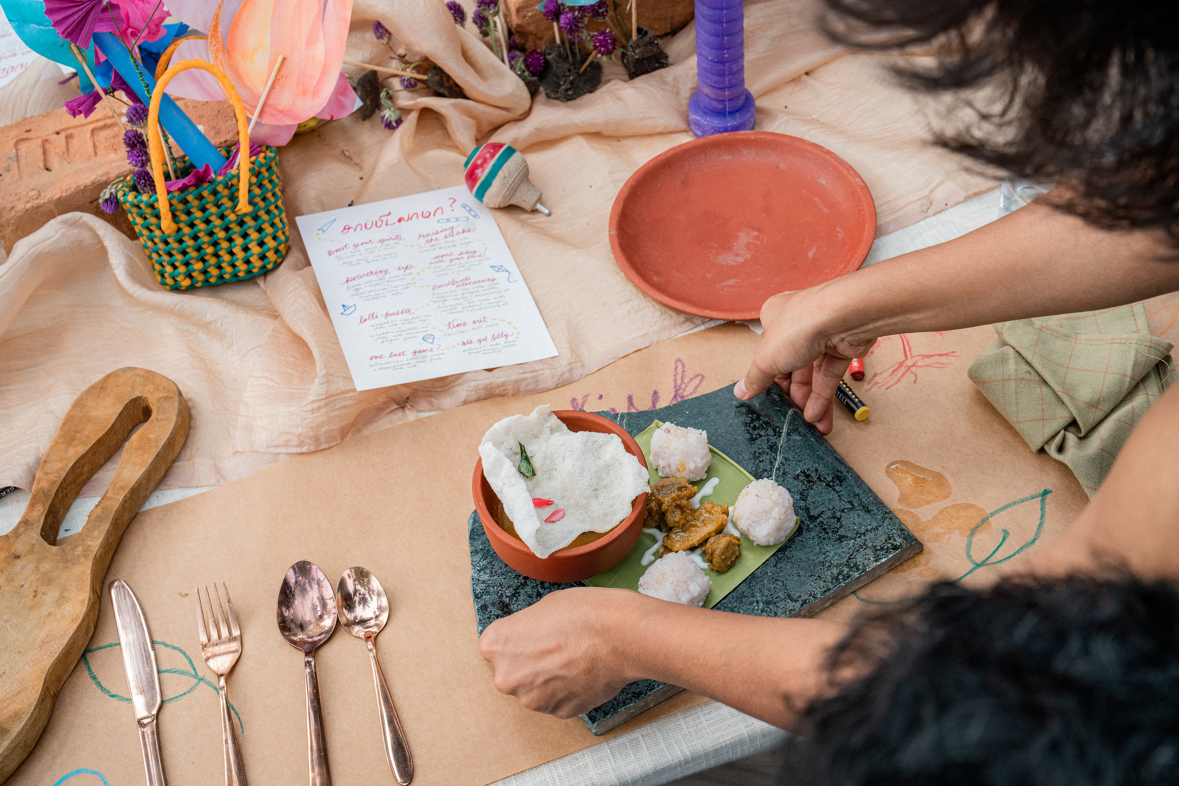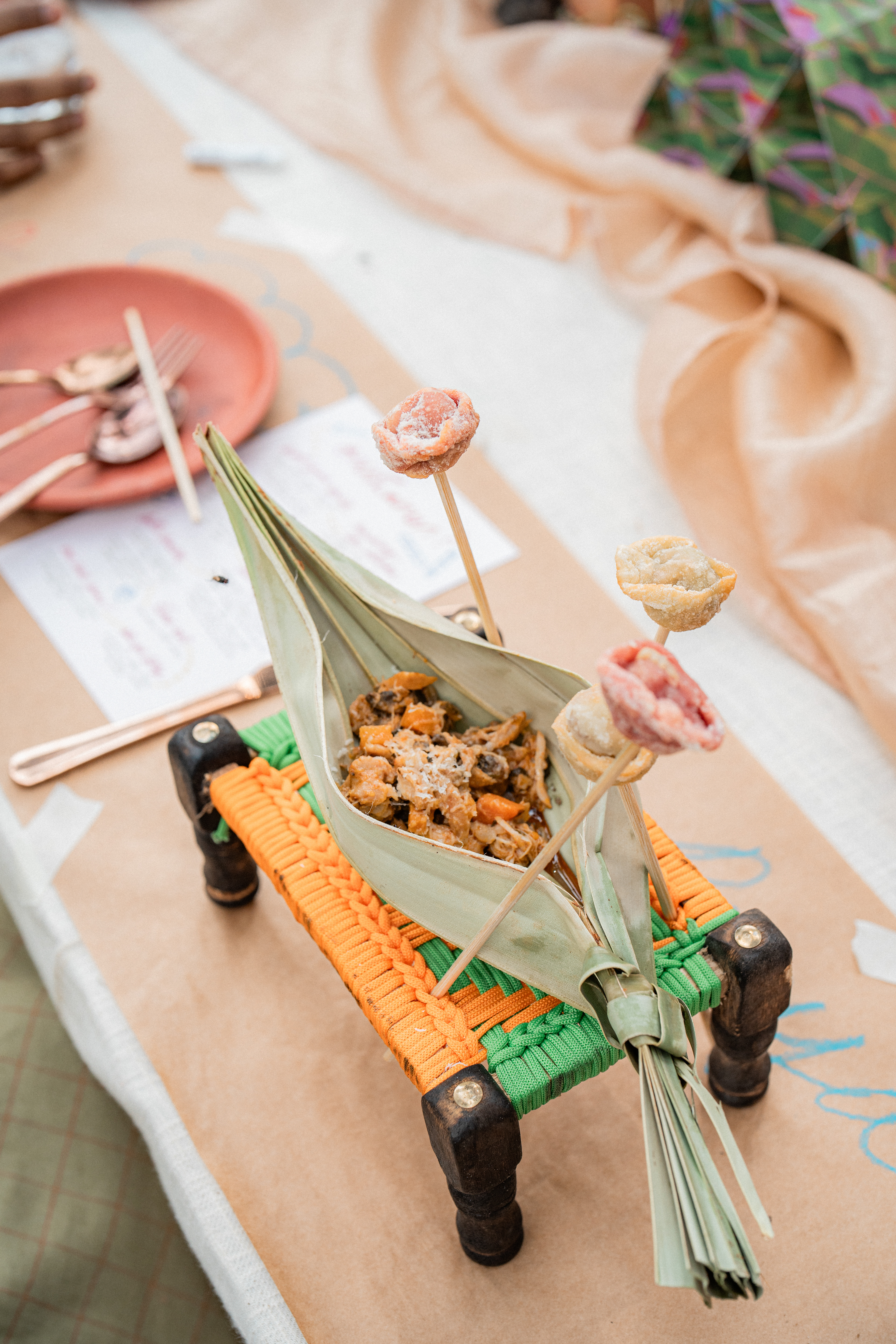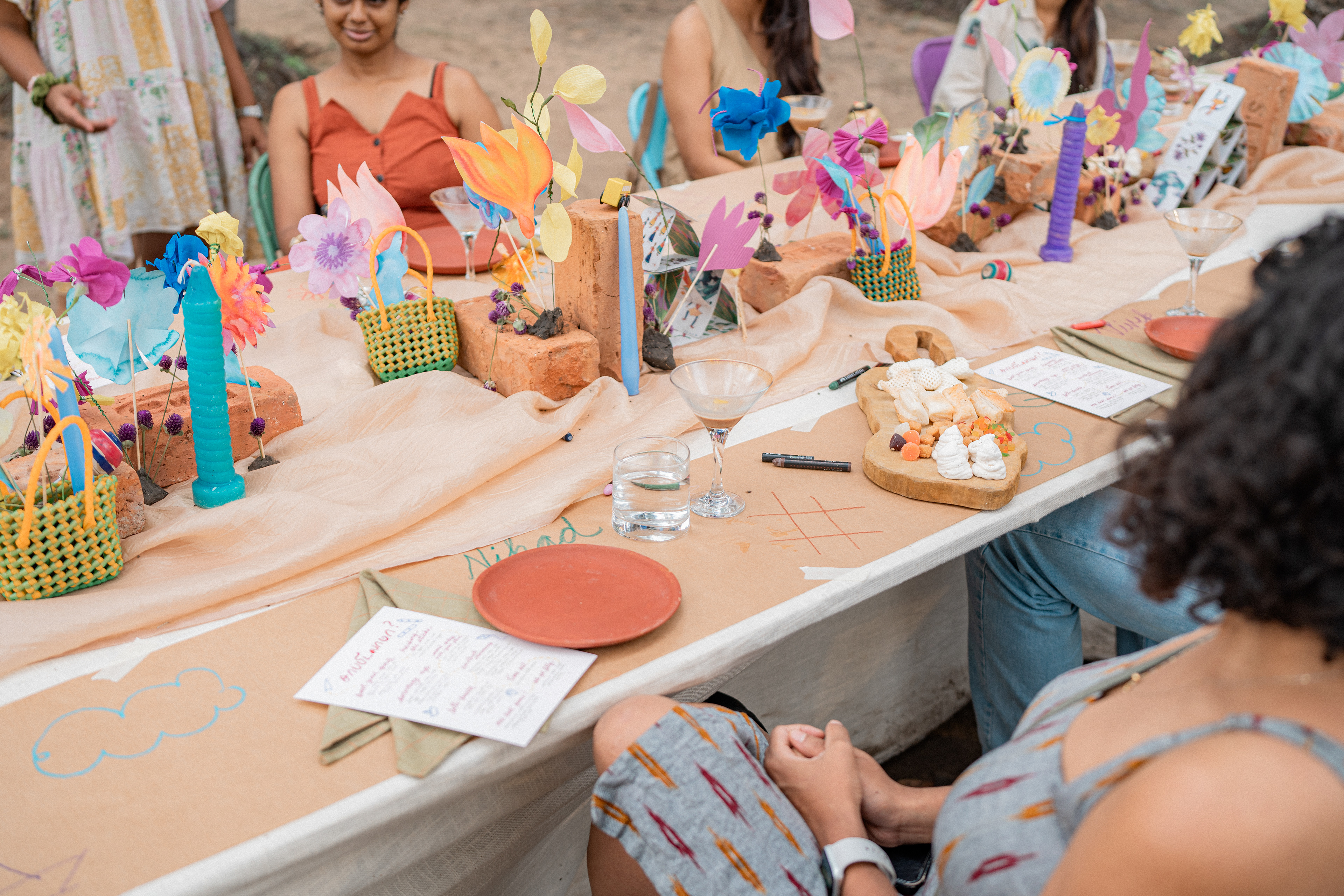 Three back to back services at Kelikkai, a curated meal pop up based on childhood games and our nostalgia around it. Every aspect of the meal came together so beautifully. Kadamba Vanam became a beautiful backdrop to the canvas we built, with a tablescape of playful elements that reminded us of childhood craftiness, bold colours and lots of playfulness. We sat together with a bunch of volunteers that were super enthusiastic to create these beautiful elements and spent an evening in creating crafty paper flowers and foliage. The menu brought together a lot of playful attempts at putting together elements that would otherwise seem very bizarre. We are incredibly grateful to the guests who were so so open to the experience that we had curated for them. Freshness Produce Partner: Madras Mandi Sponsors: Spirit of the Earth, The Perf Ice Candy and Ask for It