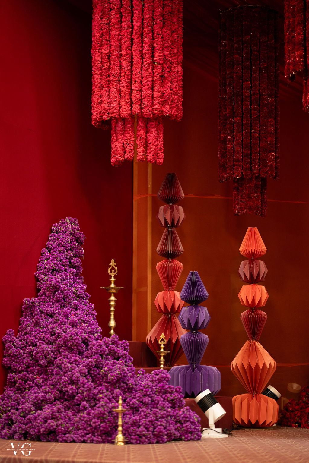 For Mahakeerthi’s மஞ்சள் நீராட்டு விழா, we aimed to create a celebratory, colorful, and playful design that captured a sense of childlike wonder. Bold colors and dramatic shapes set the stage, blending with traditional elements like keethu, local flowers, and brass lamps to build a fantastical, surreal landscape. Instead of a flat backdrop, we used angled trussing to add depth and dimension, layering the space with vibrant details that invited guests to explore every corner. Cylindrical layers of traditional flowers like vadamalli, kozhikondai, and paneer rose were creatively paired with sleek origami props by Frigamiart Floftstudio , an unexpected combination that added to the whimsical atmosphere. Our goal was to create a wonderland, and it quickly became one of our favorite setups to date!