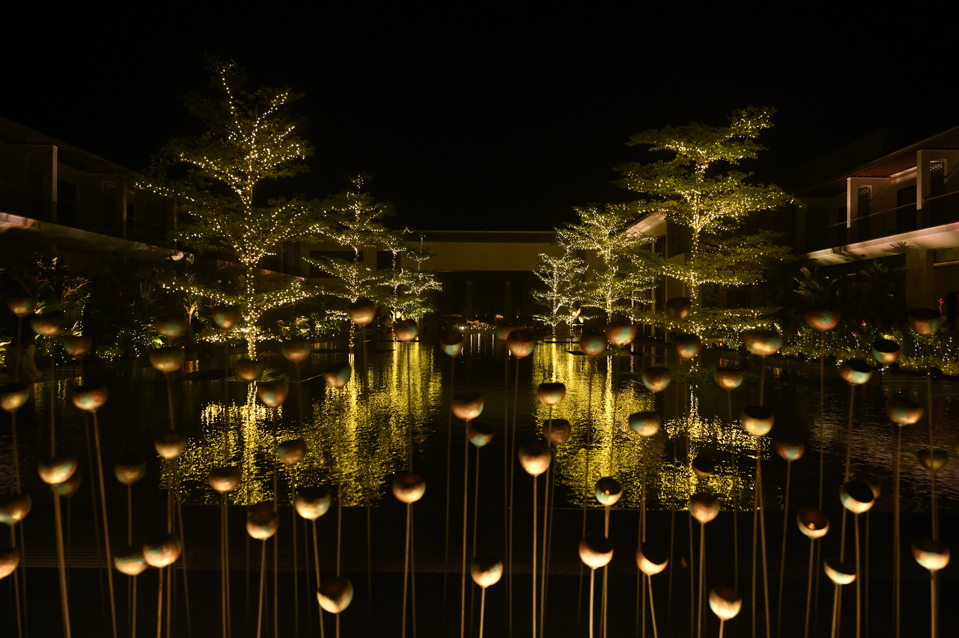 Rasika and Vignesh’s wedding was designed with the concept of Neithal; a dreamy, contemporary reimagination. This was one of the most challenging but exciting designs we’ve worked on. Inspired by the movement of waves, since it was a the canopy was made up of thirty pieces of differently sized organza fabric, each of them cut and sewn to size. The minimalist backdrop consisted of strings of jasmine, with kozhi kondai accents and bunches of salangai, that made a tinkling sound when moving in the breeze.